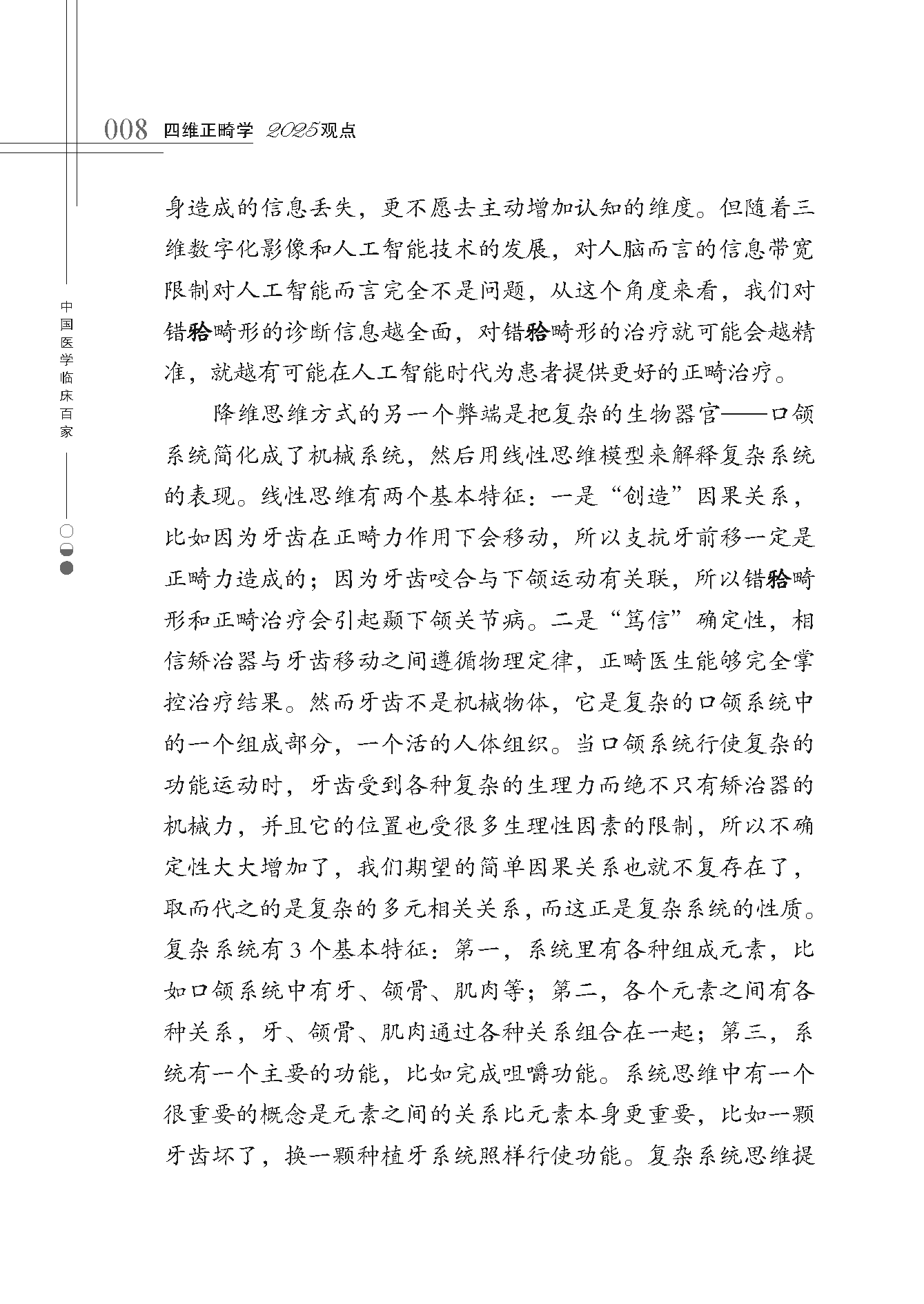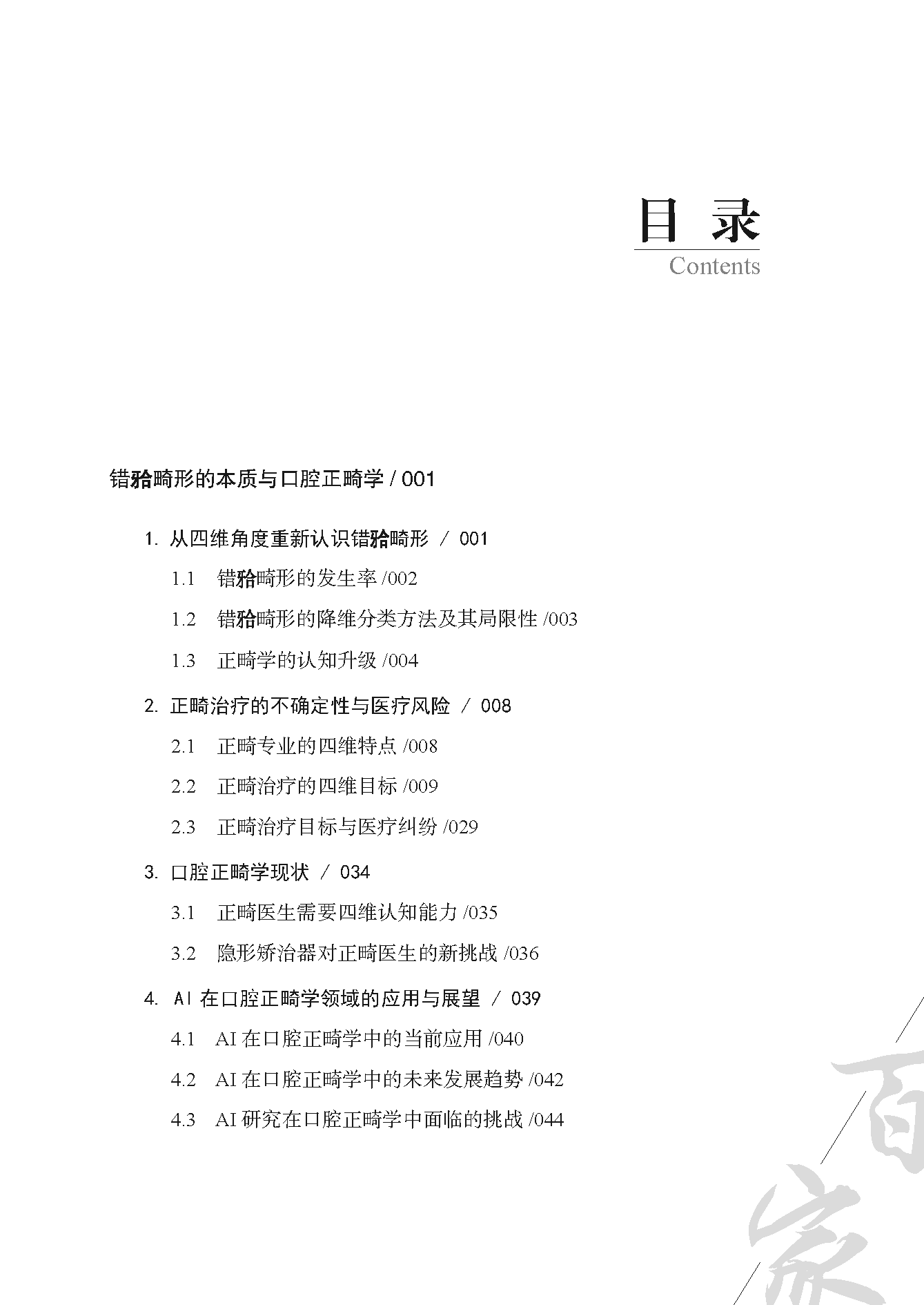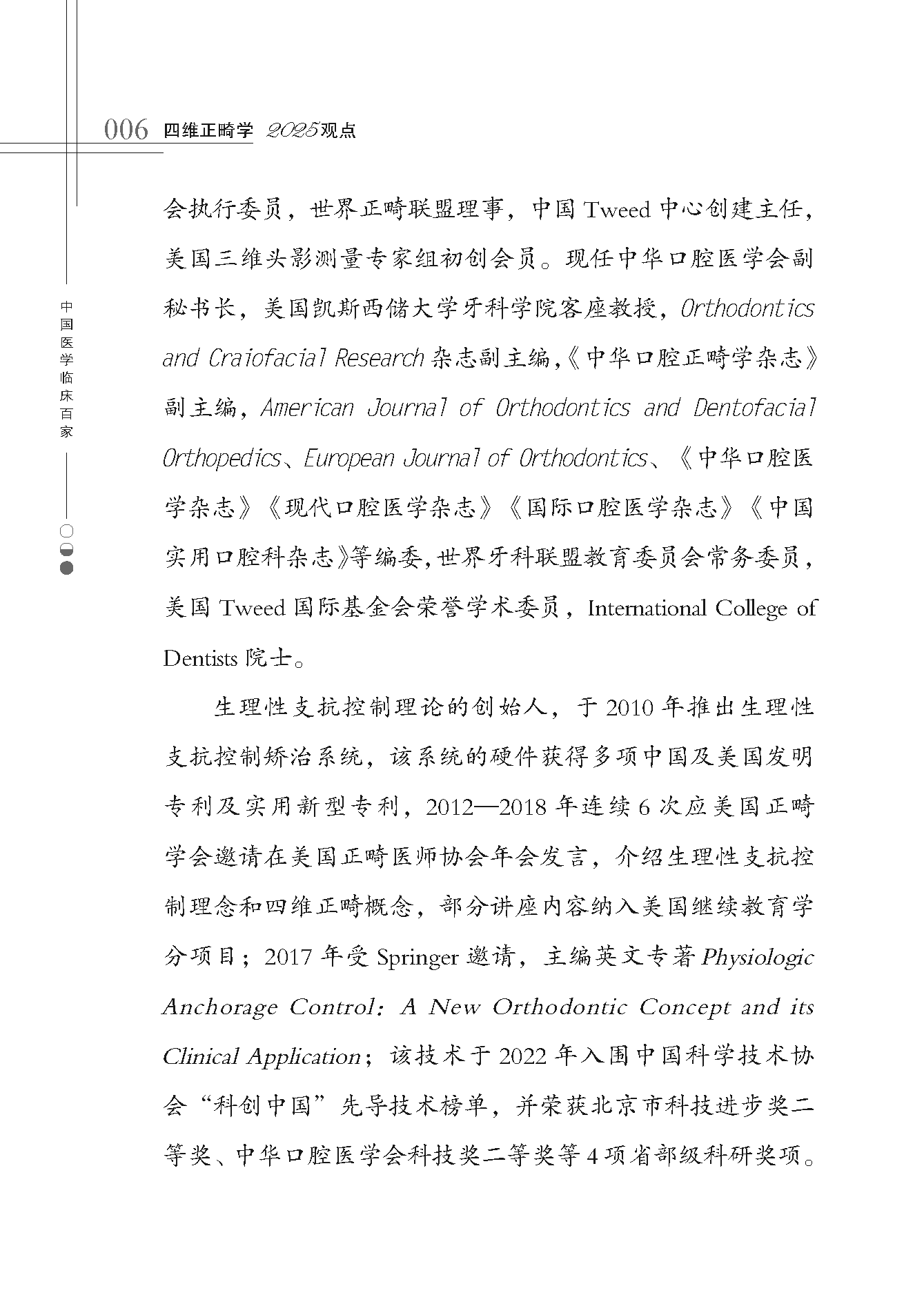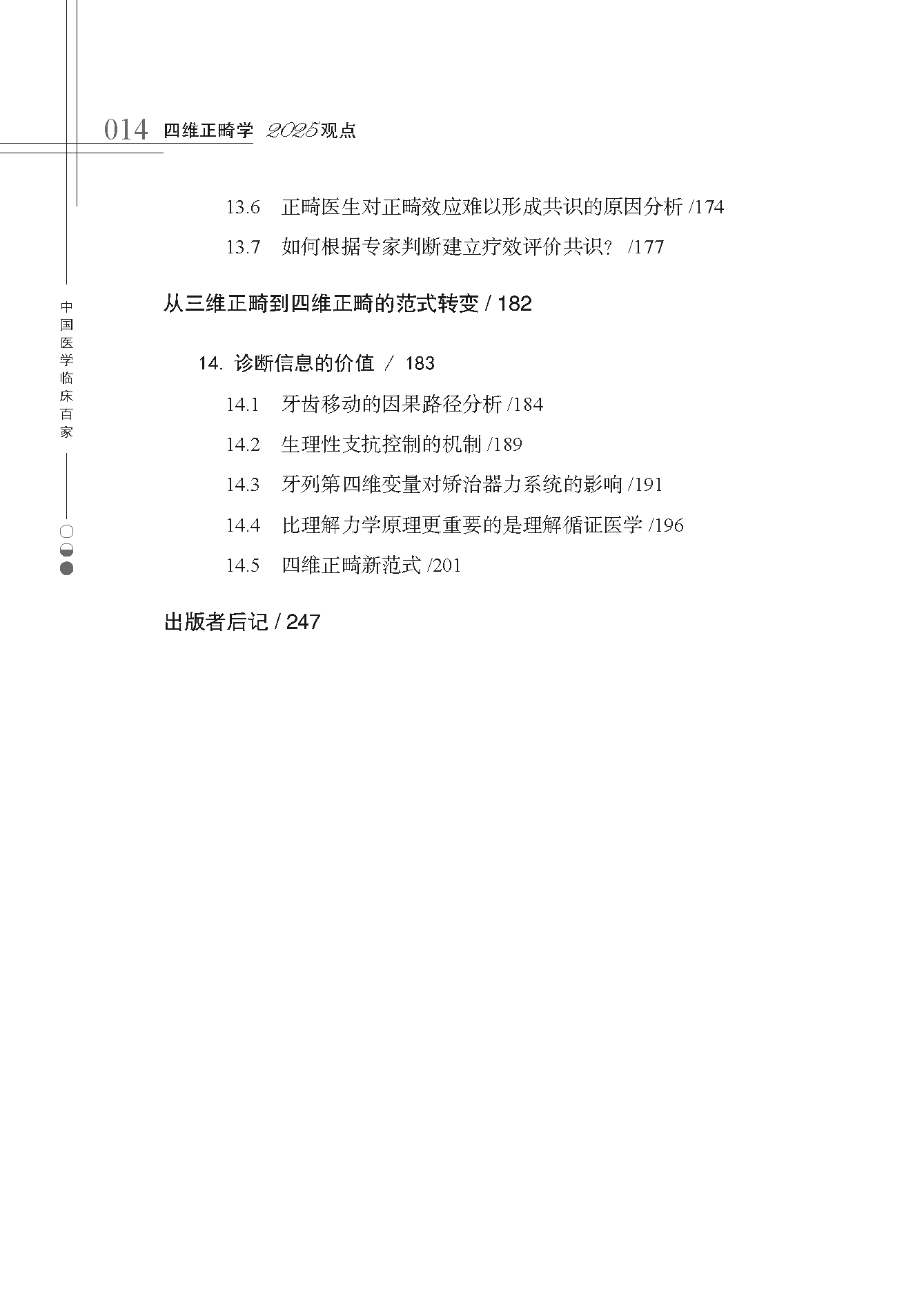 《四维正畸学许天民 2025观点》是正畸学领域的前沿著作。本书深入探讨了四维正畸学这一创新性理念,在传统三维空间矫正的基础上,融入时间维度,强调正畸治疗全程的动态变化与精细把控。书中详细阐述了从患者的诊断评估开始,运用先进的数字化技术进行精准分析,涵盖口腔颌面部结构在不同生长发育阶段的特征。在治疗方案制定方面,不仅介绍各类经典正畸技术,更着重展示新型矫治器的应用及多学科联合治疗策略。同时,通过大量丰富且典型的临床案例,生动呈现四维正畸学在实际应用中的效果与优势,包括对各类错颌畸形的有效矫治,以及对患者面部美观和口腔功能的全面改善。