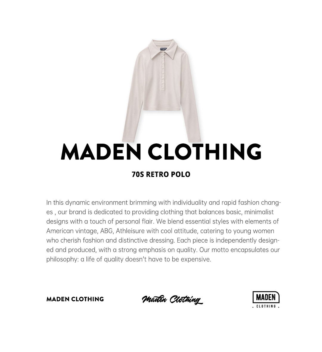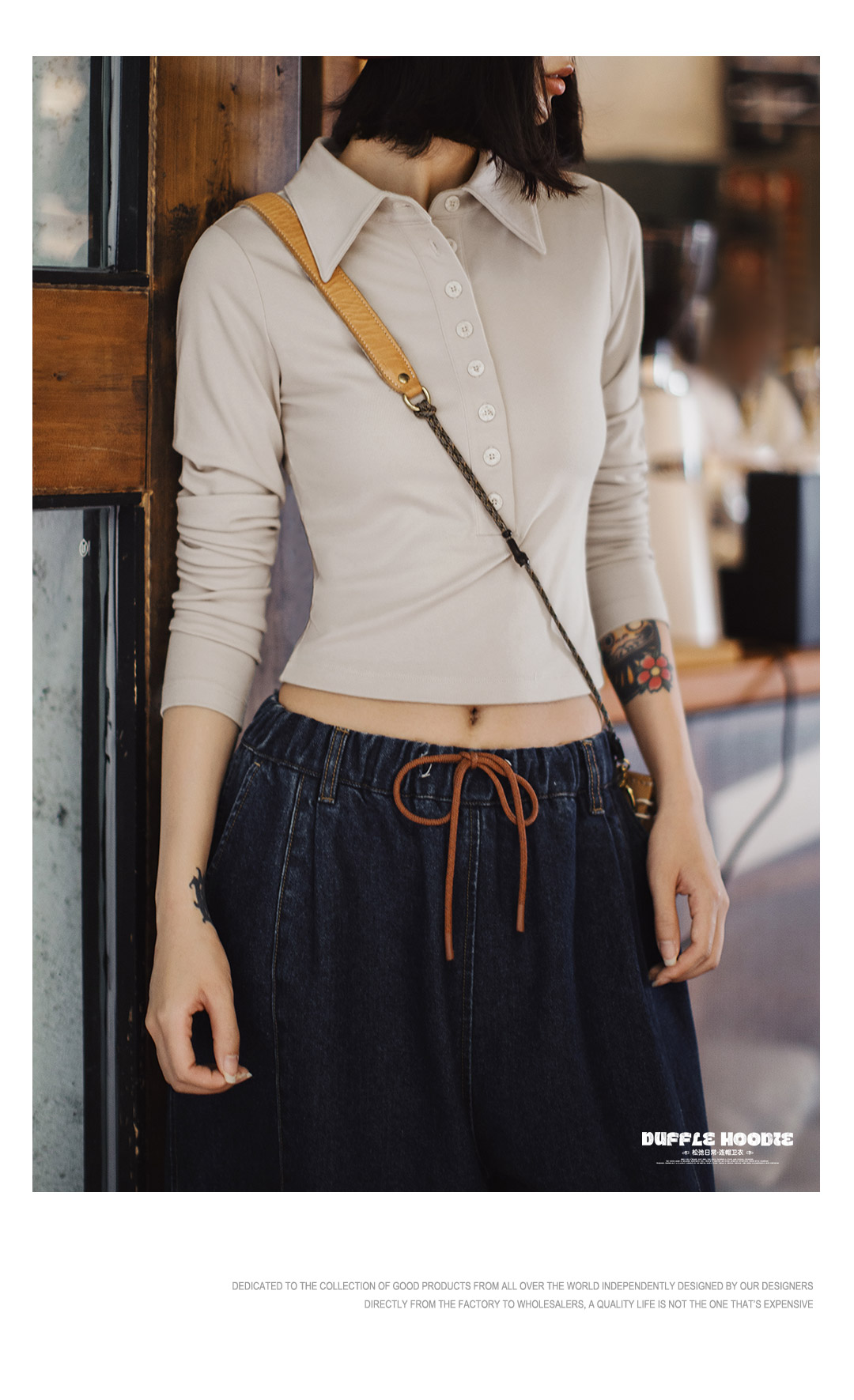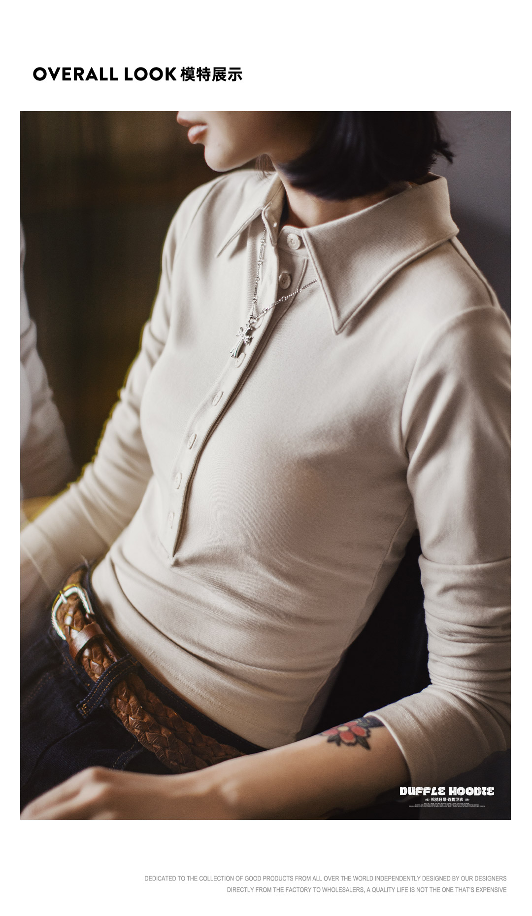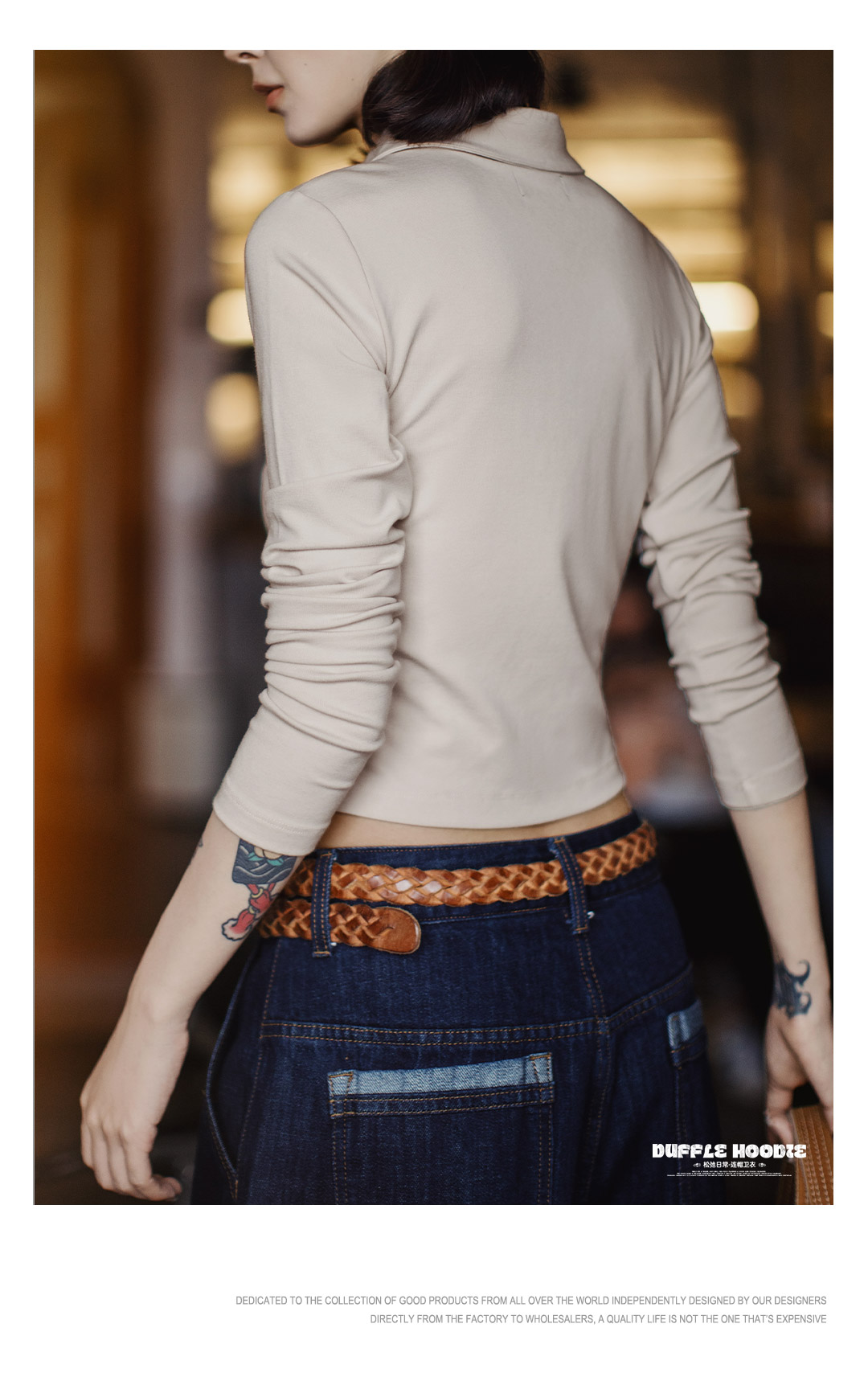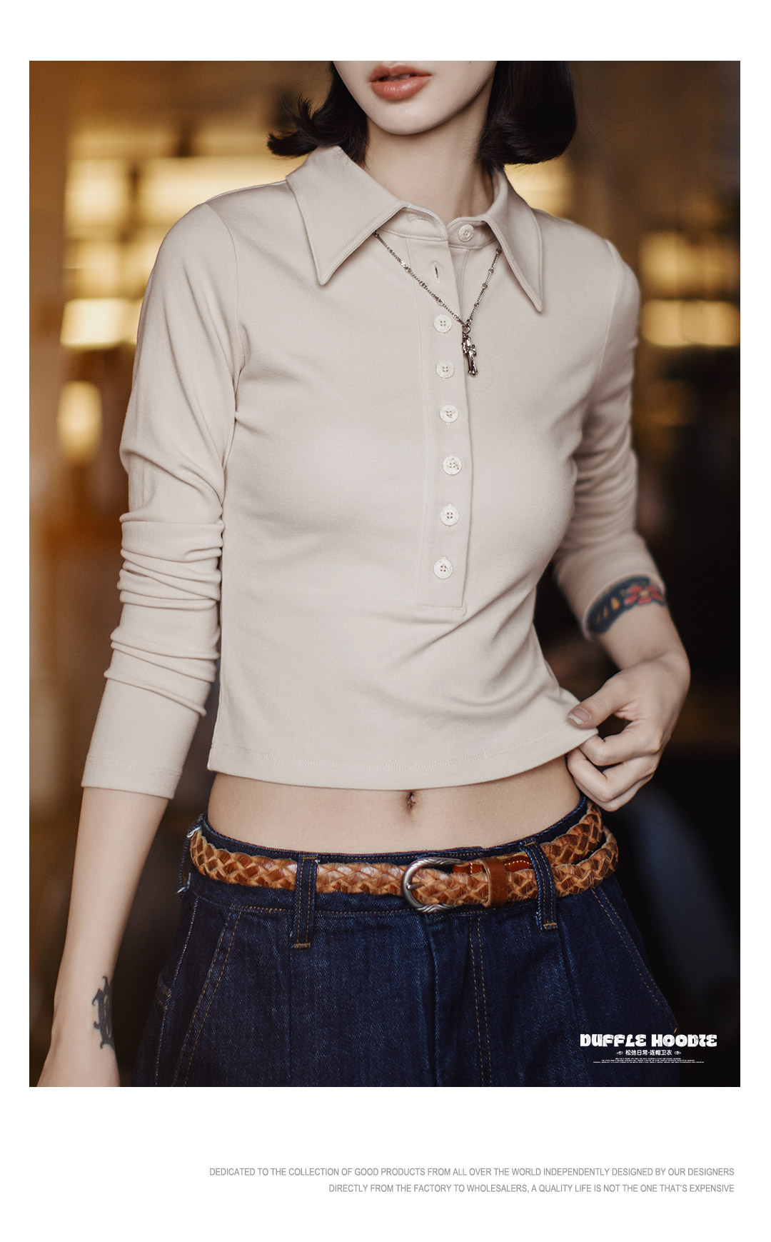 马登杏色翻领正肩长袖T恤短款修身上衣套头针织内搭打底衫女士秋