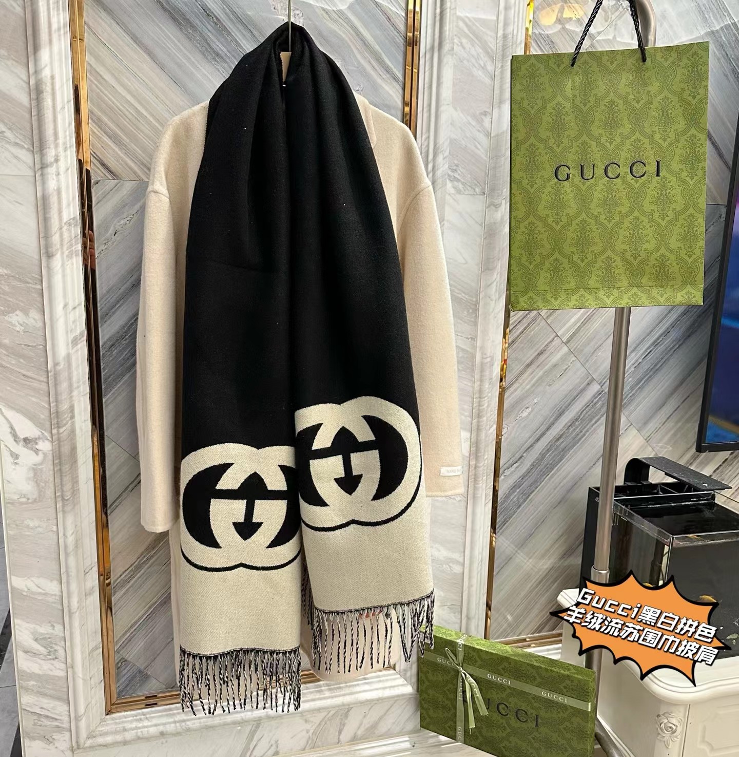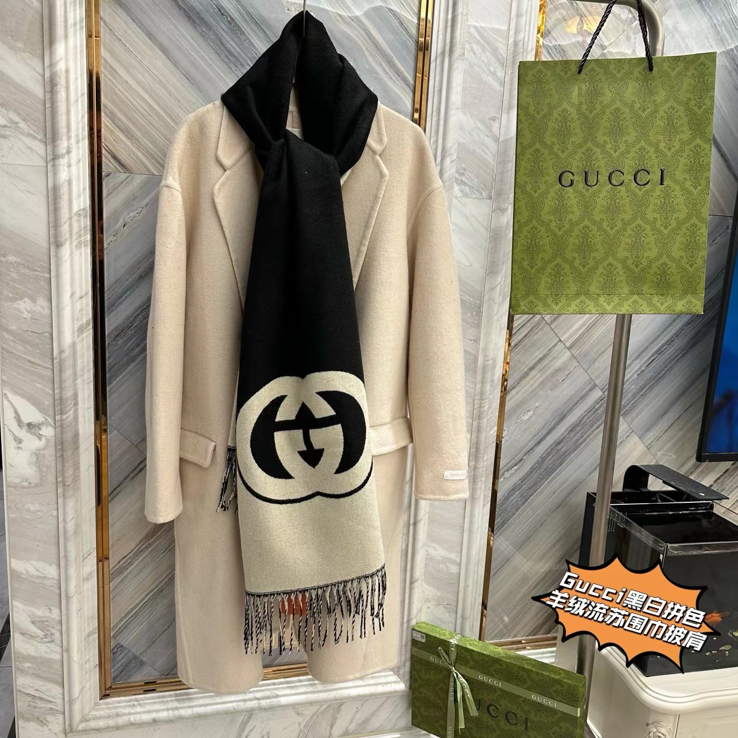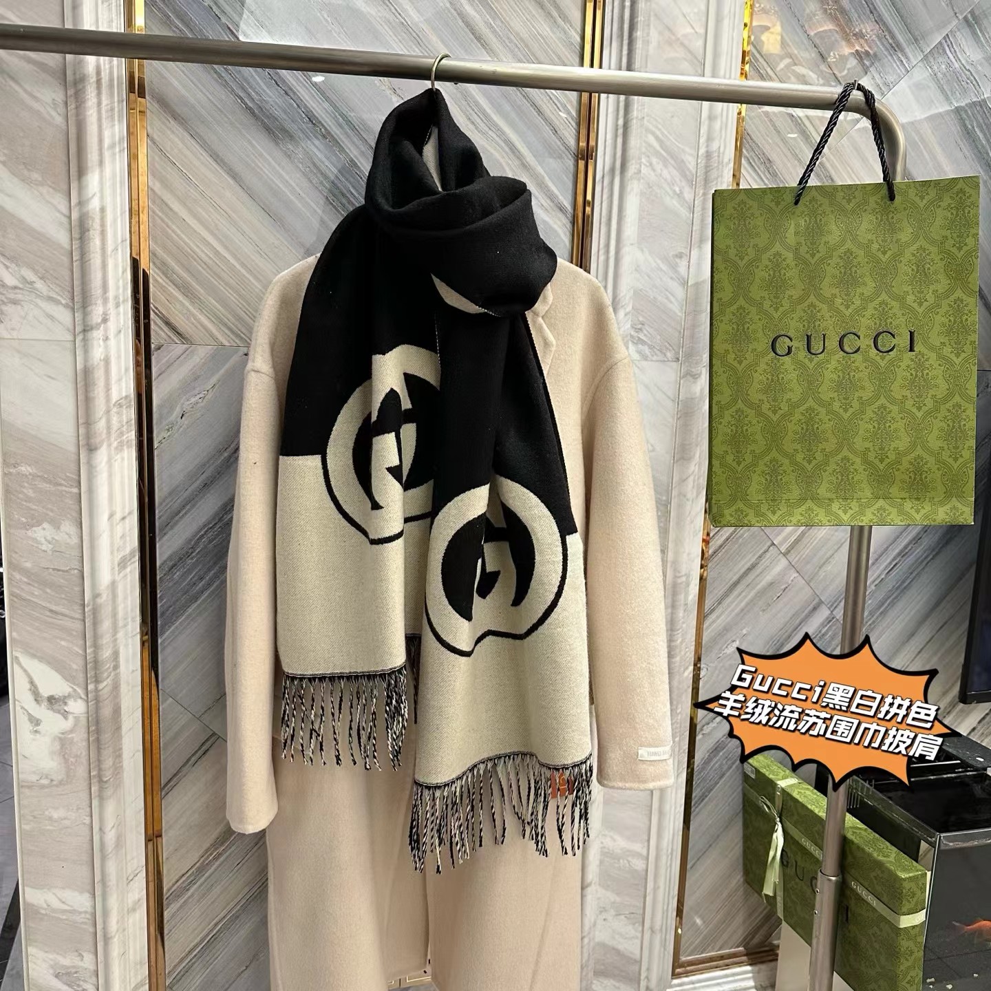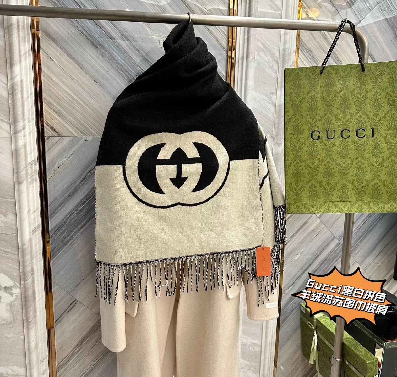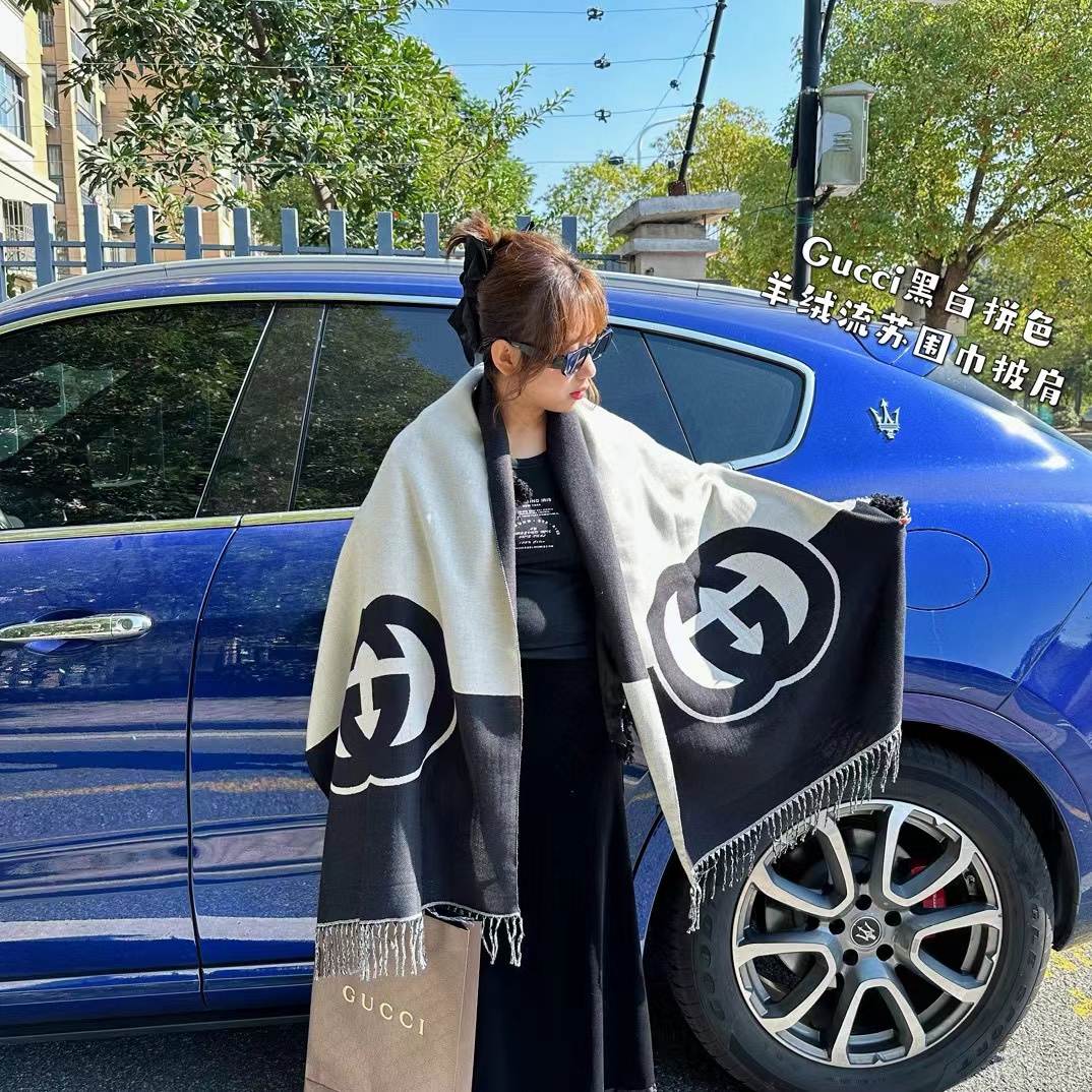 我包容你的‘围’所欲‘围’,你懂我的‘围’情所困,因‘围’有你,‘巾’生相守,彻底爆了,【双G重叠黑白拼色羊绒流苏围巾披肩】礼盒独立包装,双面双色,一条两用!尺寸45x210(cm),!抢到就是赚到!彻底爆啦!多功能使用!既是围巾也是披肩!这种年年脱销。毕竟一条可以当两条使用!手感软糯,超棒!尼泊尔羊绒,蓬松软糯轻盈!围起来炒鸡有型,爱不释手的超强体验感!不只是颜值美到爆,内涵无穷!区别市面千篇一律的低版本,仁者见仁,智者见智,兄弟姐妹们认准掌柜家的牛货,就是糕端!莼实拍,不好包退包换,随意对比,用心种草!炒鸡好看!怎么搭配都很有味道!复古时髦感!面料很垂!上身舒服!上身真的太惊 艳了!看着就很贵!小姐姐上身美到飞起,正儿八经的时尚圈宠儿!自用送人都非常体面!伴手好礼,十来盒,洒洒水就抢完了!逆T了!闭眼抢!