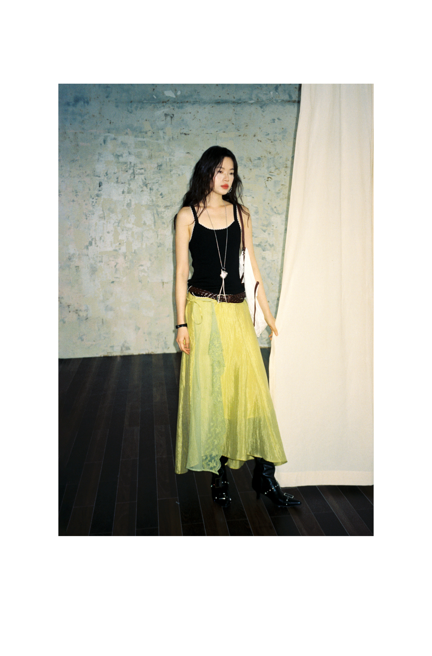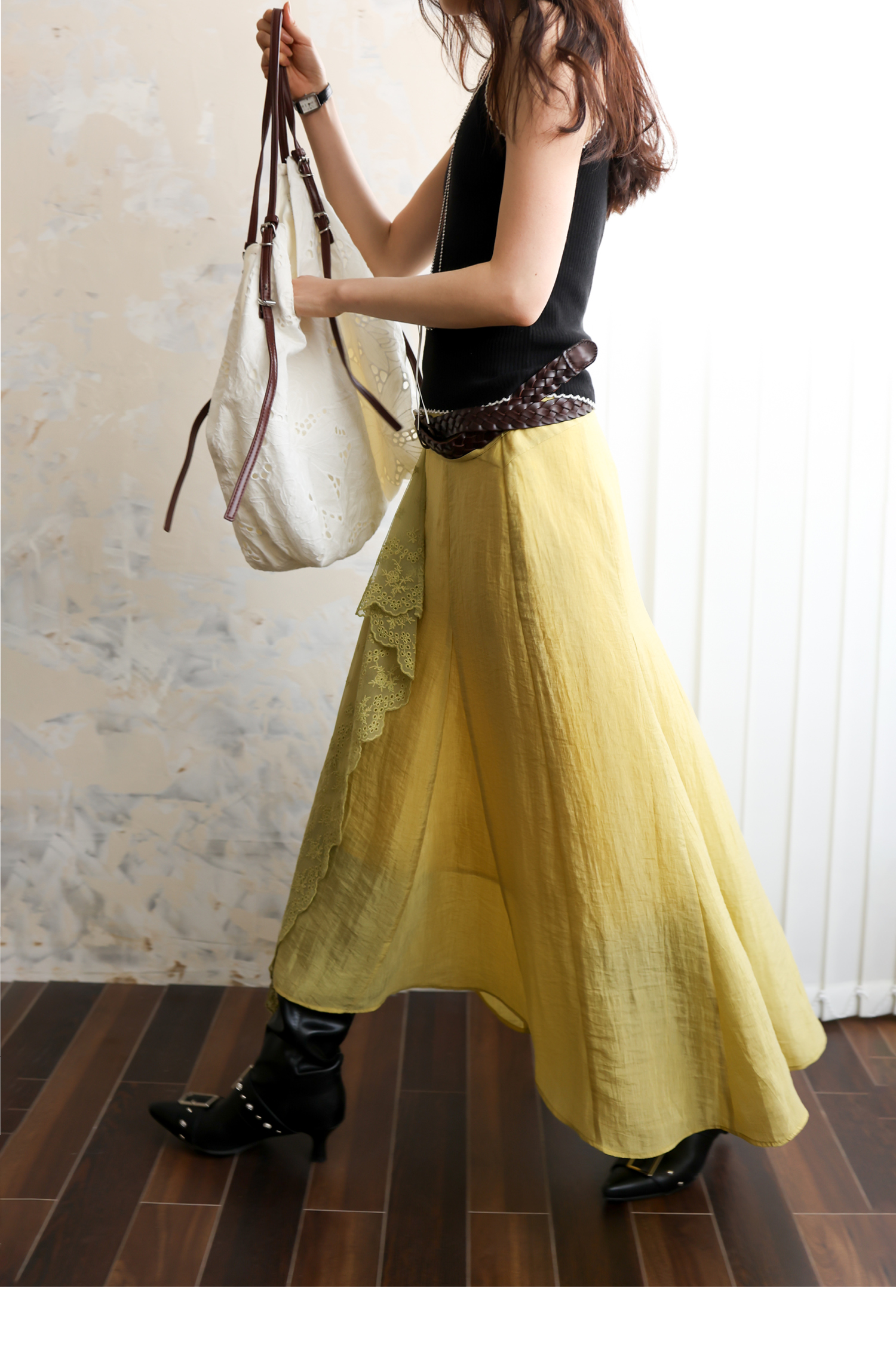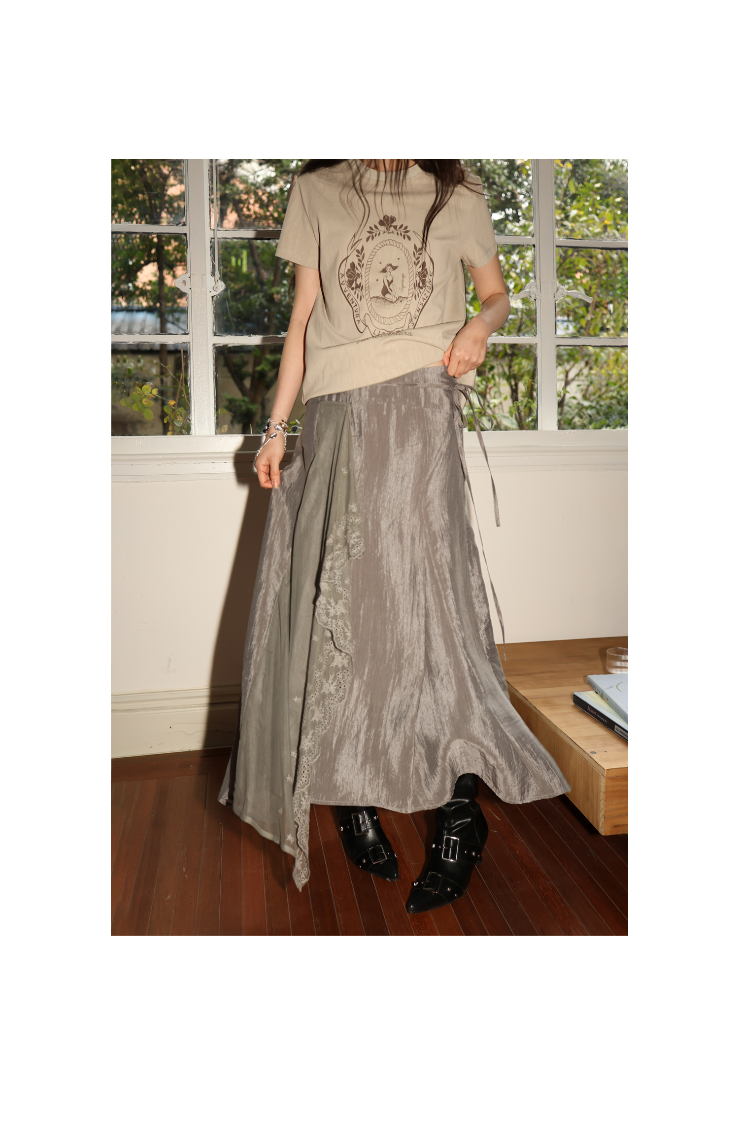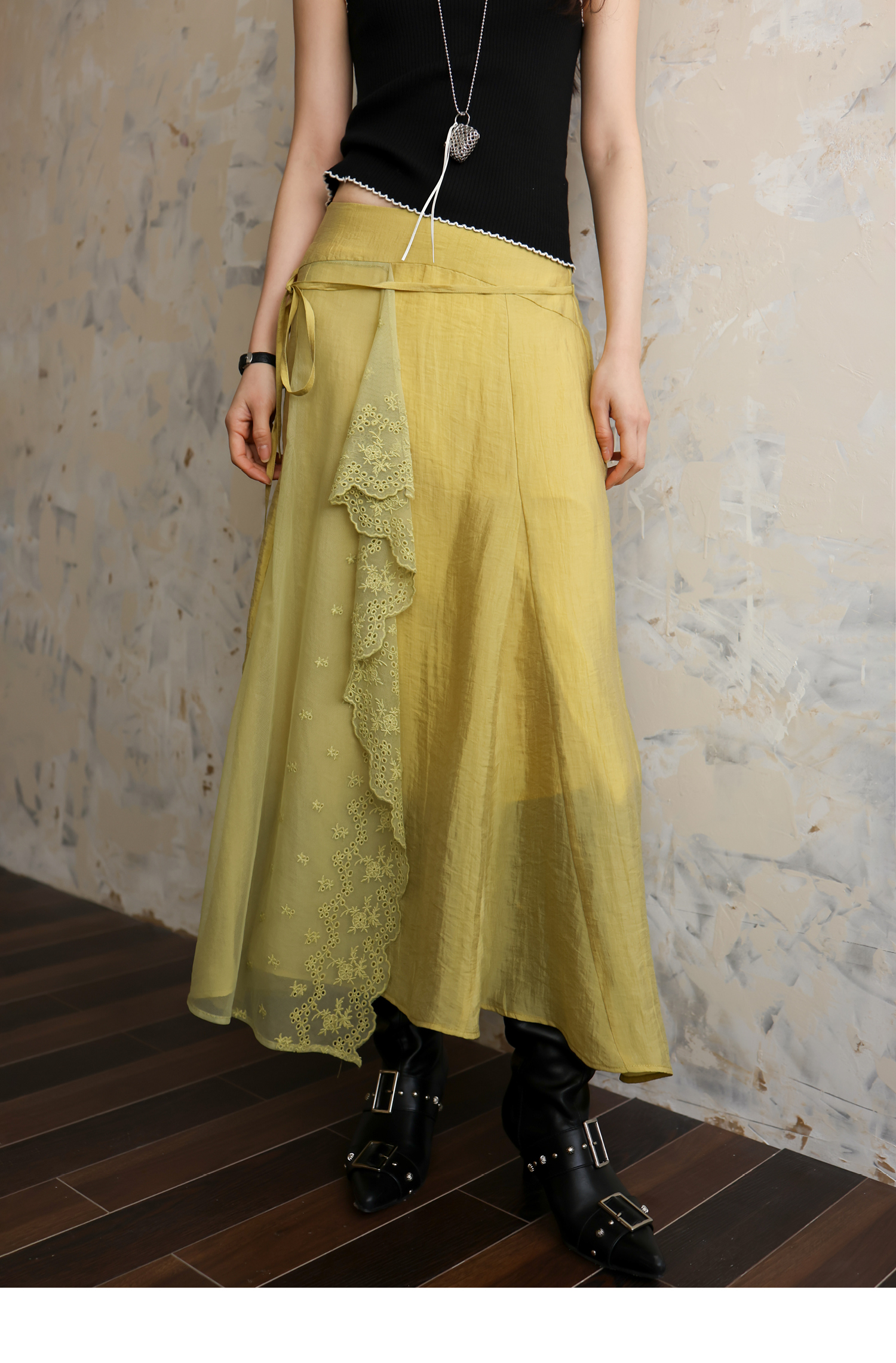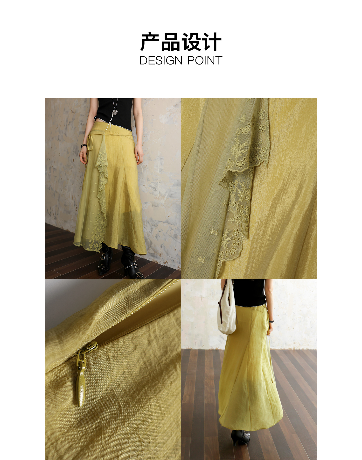 SUPERSCAPE素舶 春夏珠光皱感蕾丝拼接插片设计感长半裙