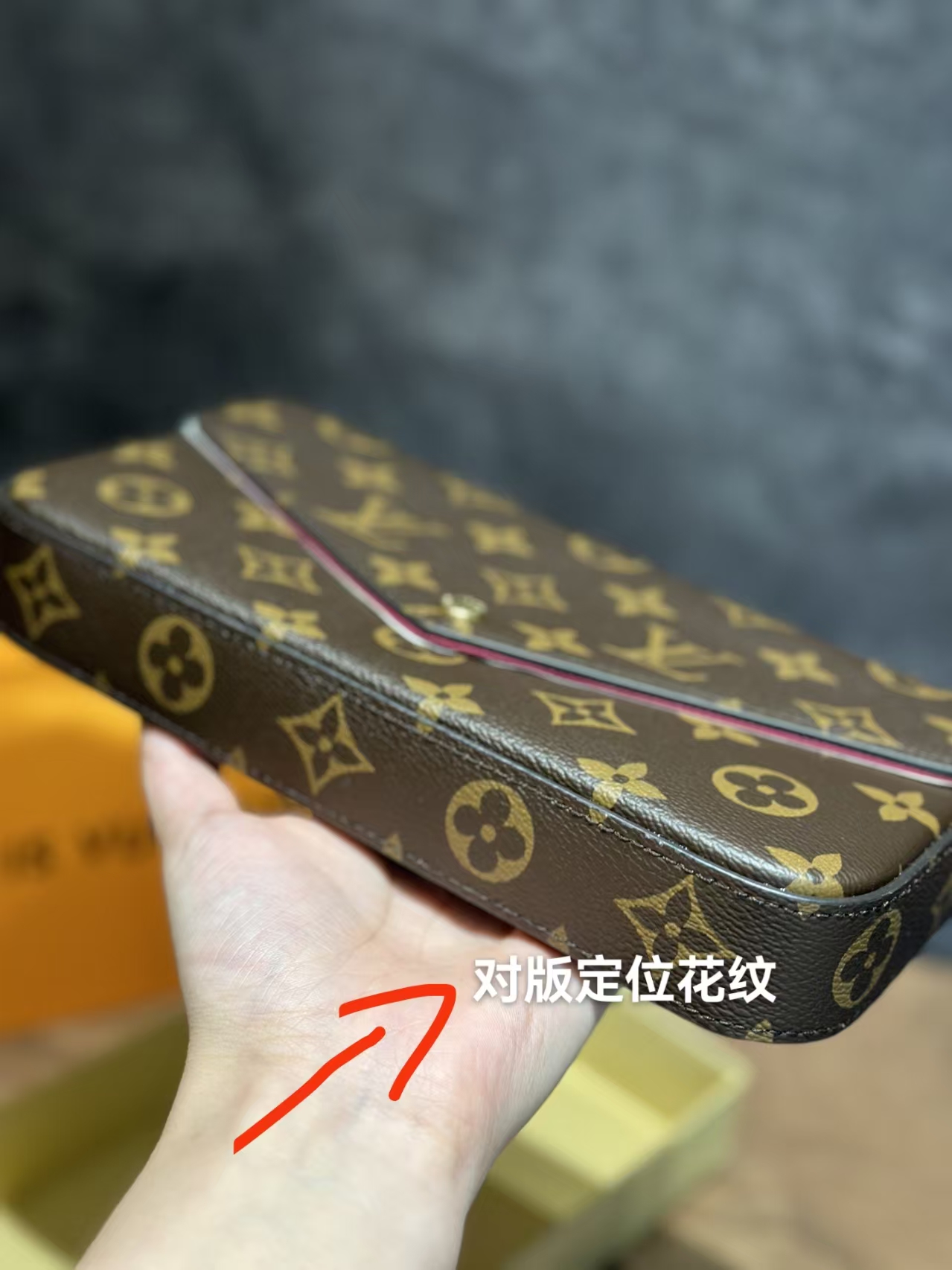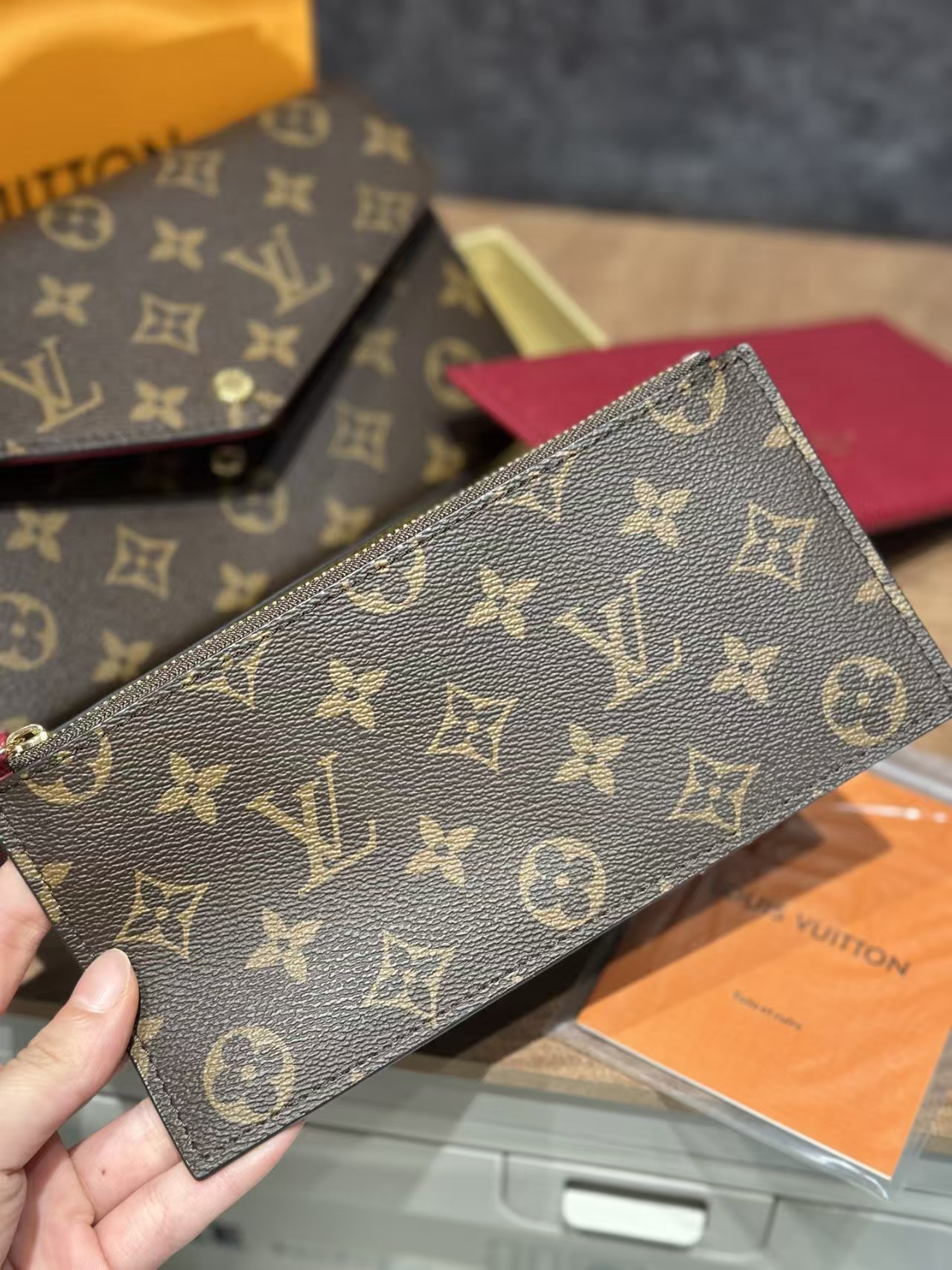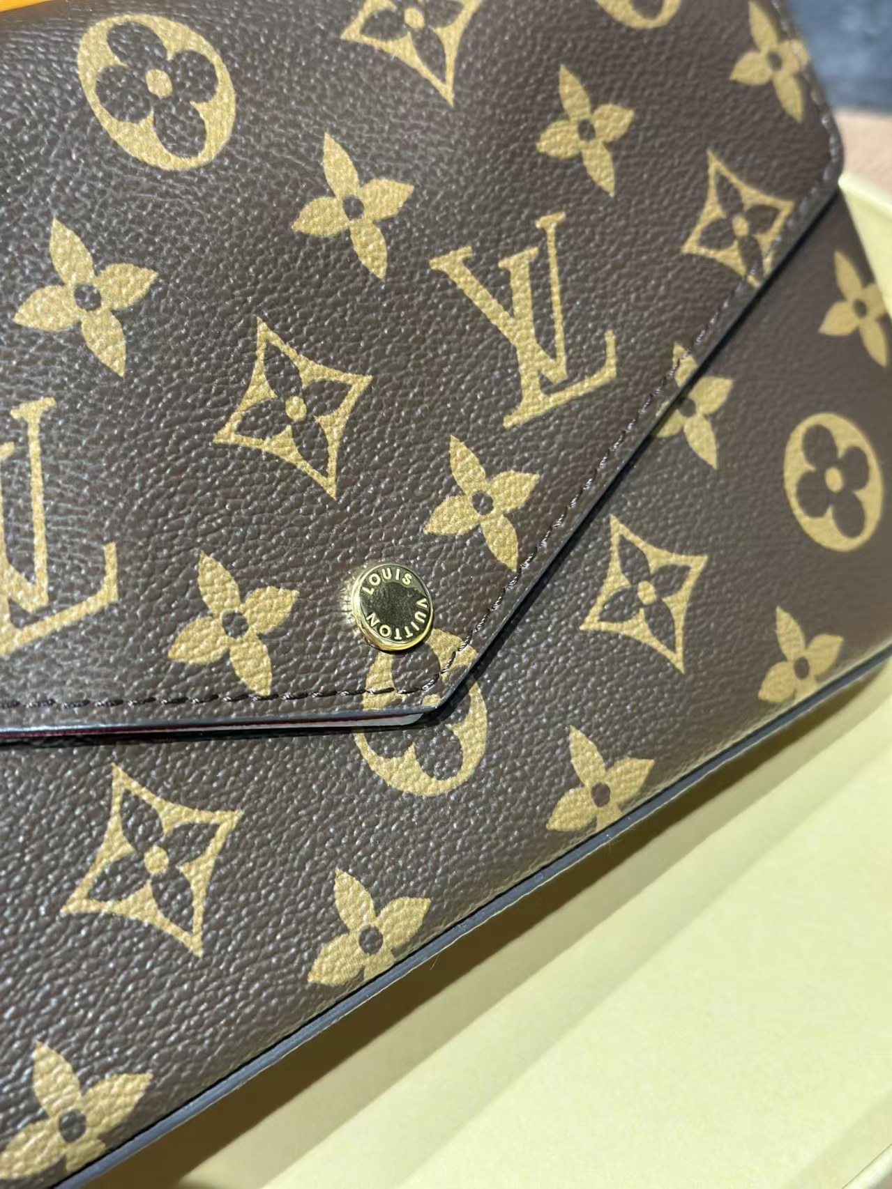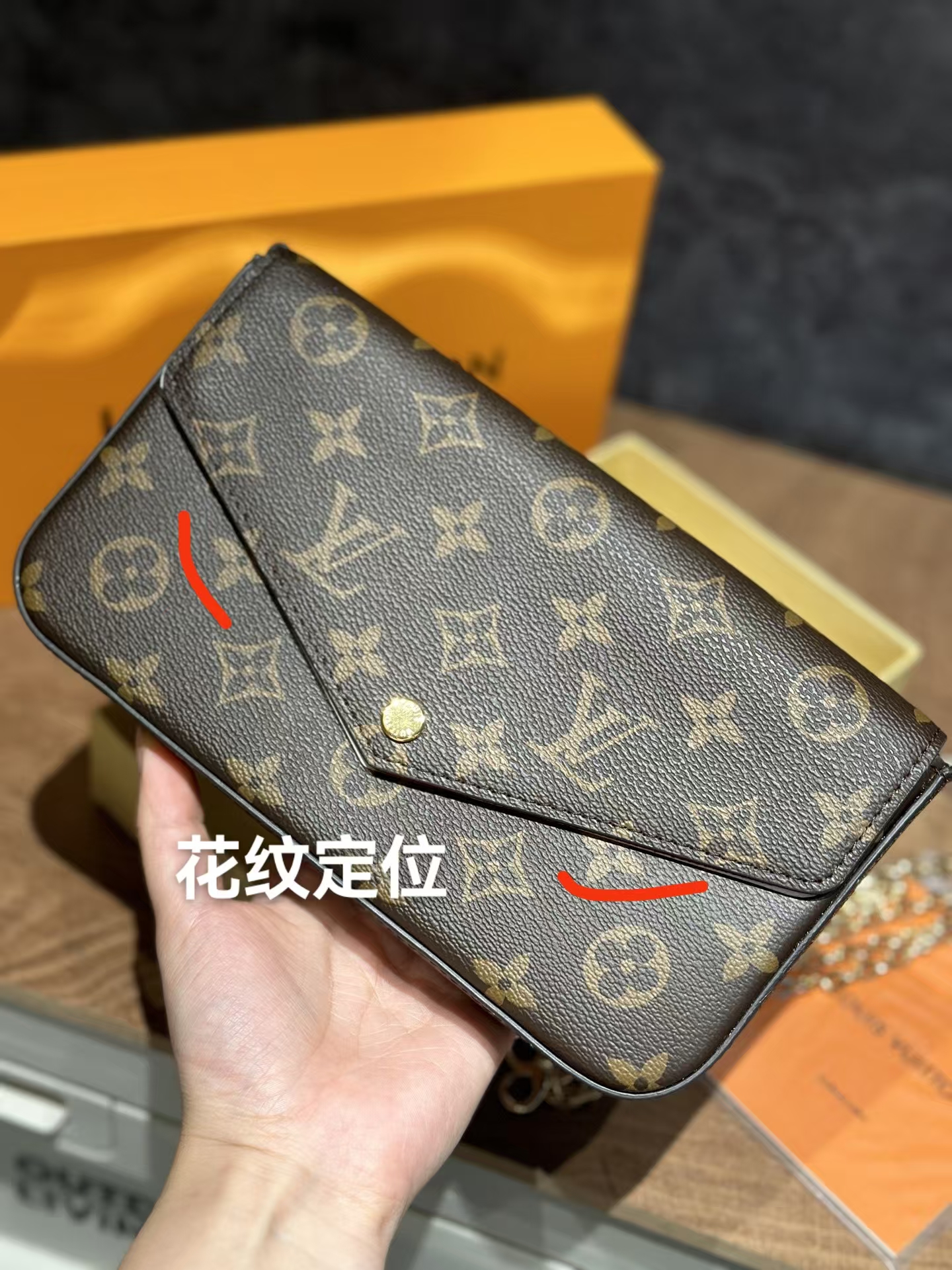 经典的老花皮质,耐磨耐刮,小巧精致的信封式包身设计。