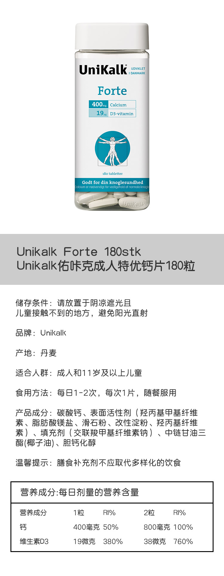 [保税区]Unikalk佑咔克成人特优钙片180粒. Unikalk Forte 180stk.