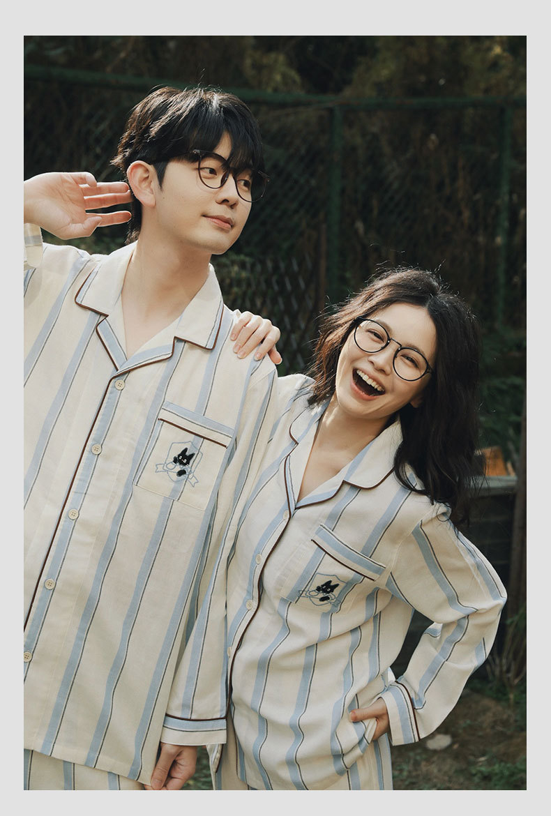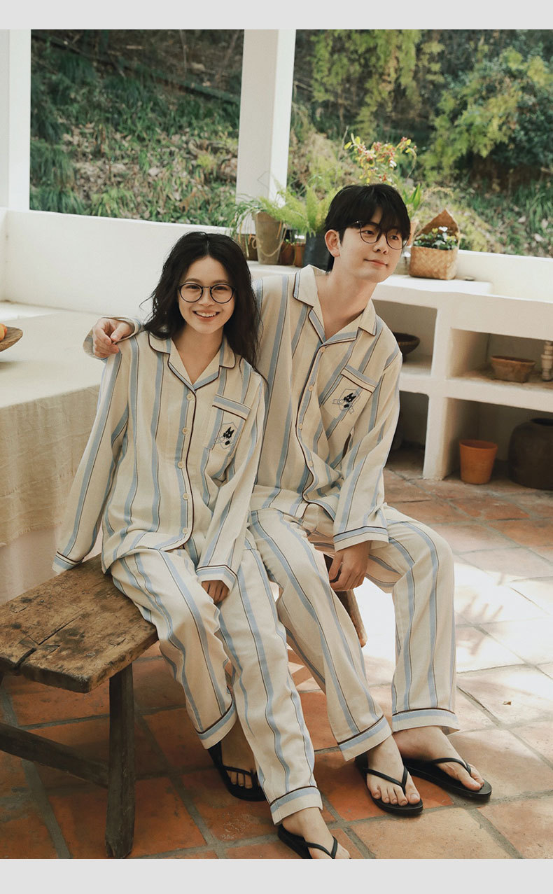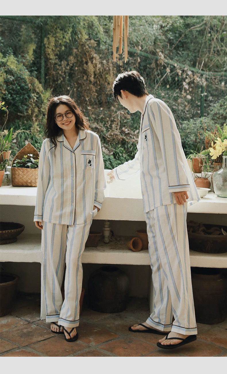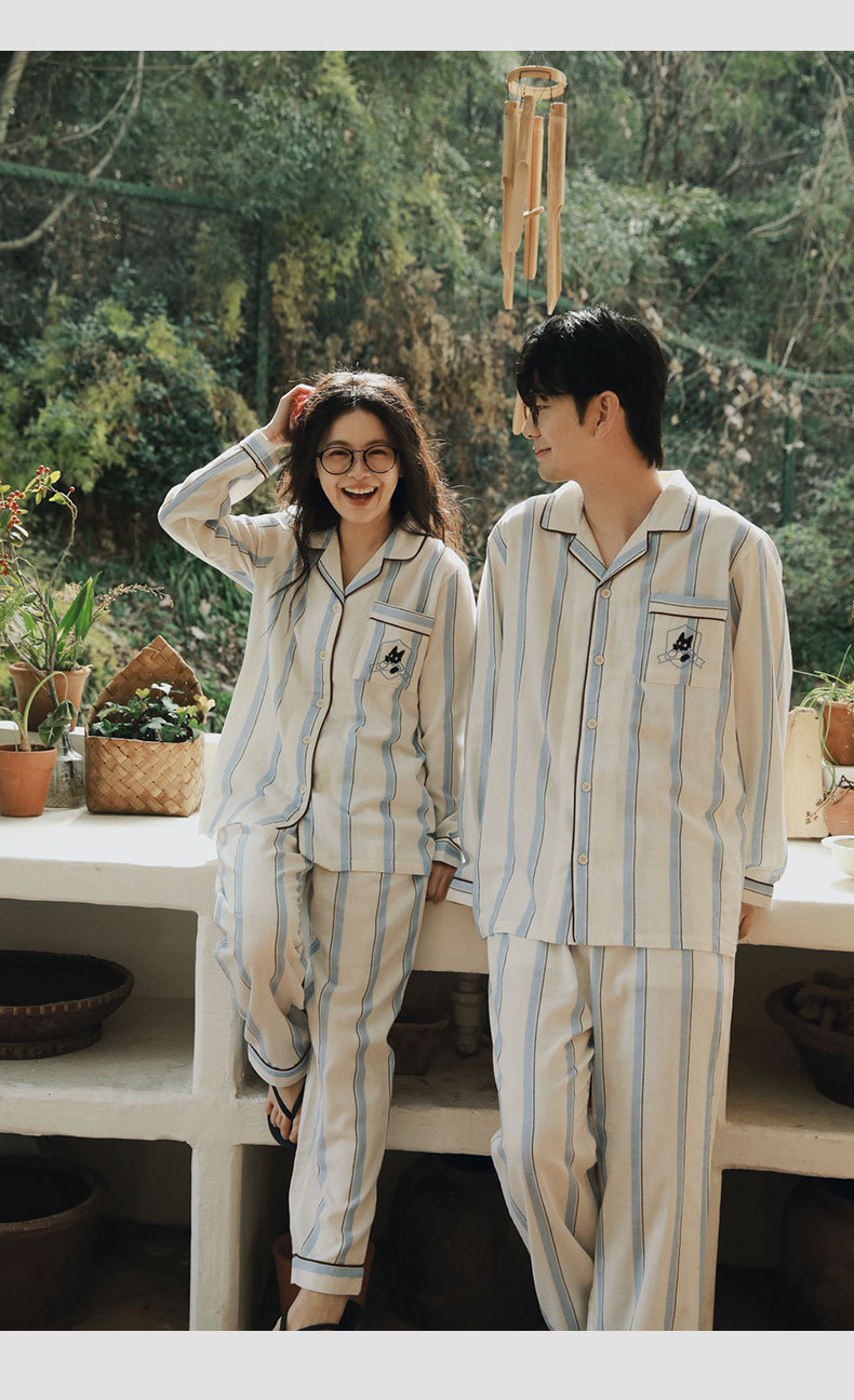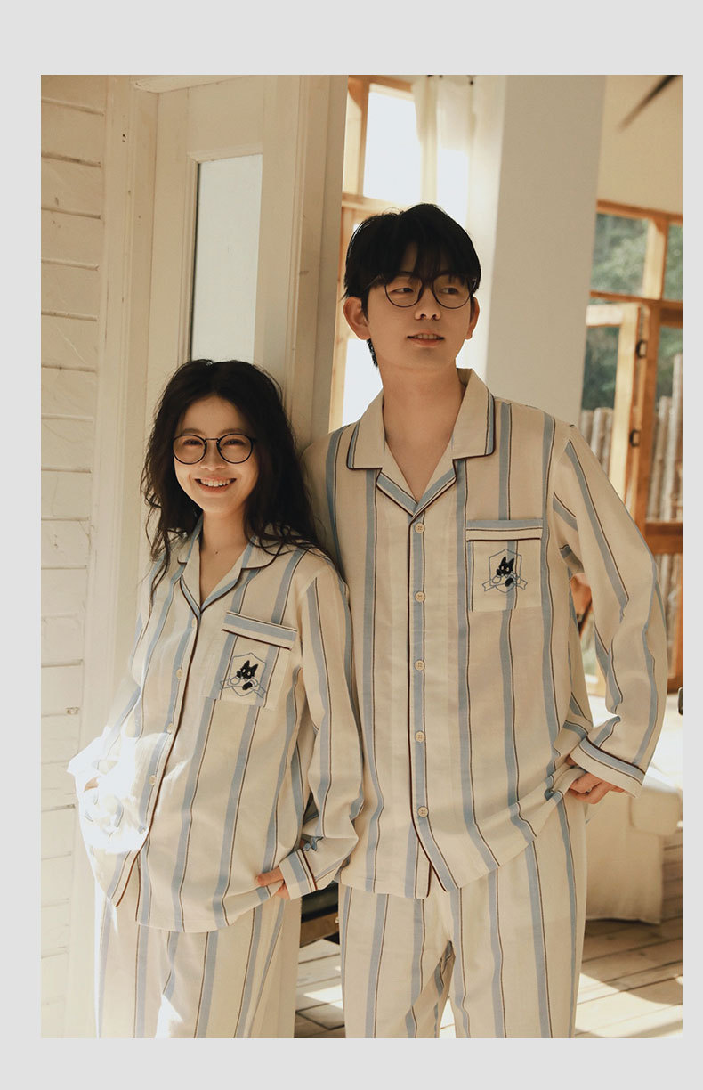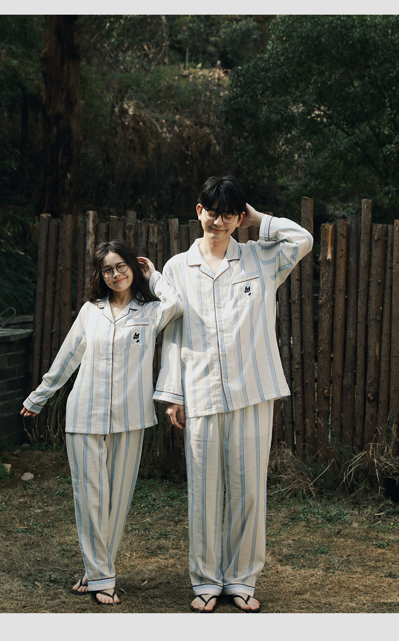 全棉双层纱~情侣款纯棉蓝白条纹睡衣女 野兽风格休闲家居服可外穿长袖全棉套装