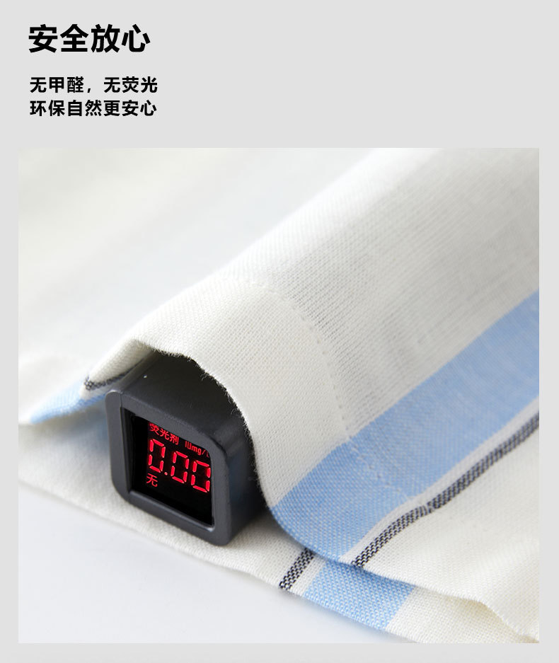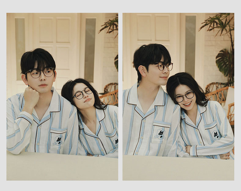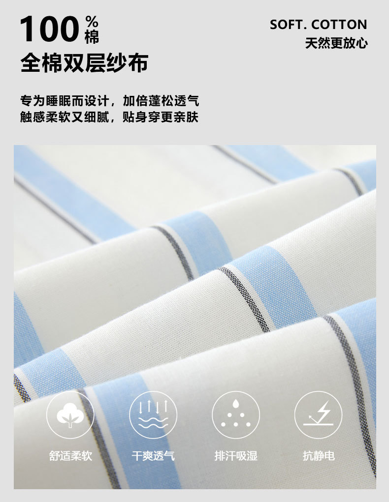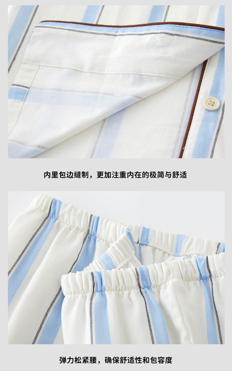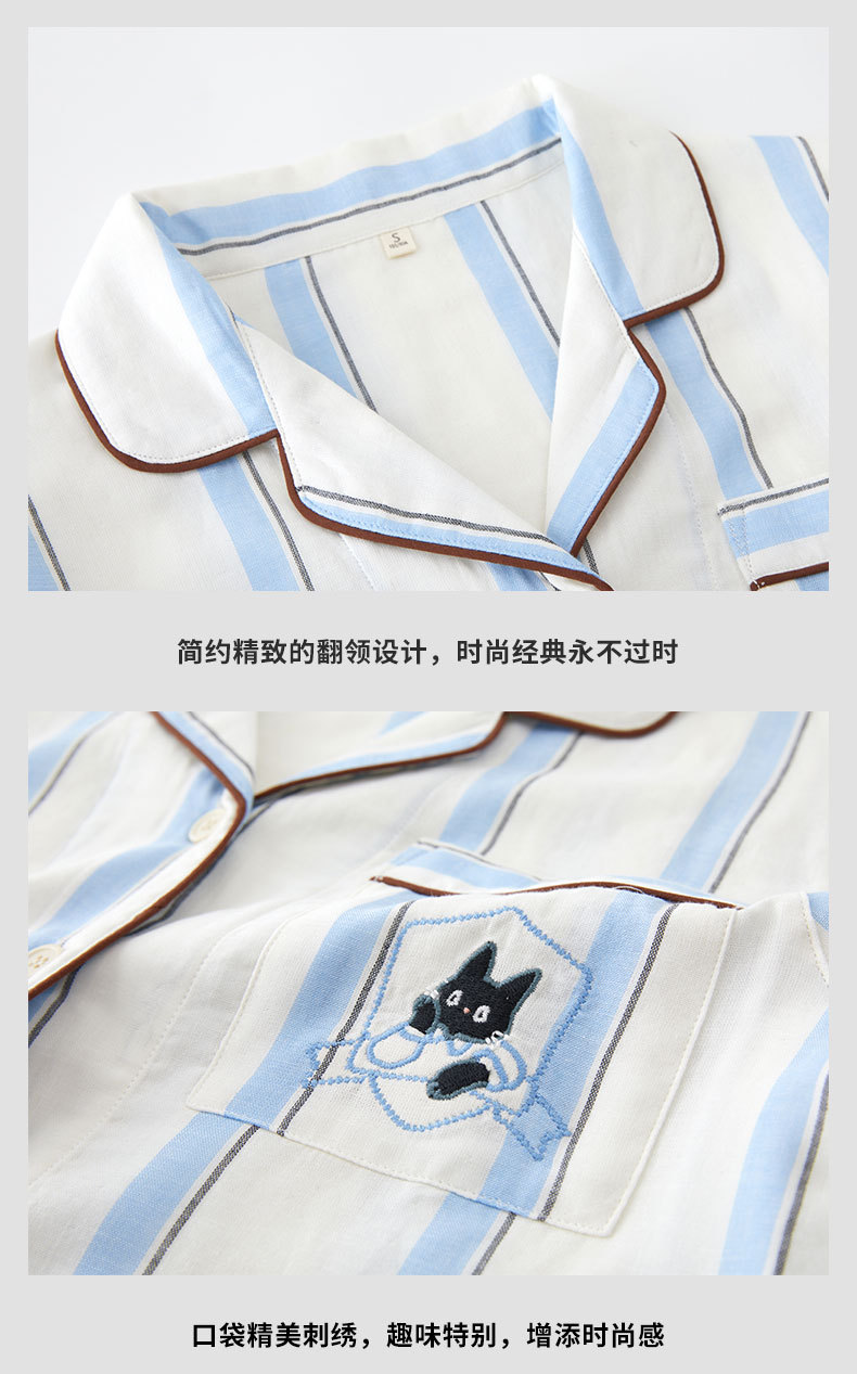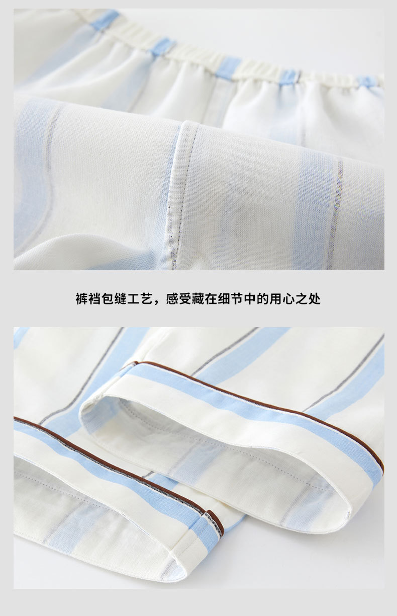 全棉双层纱~情侣款纯棉蓝白条纹睡衣女 野兽风格休闲家居服可外穿长袖全棉套装