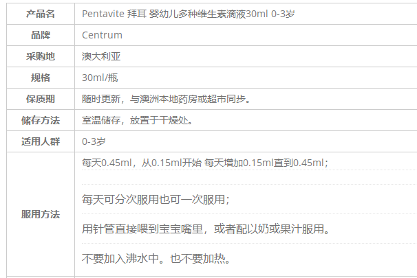 Pentavite 拜耳的婴幼儿多种维生素滴液,这款是几乎唯一一款适合新生儿的维生素滴剂了,含有维生素ABCD等。抵抗力不好或者需要补充营养的新生儿可以加这个。一瓶30ml,大概2个多月的量。菠萝口味,加在奶里或者果汁里都可以了,也可以直接挤到宝宝的嘴里,不能加热。无蔗糖、无添加、无防腐,低敏不含奶麸质豆类蛋类。