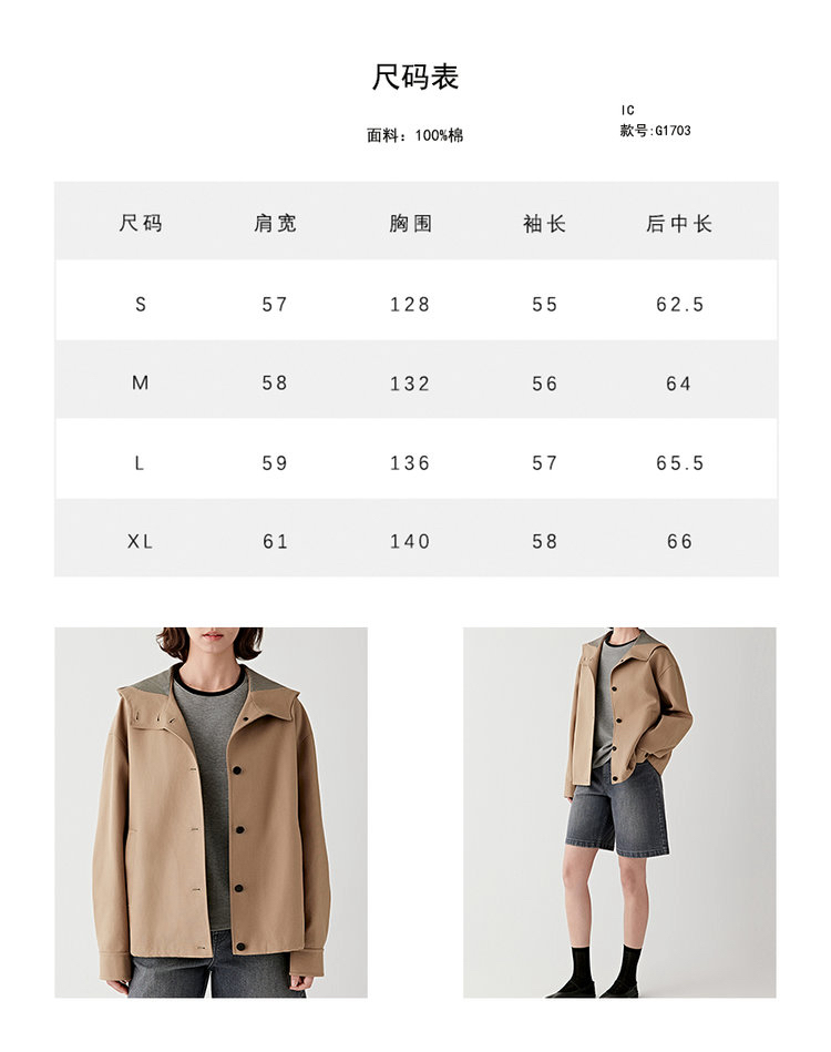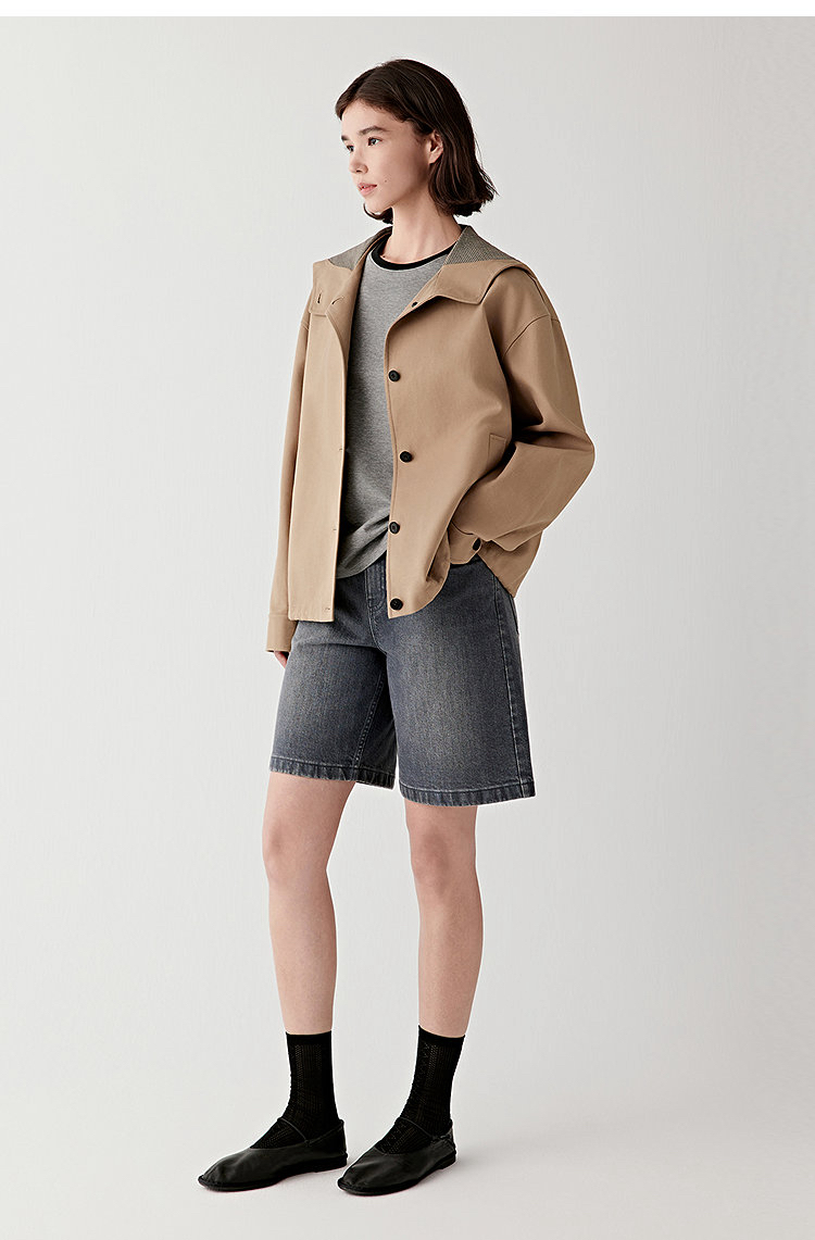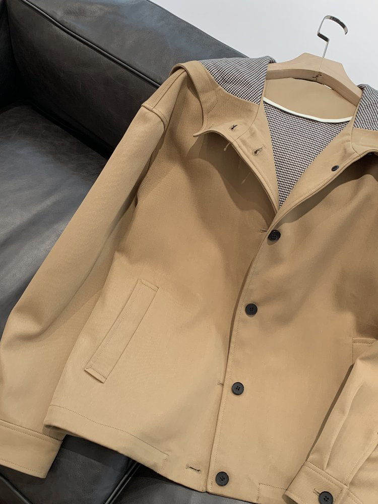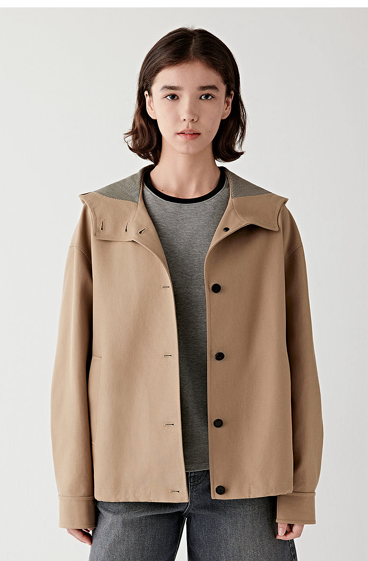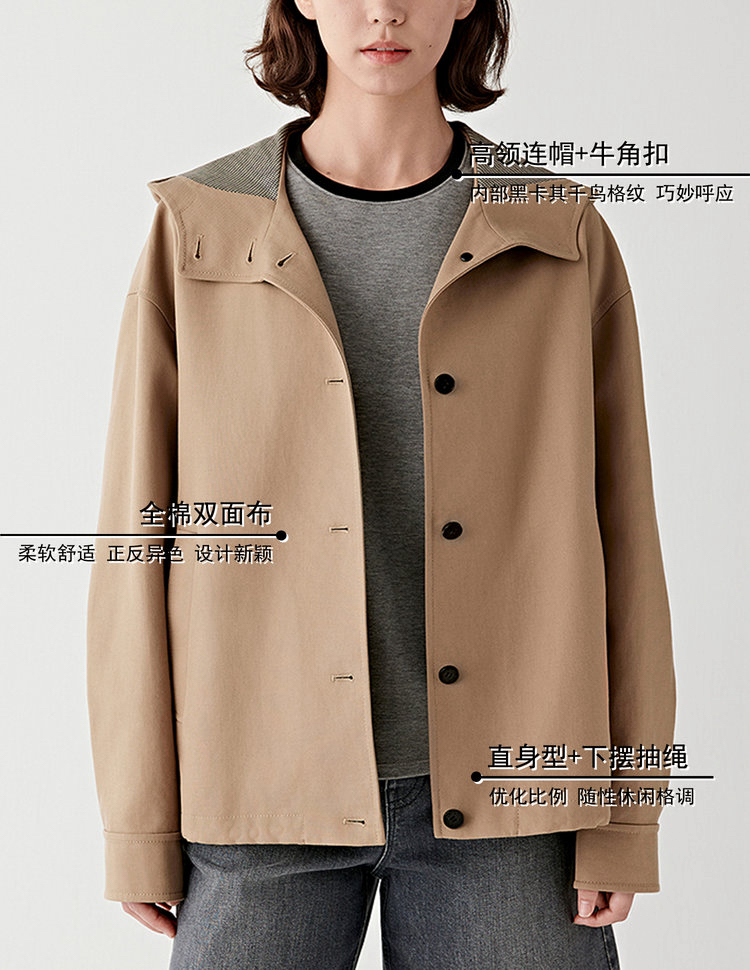 全棉双面布夹克外套 外简内繁短款风衣 正反异色千鸟格双面布 全棉双面布 柔软舒适 正反异色 短款+抽绳设计 比例自由切换撞色牛角扣