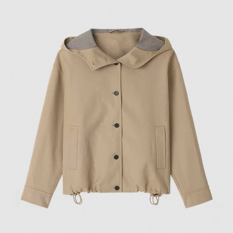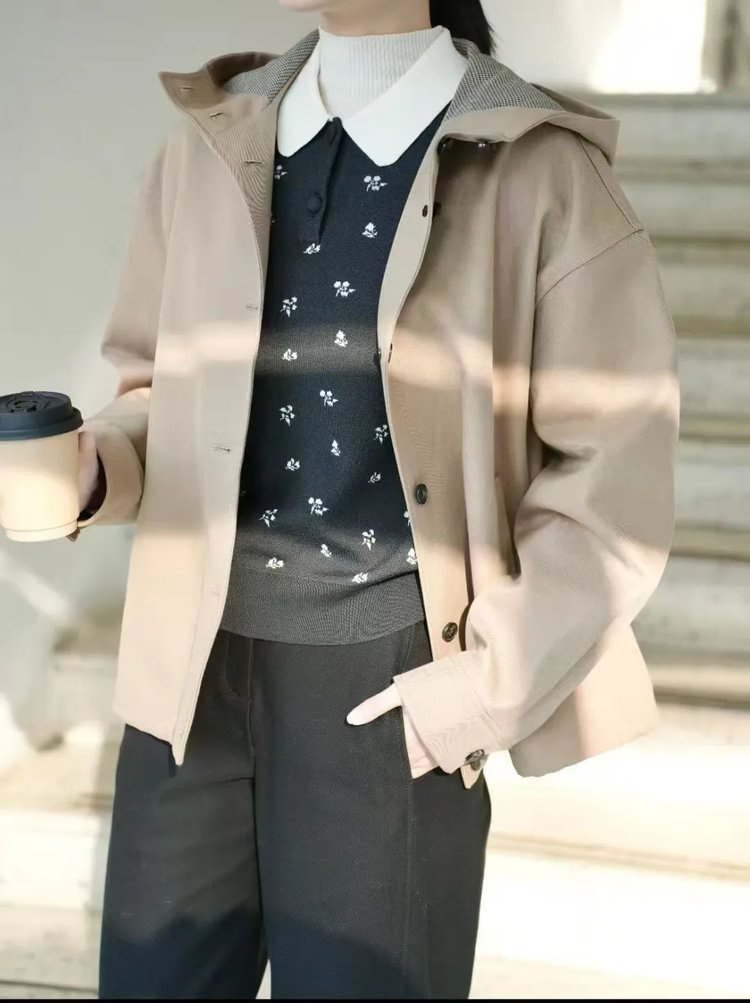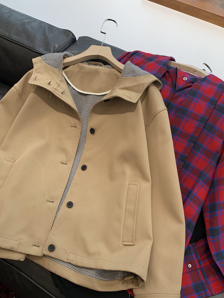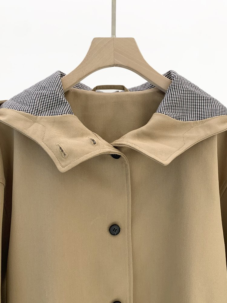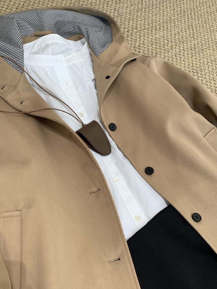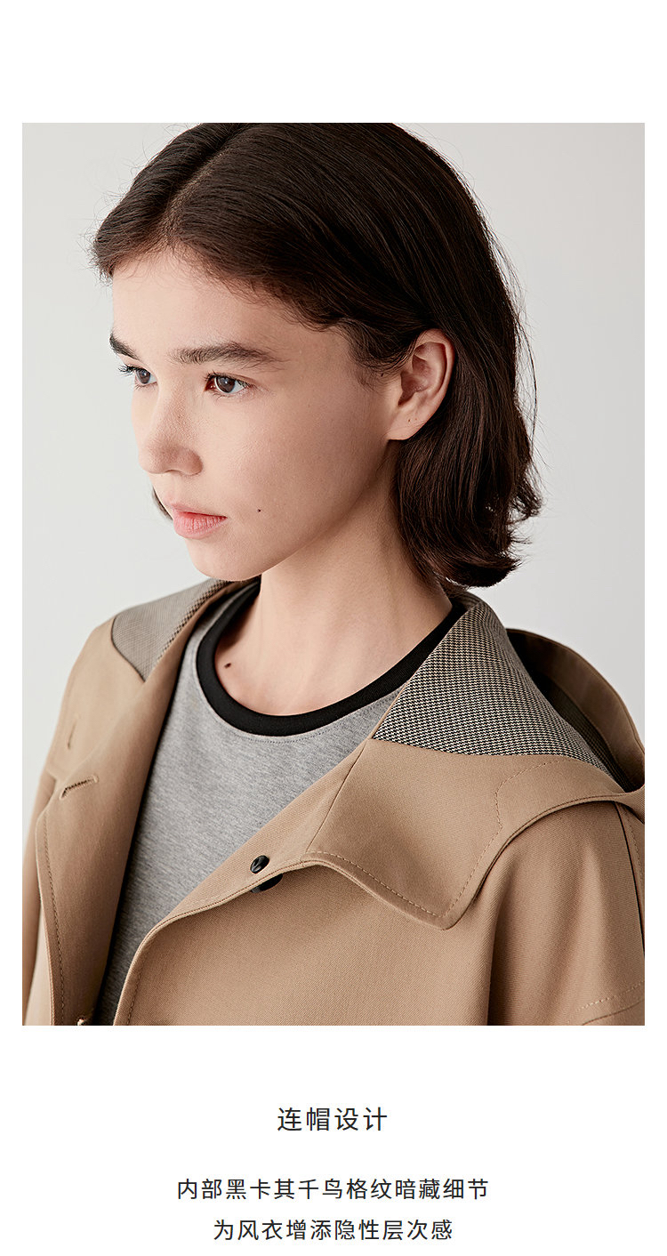 连帽设计,内部黑卡其千鸟格纹暗藏细节,为风衣增添隐性层次感。