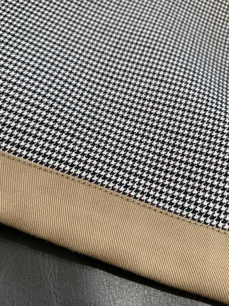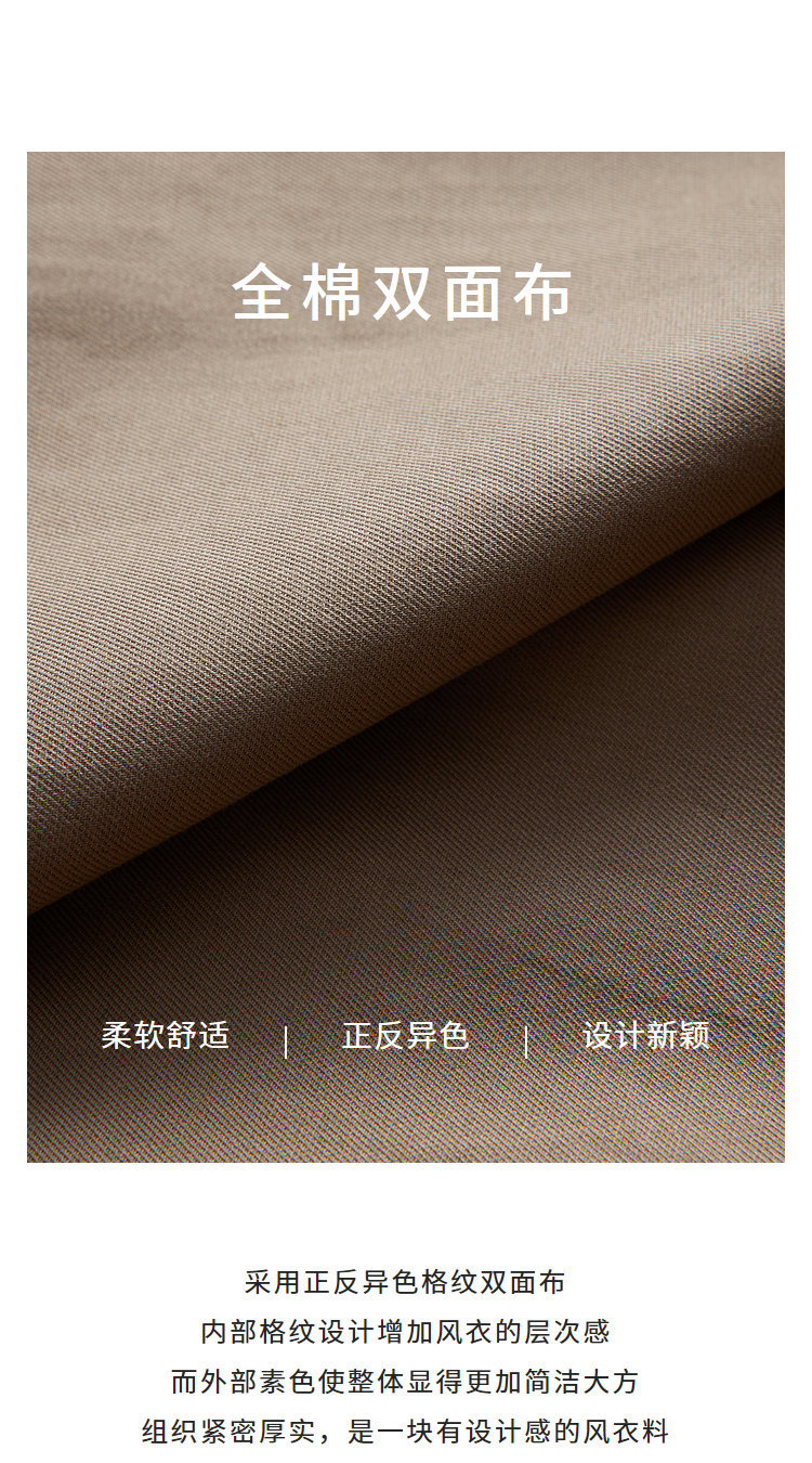 全棉双面布,柔软舒适 正反异色,设计新颖。采用正反异色格纹双面布,内部格纹设计增加风衣的层次感,而外部素色使整体显得更加简洁大方,组织紧密厚实,是一块有设计感的风衣料。