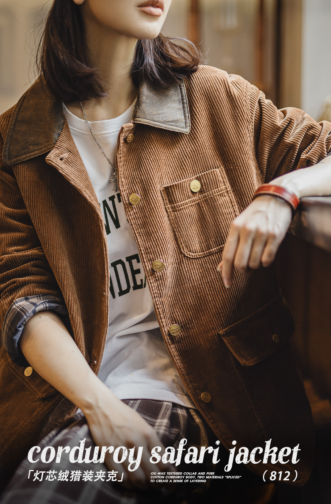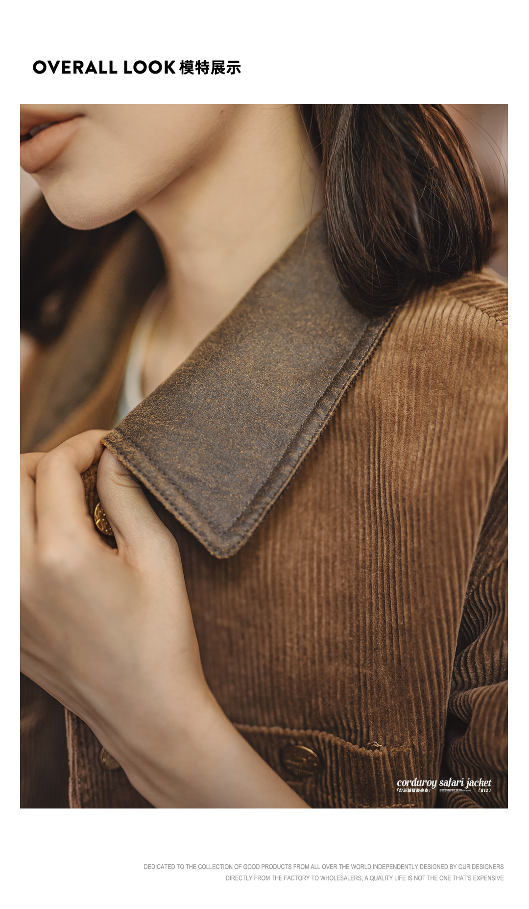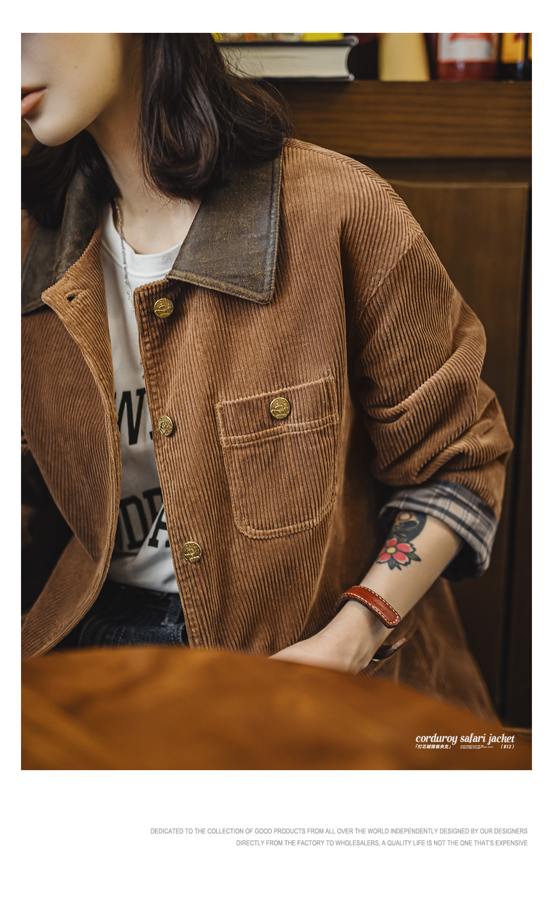马登复古美拉德撞棕色灯芯条绒麂皮翻领工装猎装夹克外套上衣女秋