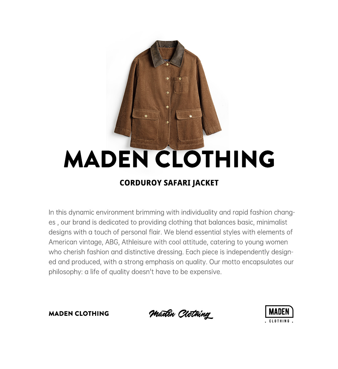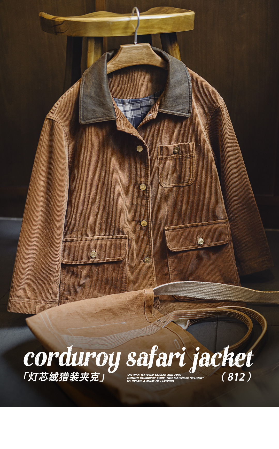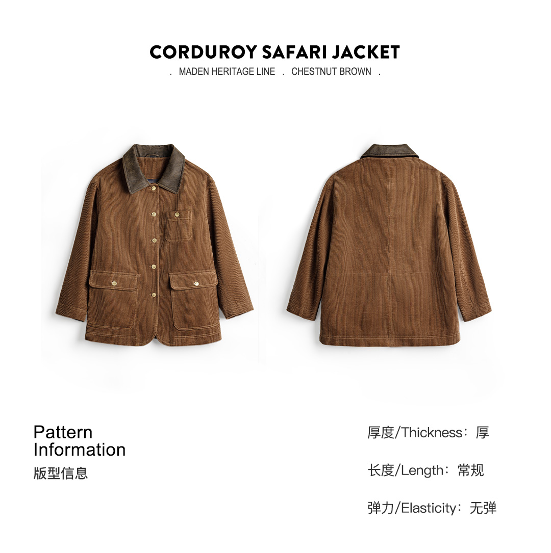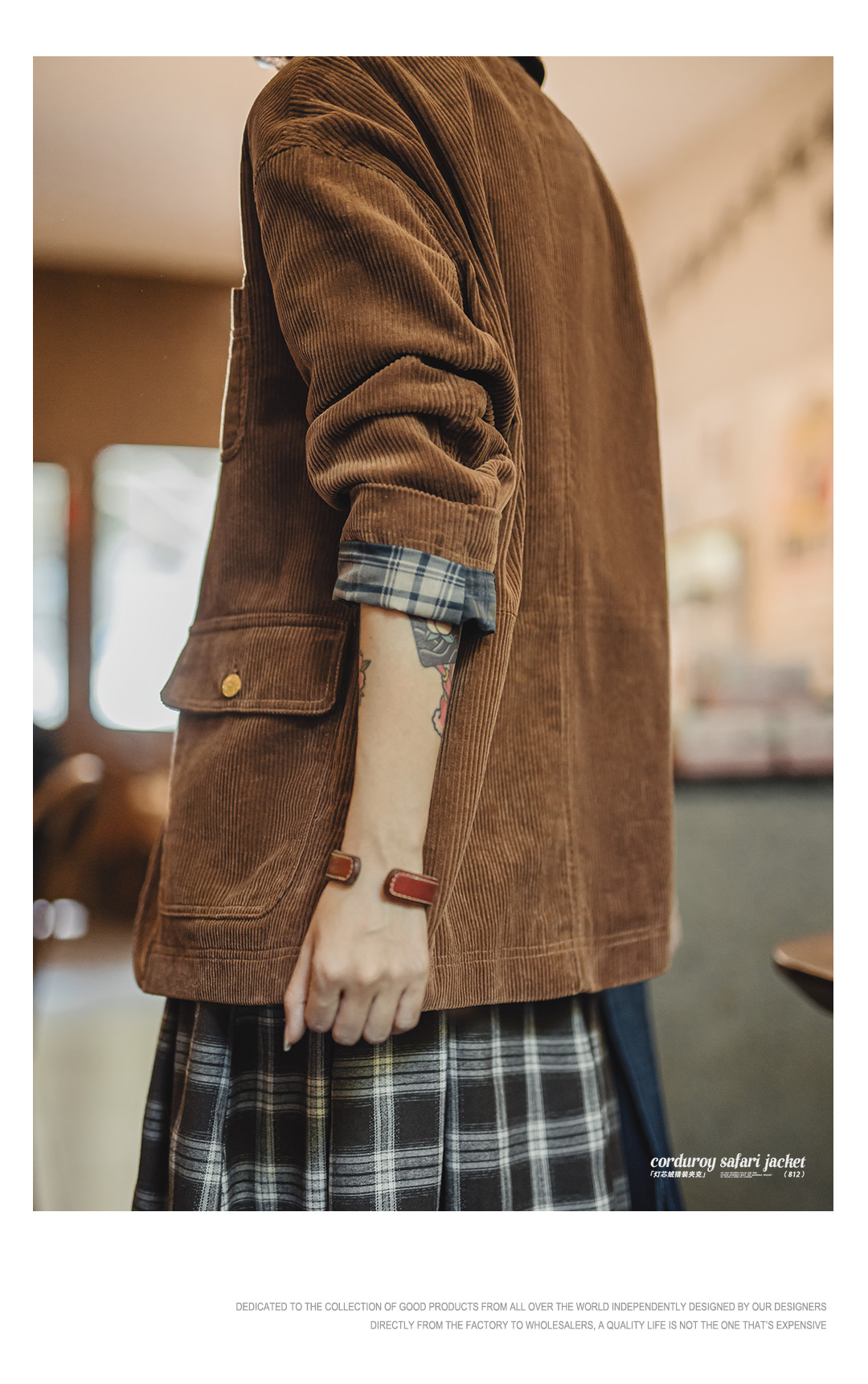 马登复古美拉德撞棕色灯芯条绒麂皮翻领工装猎装夹克外套上衣女秋