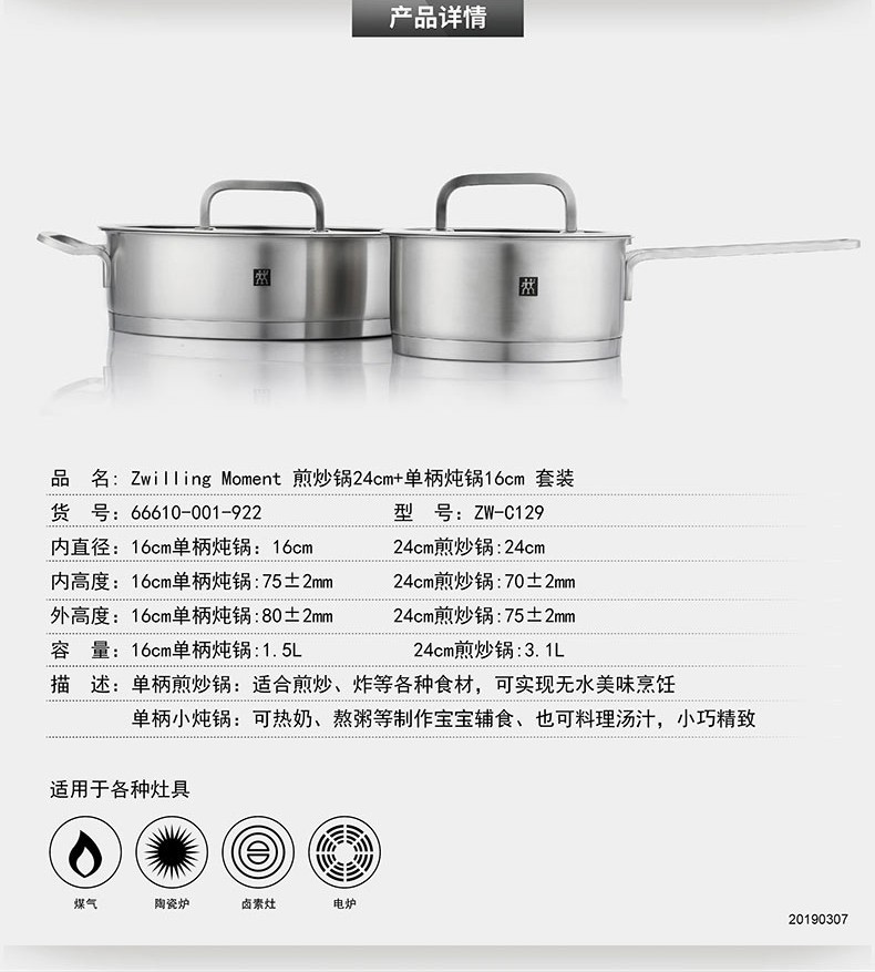 TY 双立人 Zwilling Moment/ZW-C129锅具套装(煎炒锅24cm+单柄炖锅16cm )【鲜知10.0】