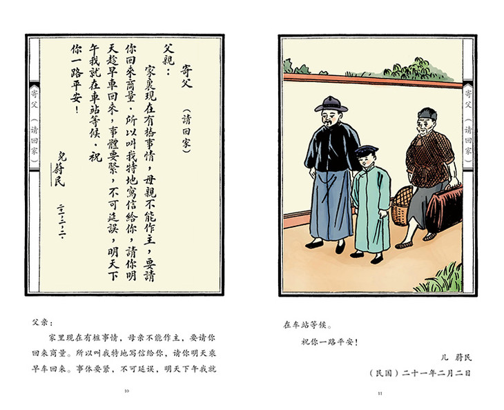 “这套《写给孩子的民国书信》可谓是民国留给我们的一扇‘小窗’,望进去,是一个幽微的孩童世界,民国时期的人情世故、风俗礼仪,如潺缓的小溪,明净地流淌着,浸润着一代又一代孩童幼小的心灵。”镂空部分就像一个“小窗”,读者可以看到一幅民国小插画,这正是民国时代的风景,传递出浓浓的民国韵味。