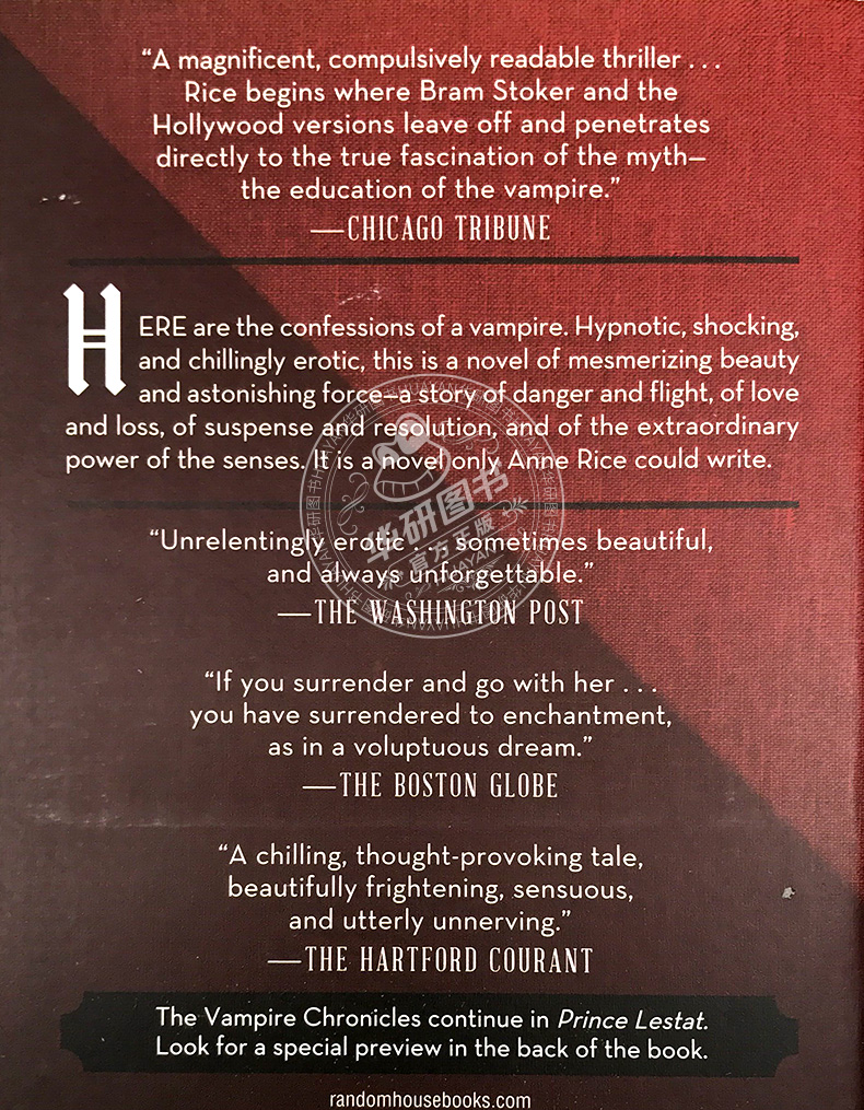 “一本华丽的、让人欲罢不能的惊悚小说……赖斯从布拉姆·斯托克开创的小说类型开始,填补了好莱坞电影版本的缺憾,直接地深入了这一神话真正的魅力——吸血鬼的成长教育。”——《芝加哥论坛报》