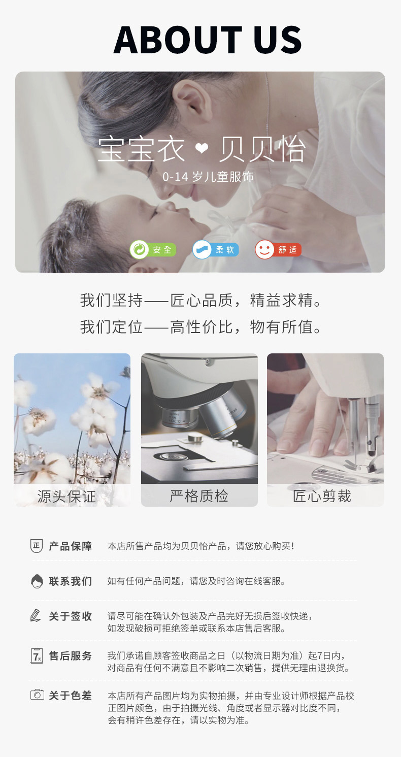 - 贝贝怡专注0-6岁婴幼儿服饰,坚持安全、柔软、舒适的产品理念,为千万中国家庭提供超高品质、安全可靠的婴幼儿服饰产品,妈妈放心,宝宝开心!