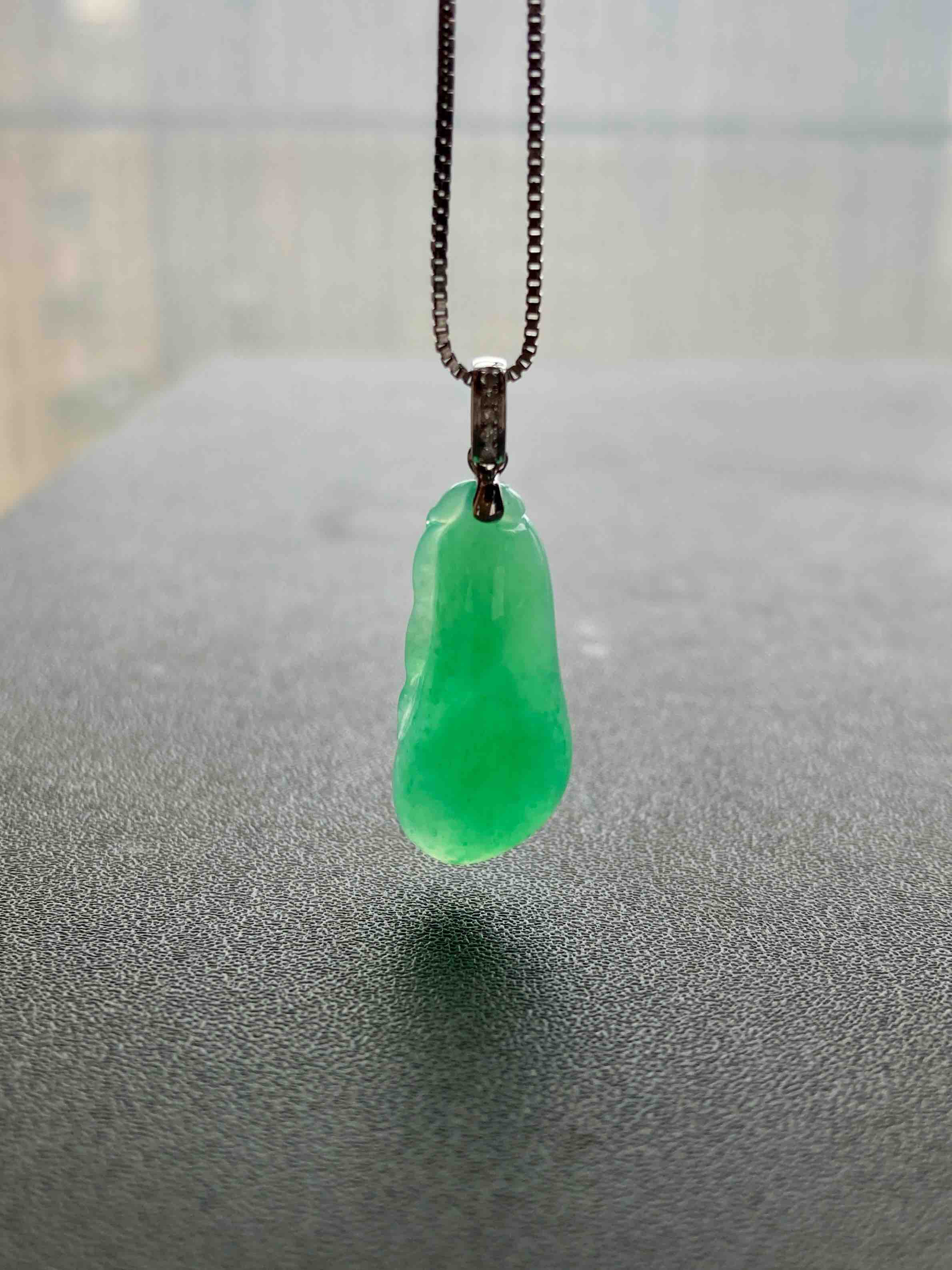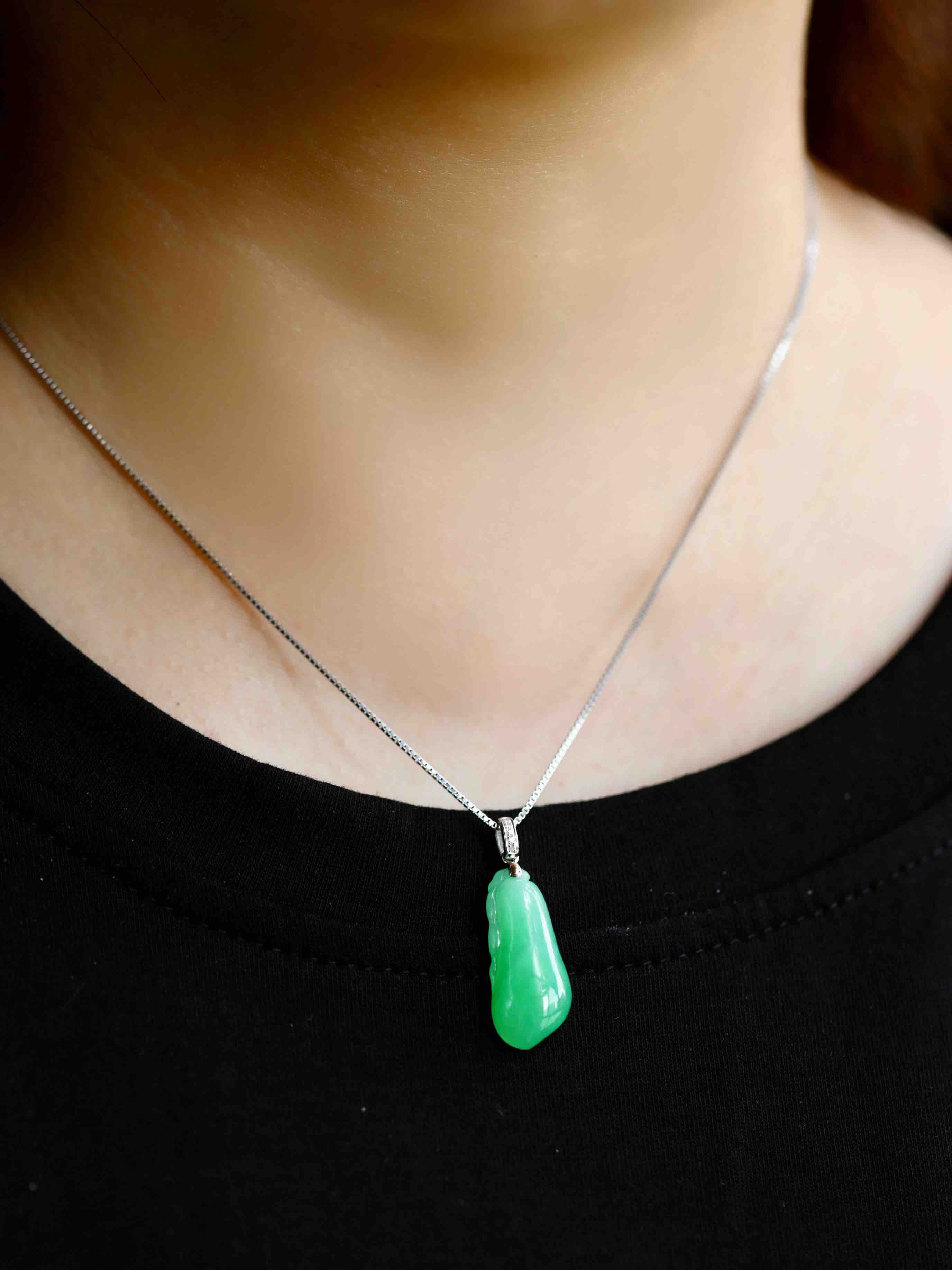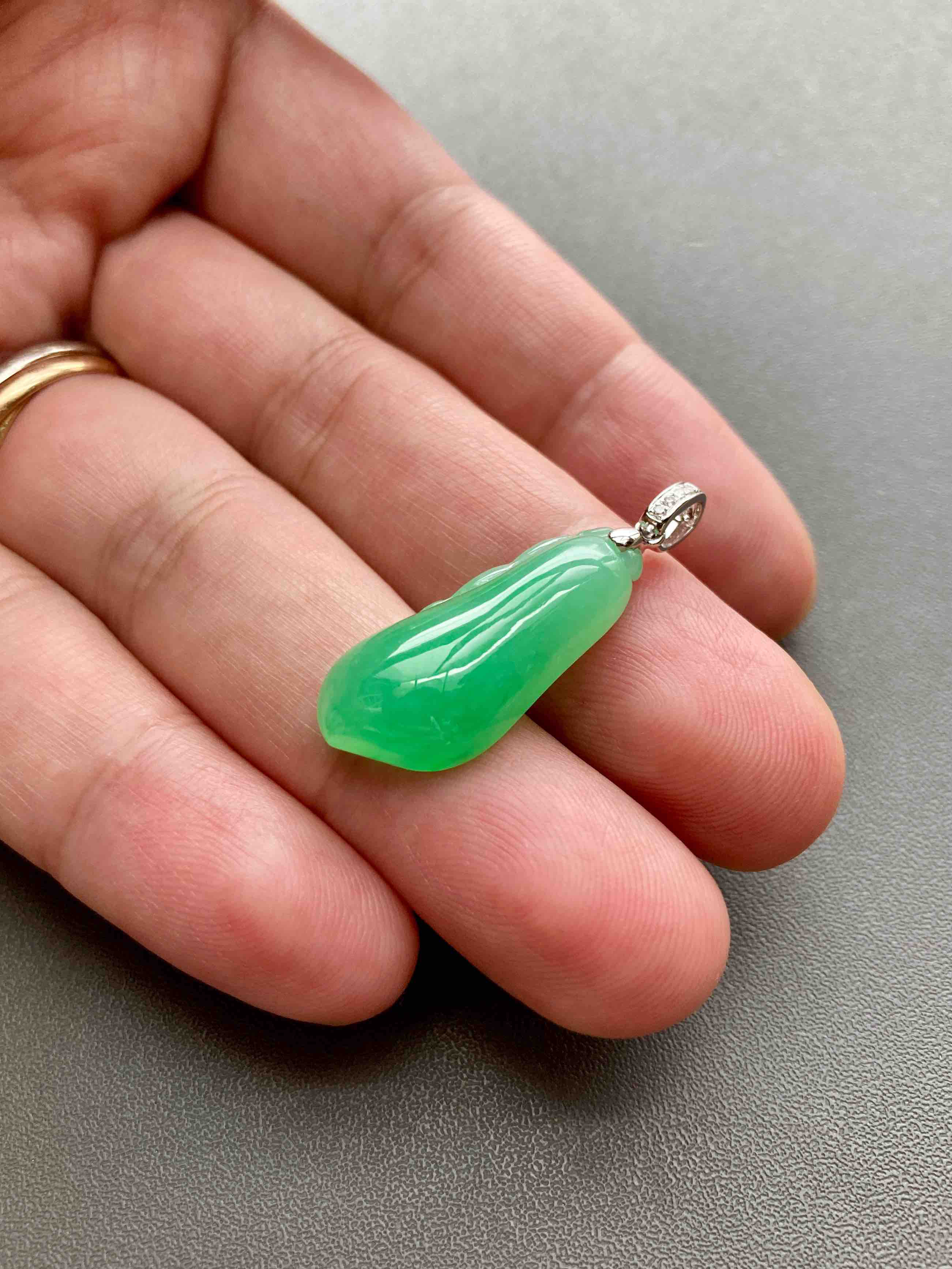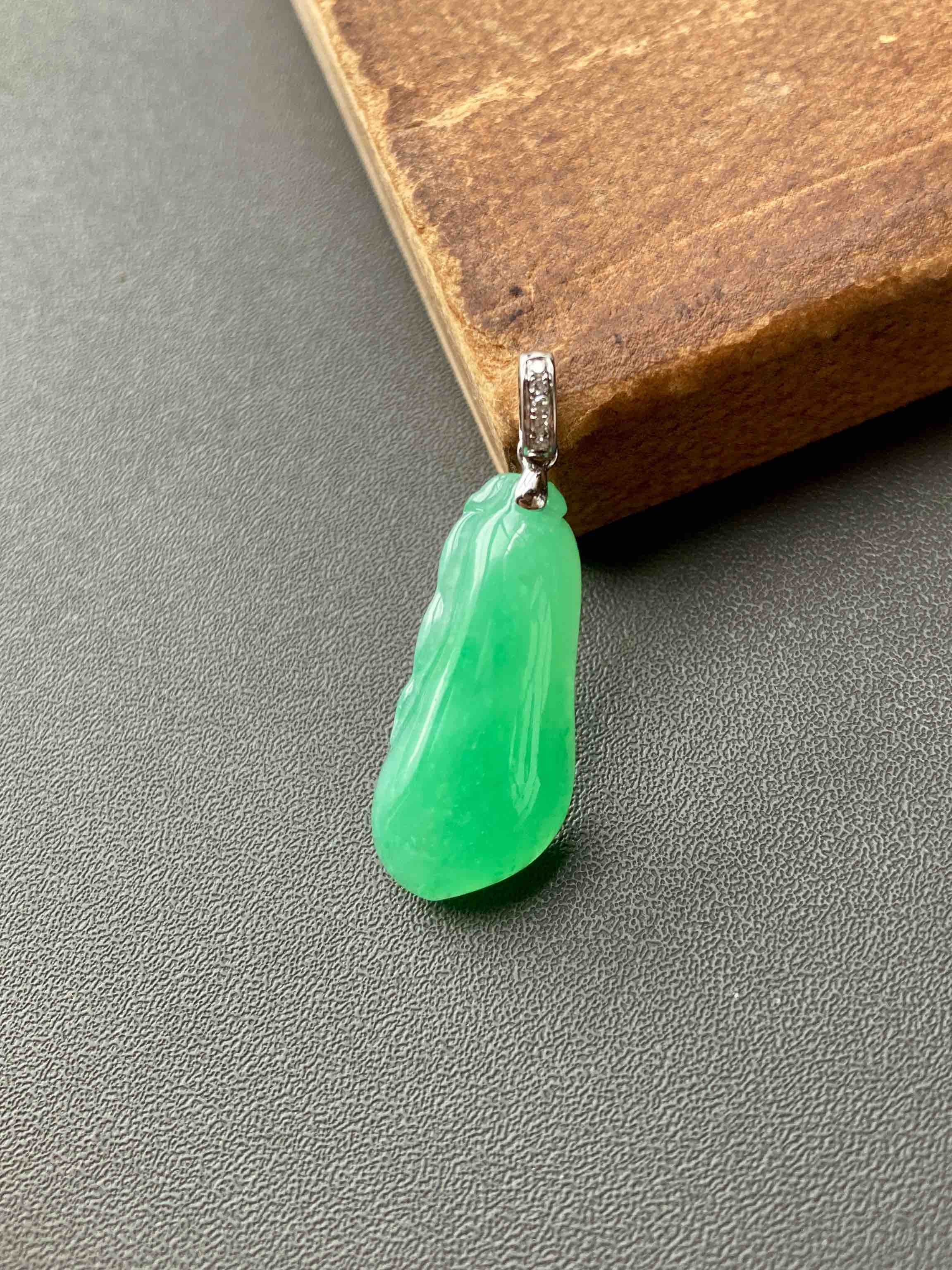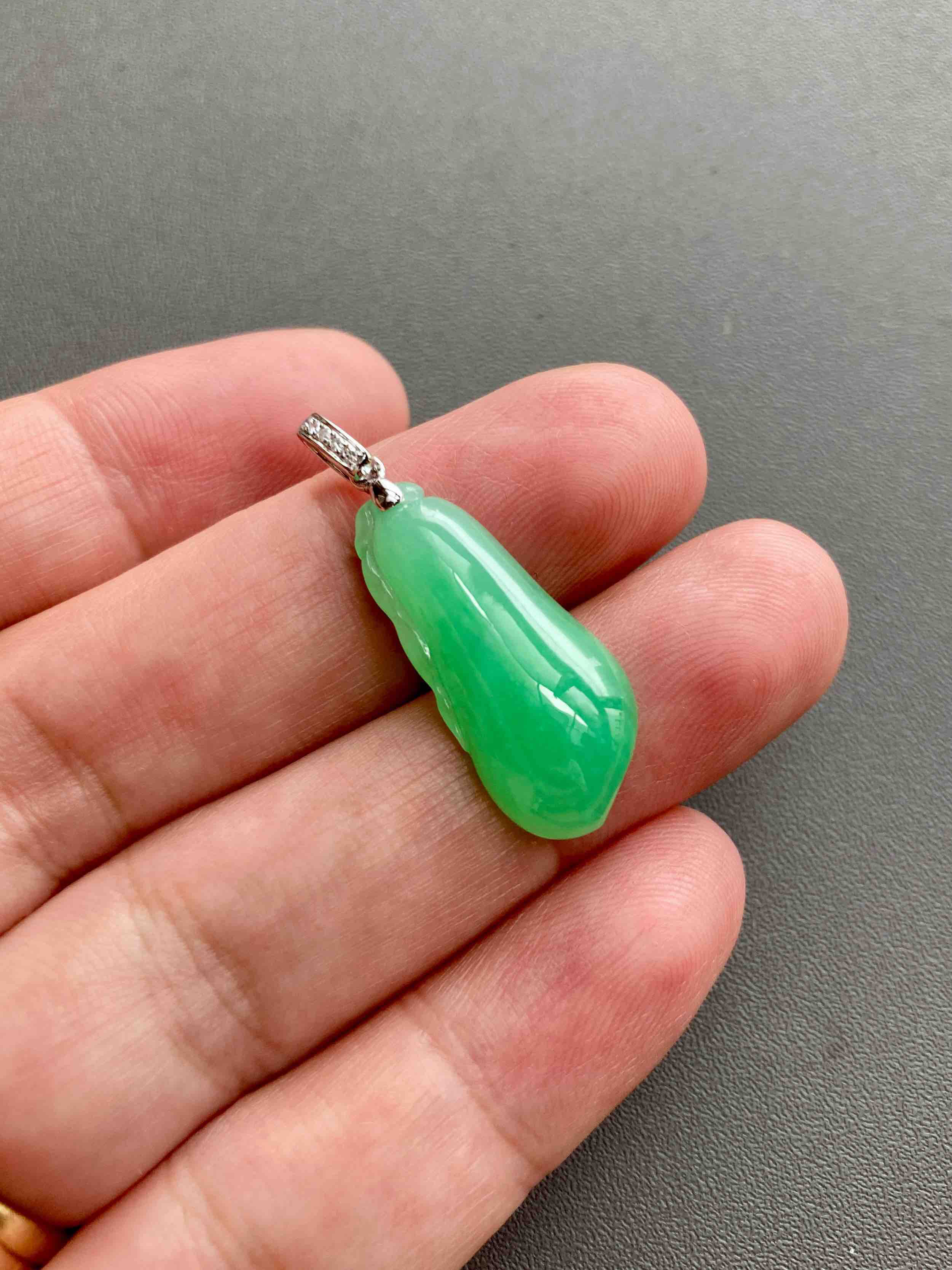 糯冰种阳绿厚庄翡翠福瓜,缅甸料,全光面无雕,立体饱满,阳绿鲜美,娇艳欲滴的种水让人一见倾心,只要四位数,配18k白金钻石镶嵌扣头,性价比一绝,强烈推荐,24.7×10.9×5.4mm