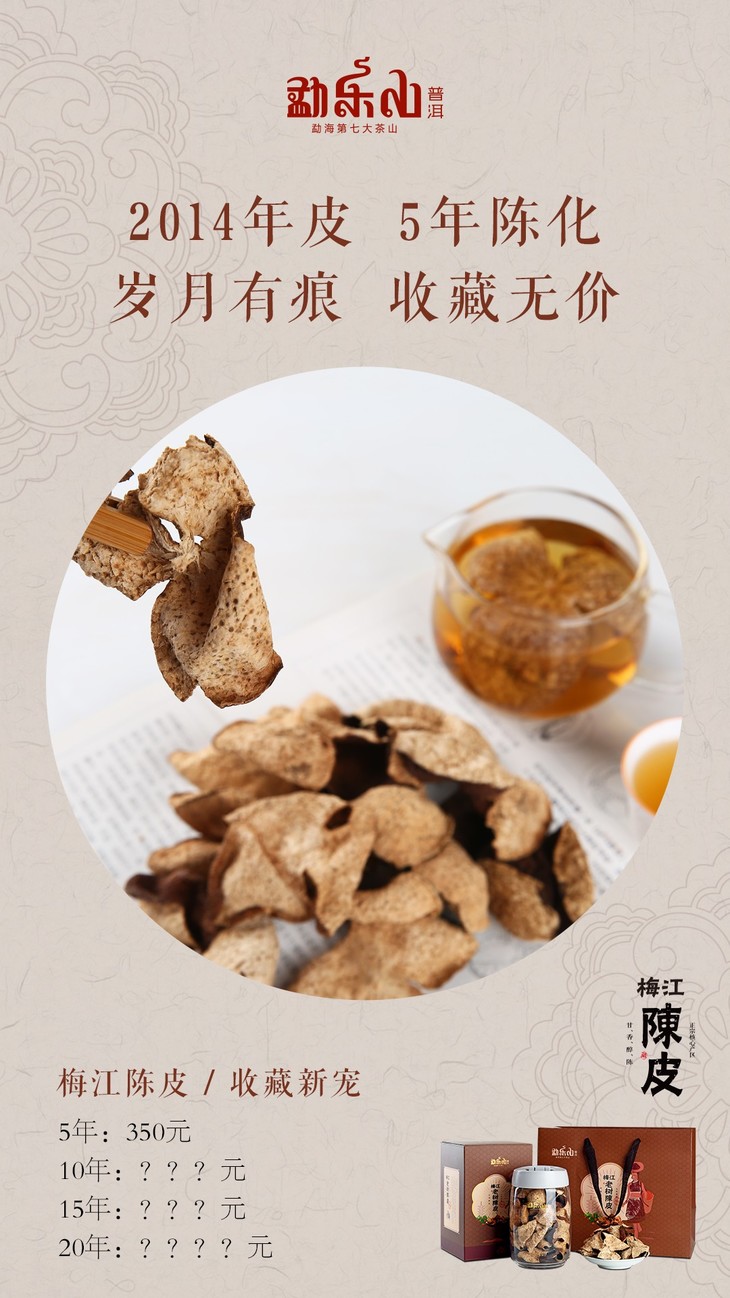 勐乐山2014年梅江陈皮,已度过5年自然陈化的时光。10年后,15年后,20年后,30年后,它的滋味会怎么样?价值会怎么样?