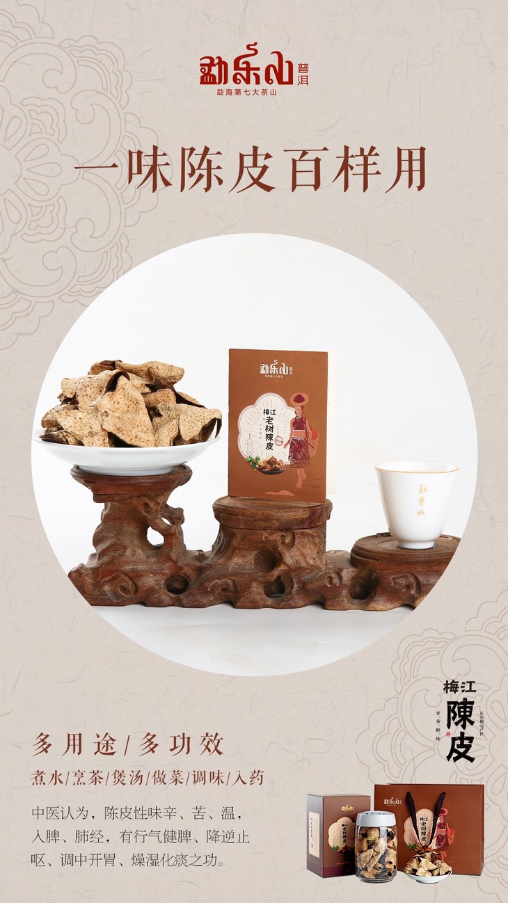 梅江陈皮,凭着“甘香醇陈”的内涵和“药食同源”特性,走上了人们的茶桌与餐桌。煮水,烹茶,煲汤,做菜,调味,入药……多功多效,滋味迷人,性情百搭。