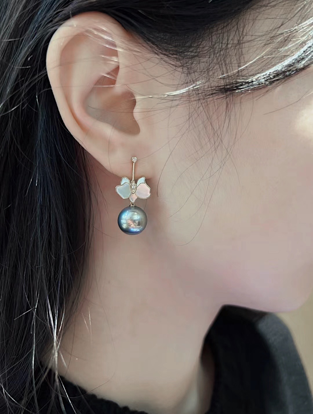 作品名称:18K镶钻石、母贝和大溪地珍珠耳坠
