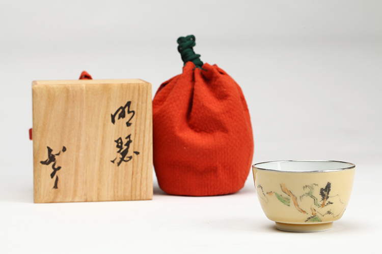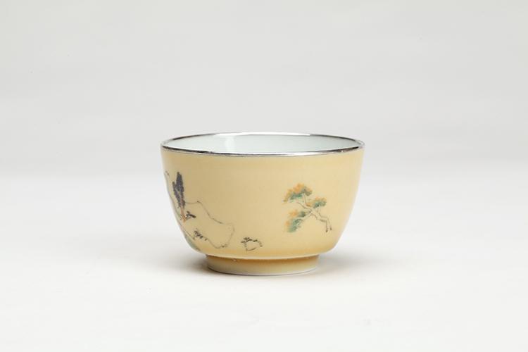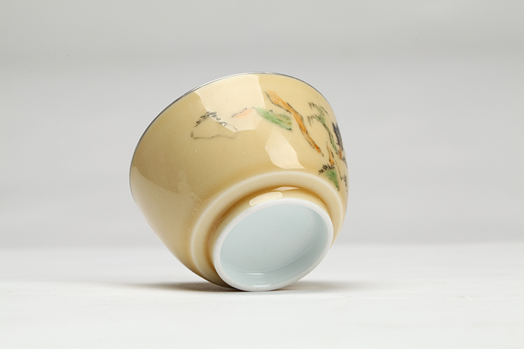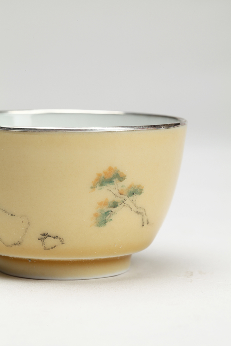 《明瑟》宋黄釉彩绘主人杯,釉色油润沉静,陈如冬的作品儒雅文气,树木、赏石,他的作品总是有一种魔力,让人不自觉的身临其境,心静下来,漫步其中。画面寥寥数笔,江南文人气息沉浸其中。