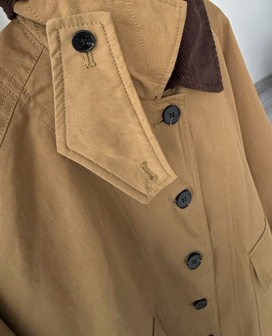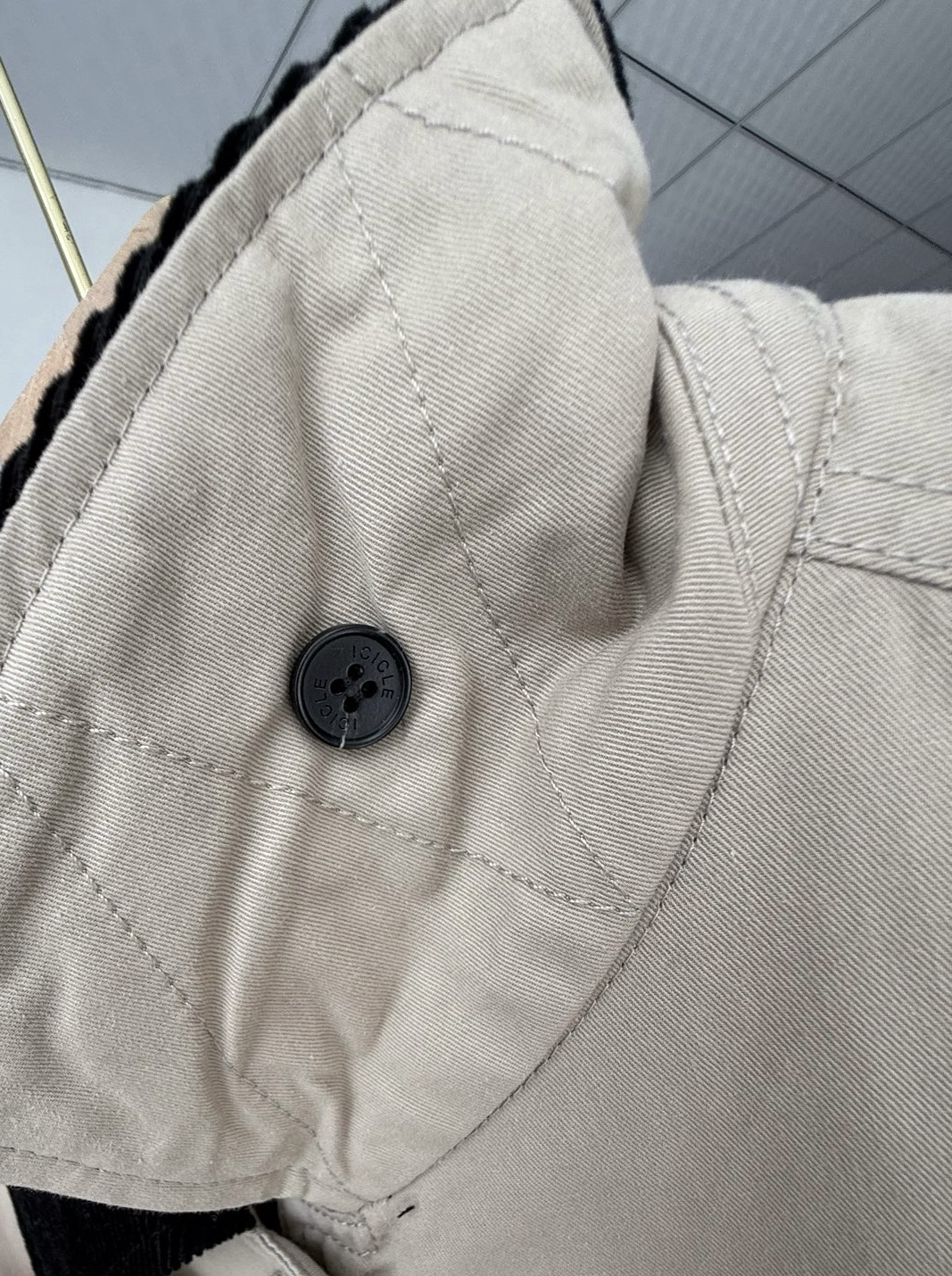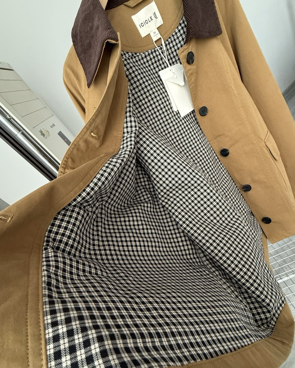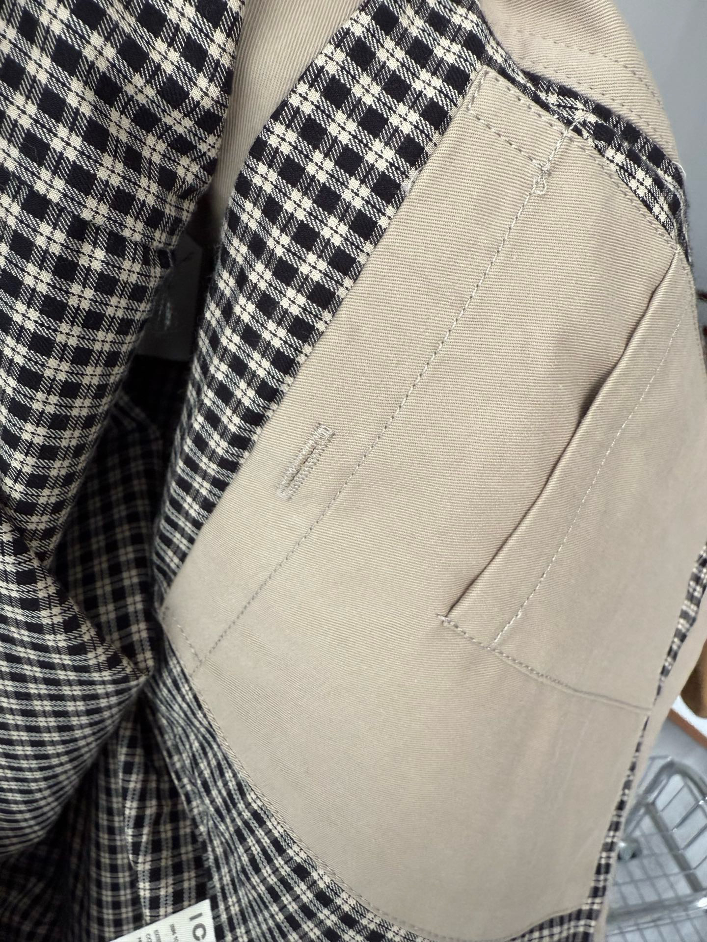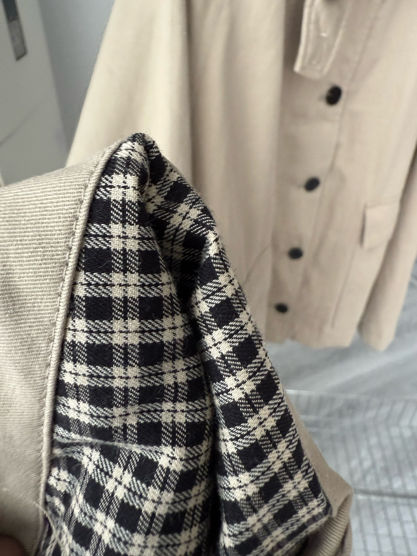 领部是灯芯绒面料,为外套增添了独特的质感和视觉亮点,内搭是磨毛纯棉黑米白格纹面料,保留了猎装原有的元素面料细节,整件衣服精打细磨,简直了~