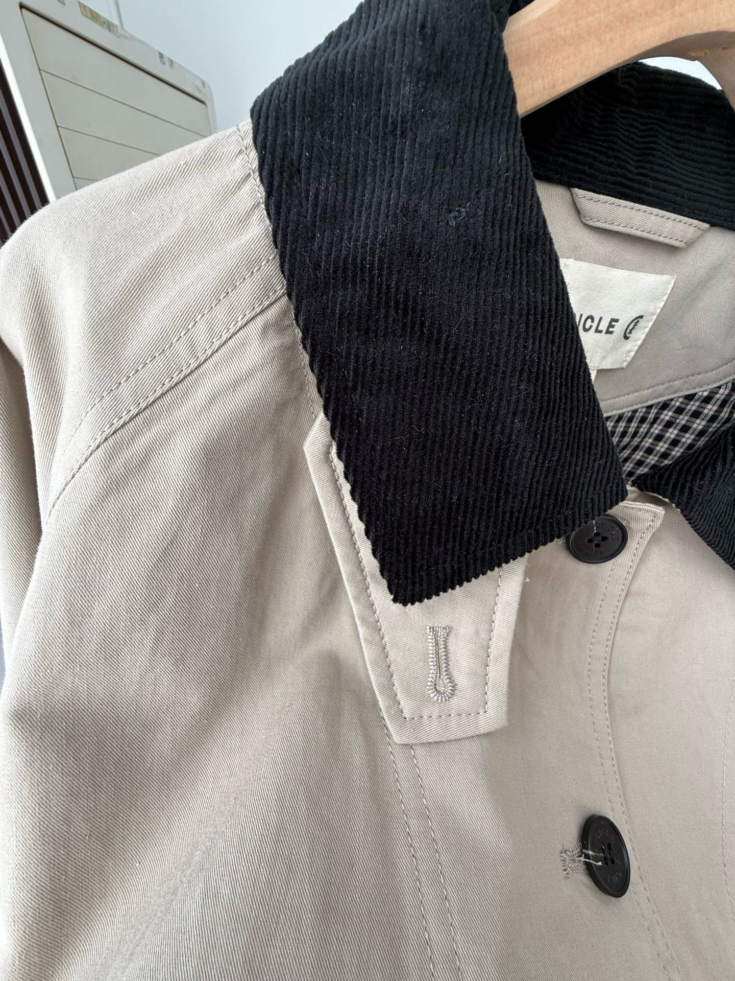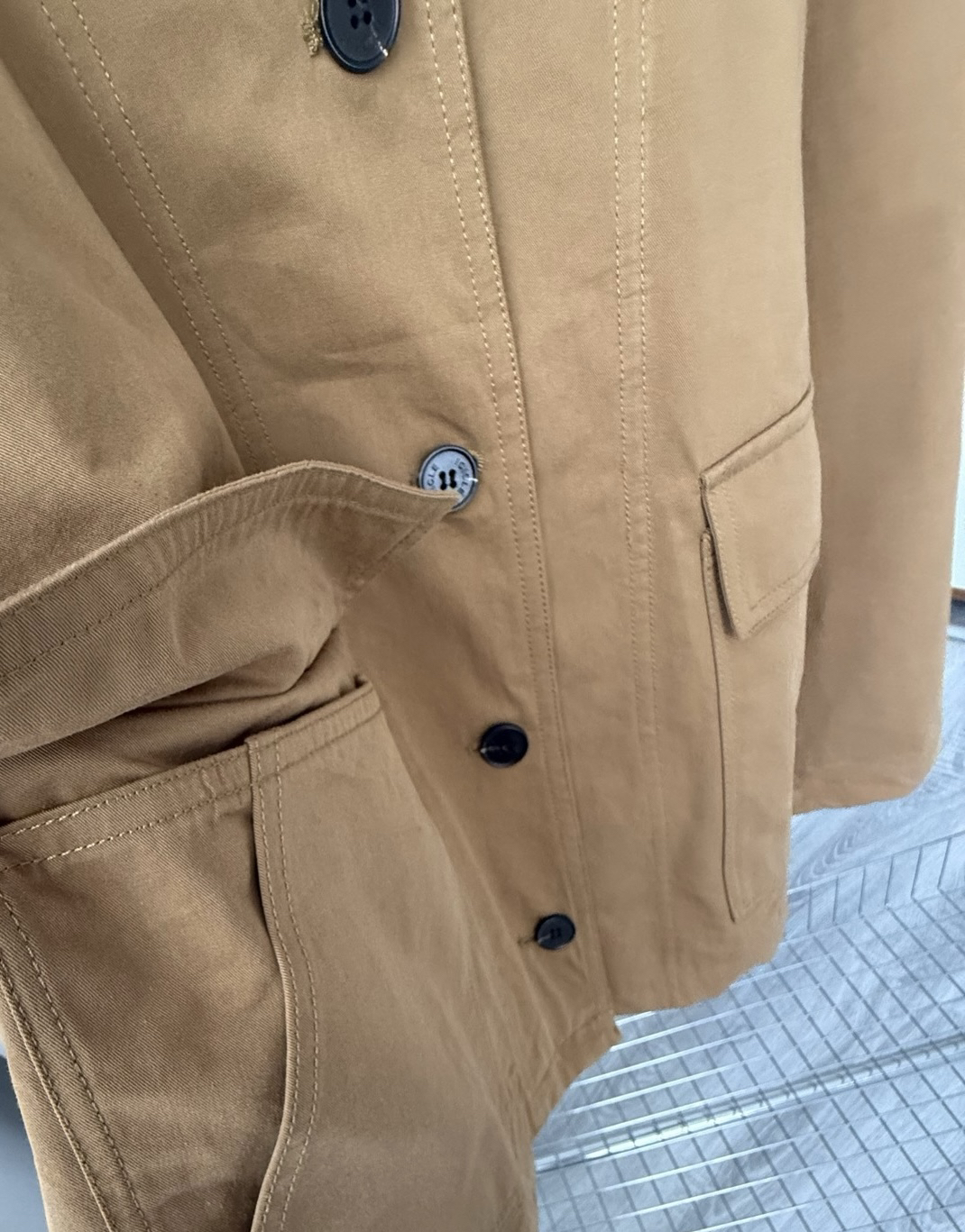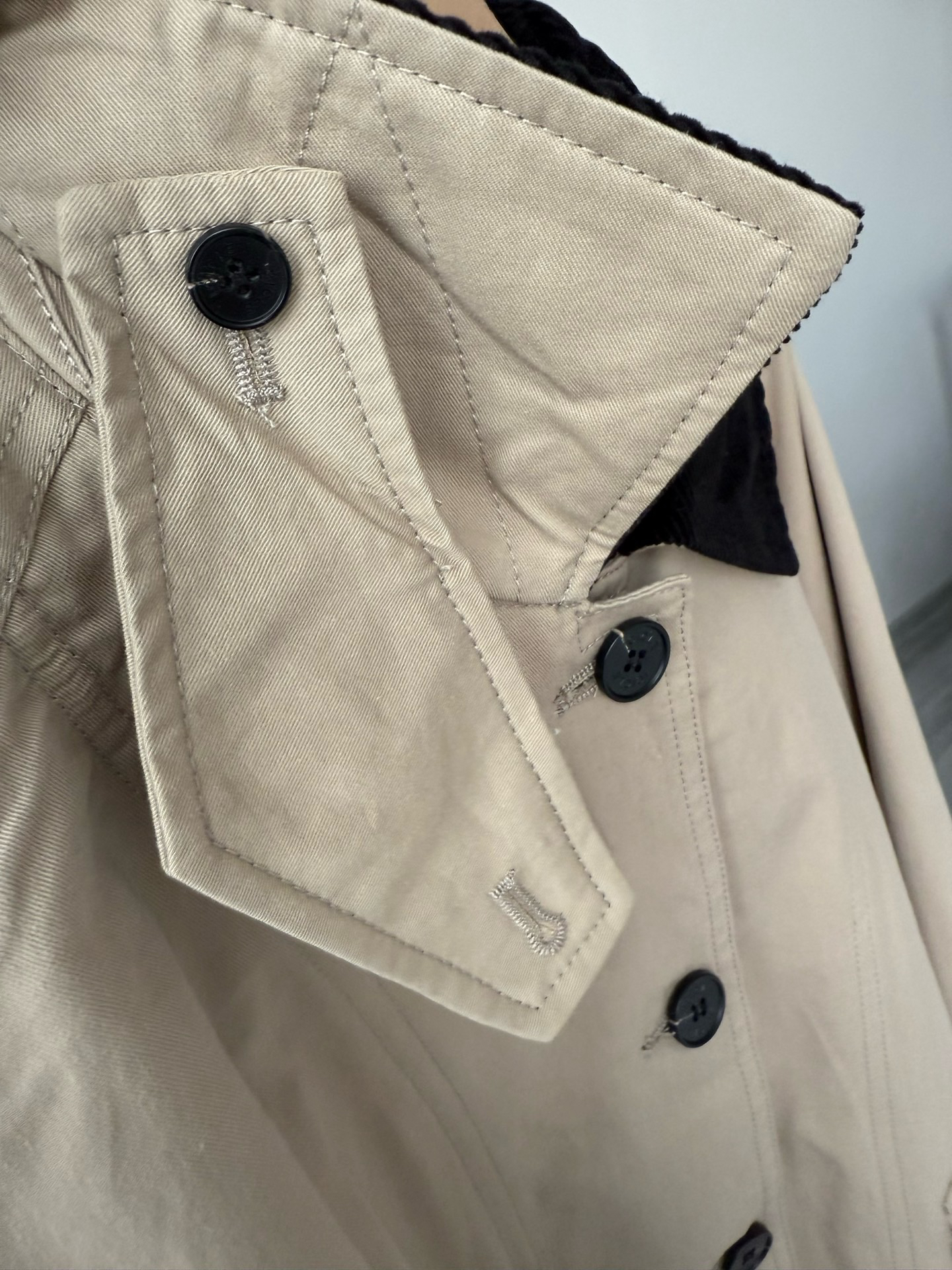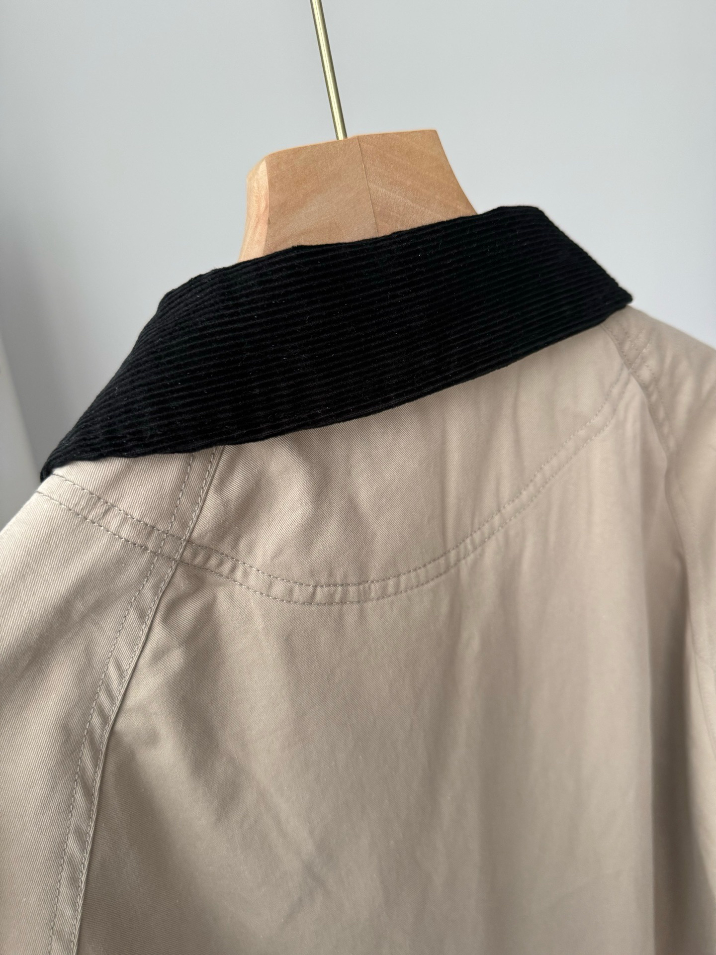 领部是灯芯绒面料,为外套增添了独特的质感和视觉亮点,内搭是磨毛纯棉黑米白格纹面料,保留了猎装原有的元素面料细节,整件衣服精打细磨,简直了~