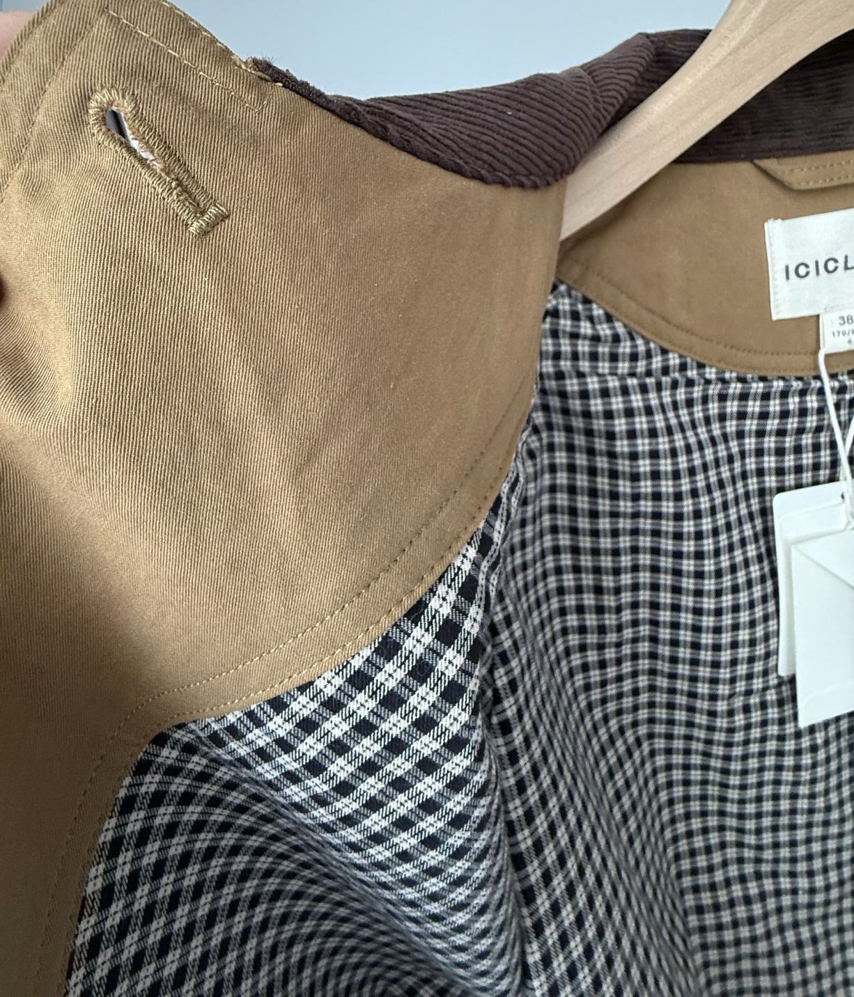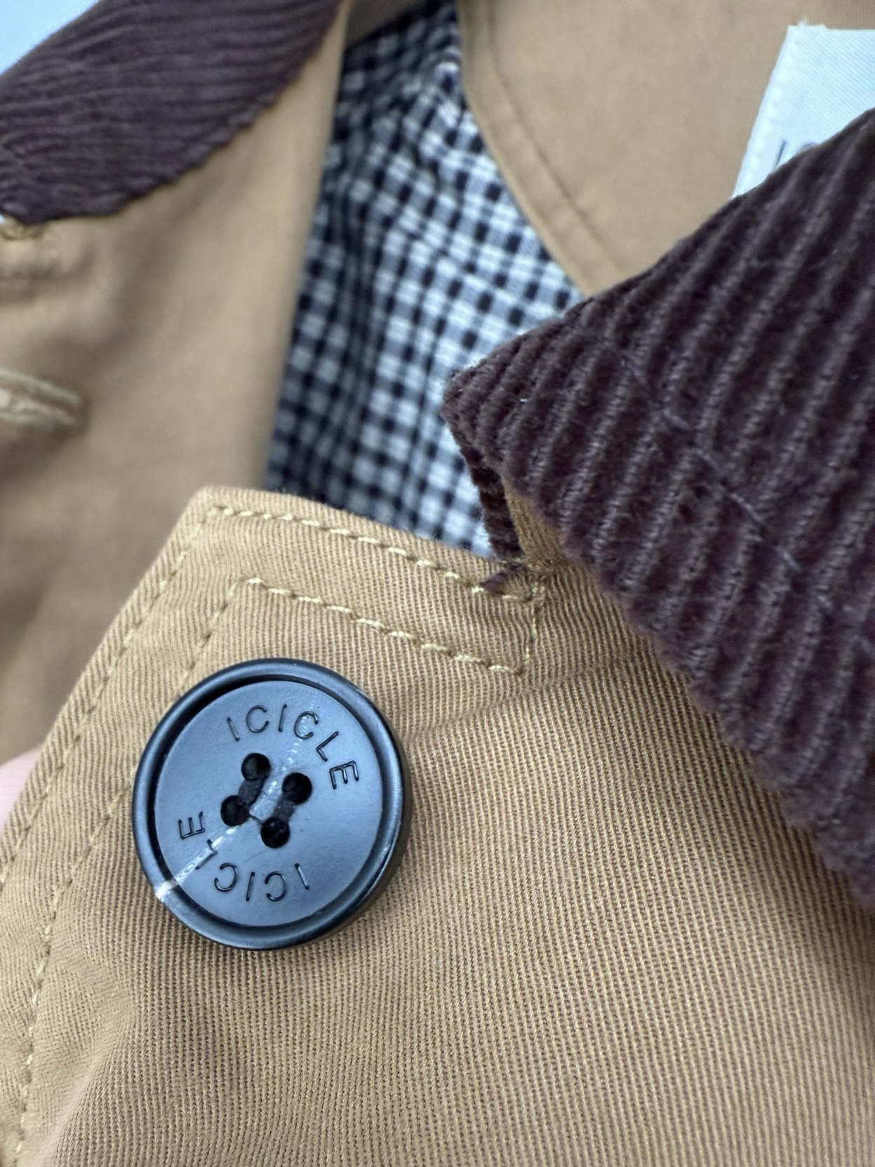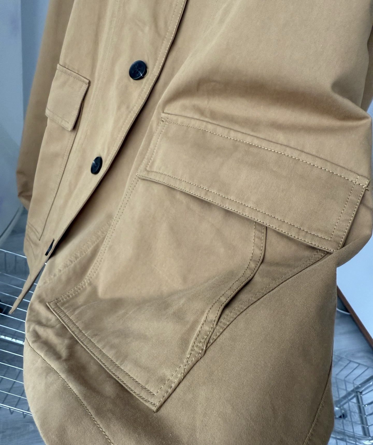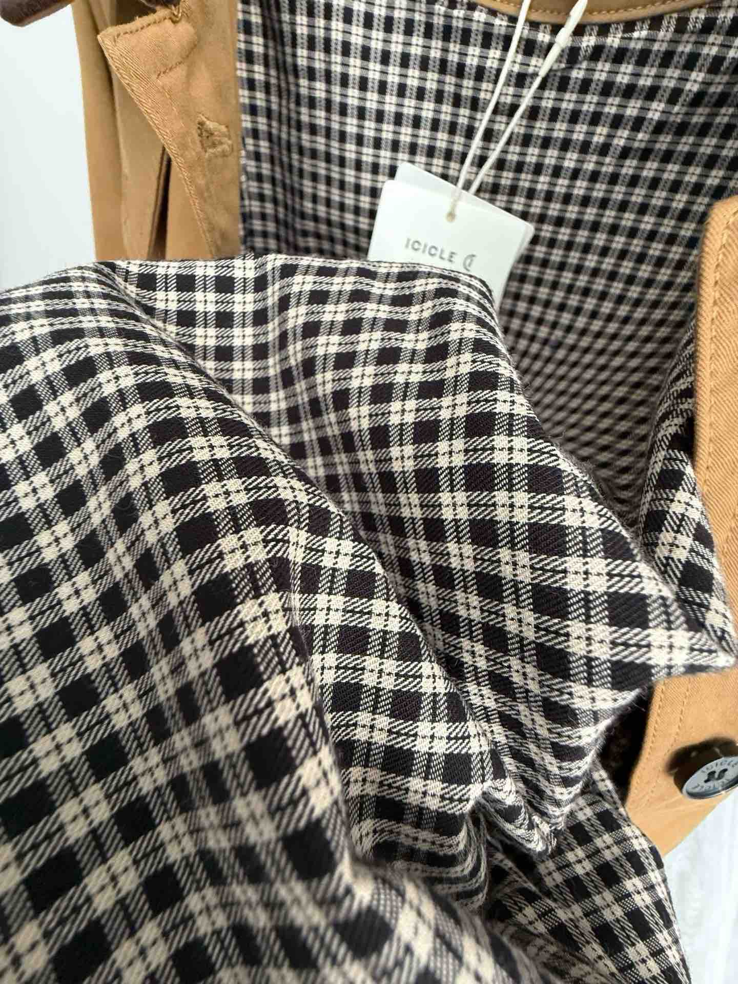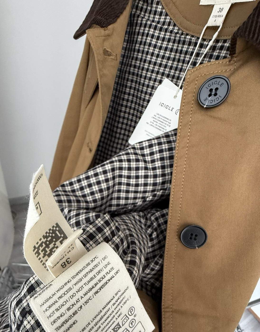 领部是灯芯绒面料,为外套增添了独特的质感和视觉亮点,内搭是磨毛纯棉黑米白格纹面料,保留了猎装原有的元素面料细节,整件衣服精打细磨,简直了~