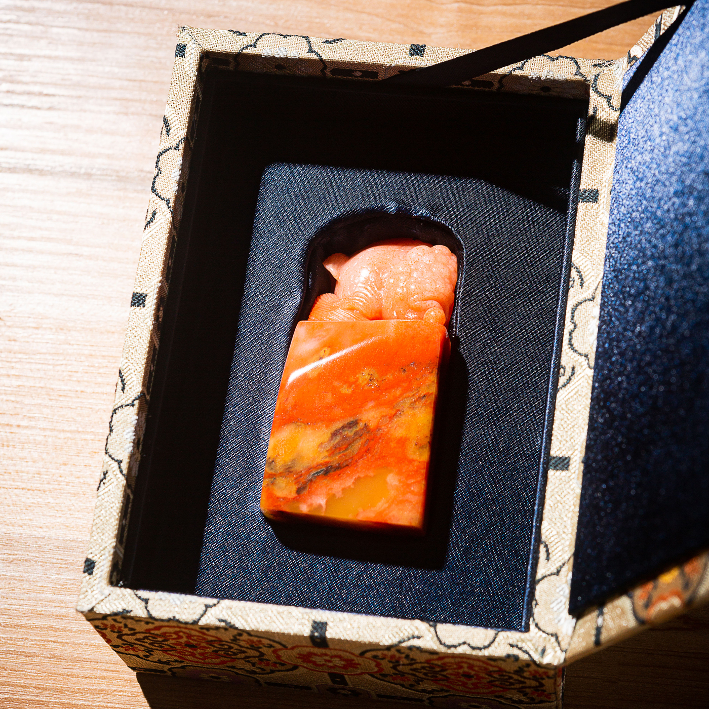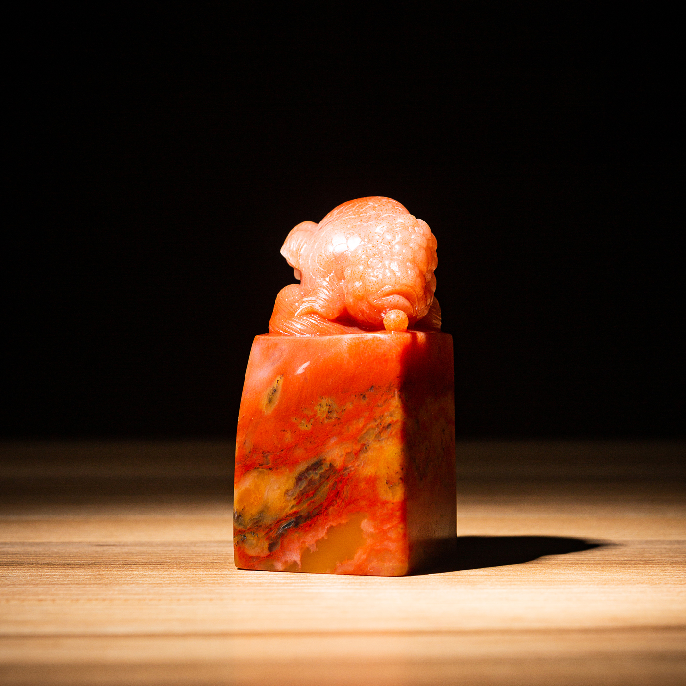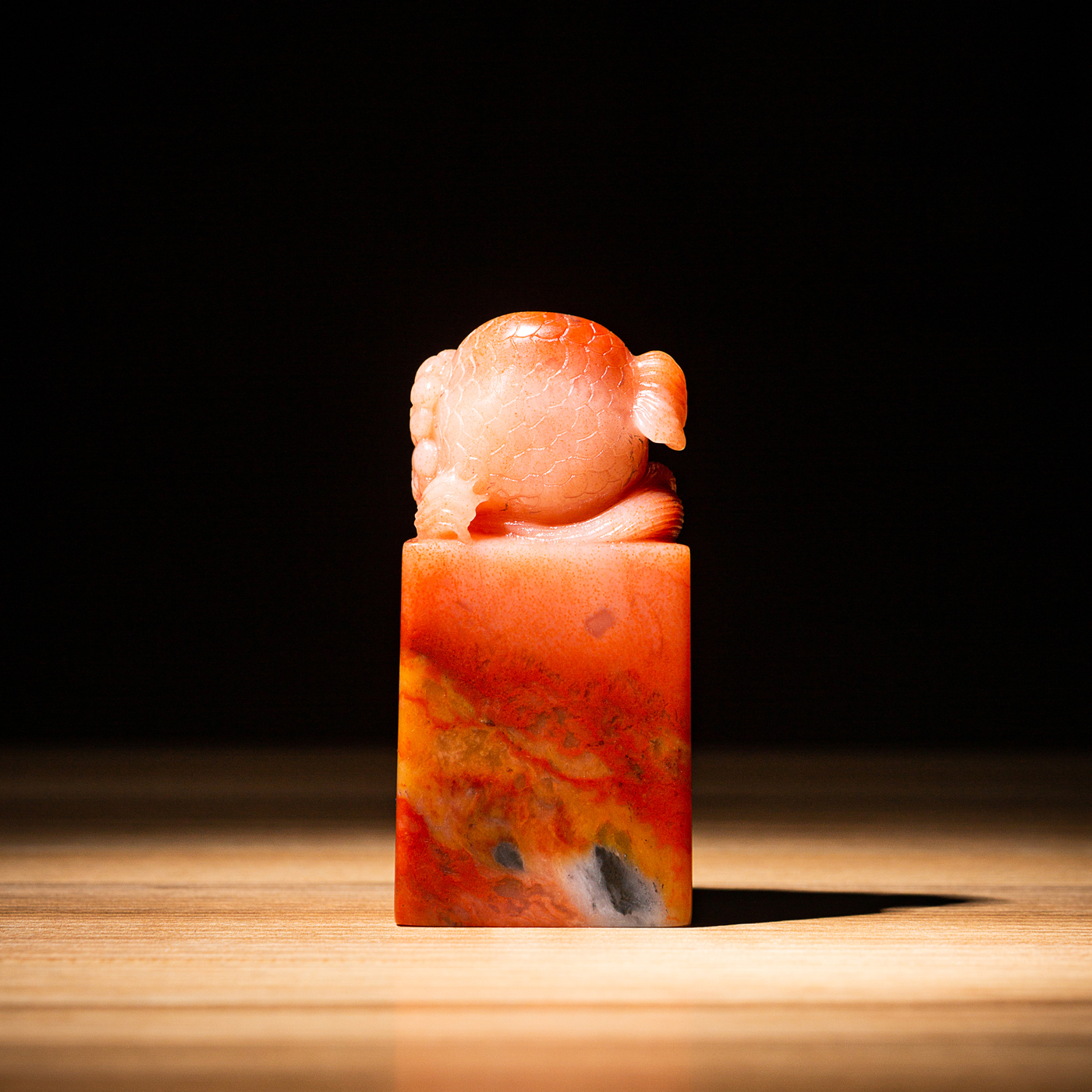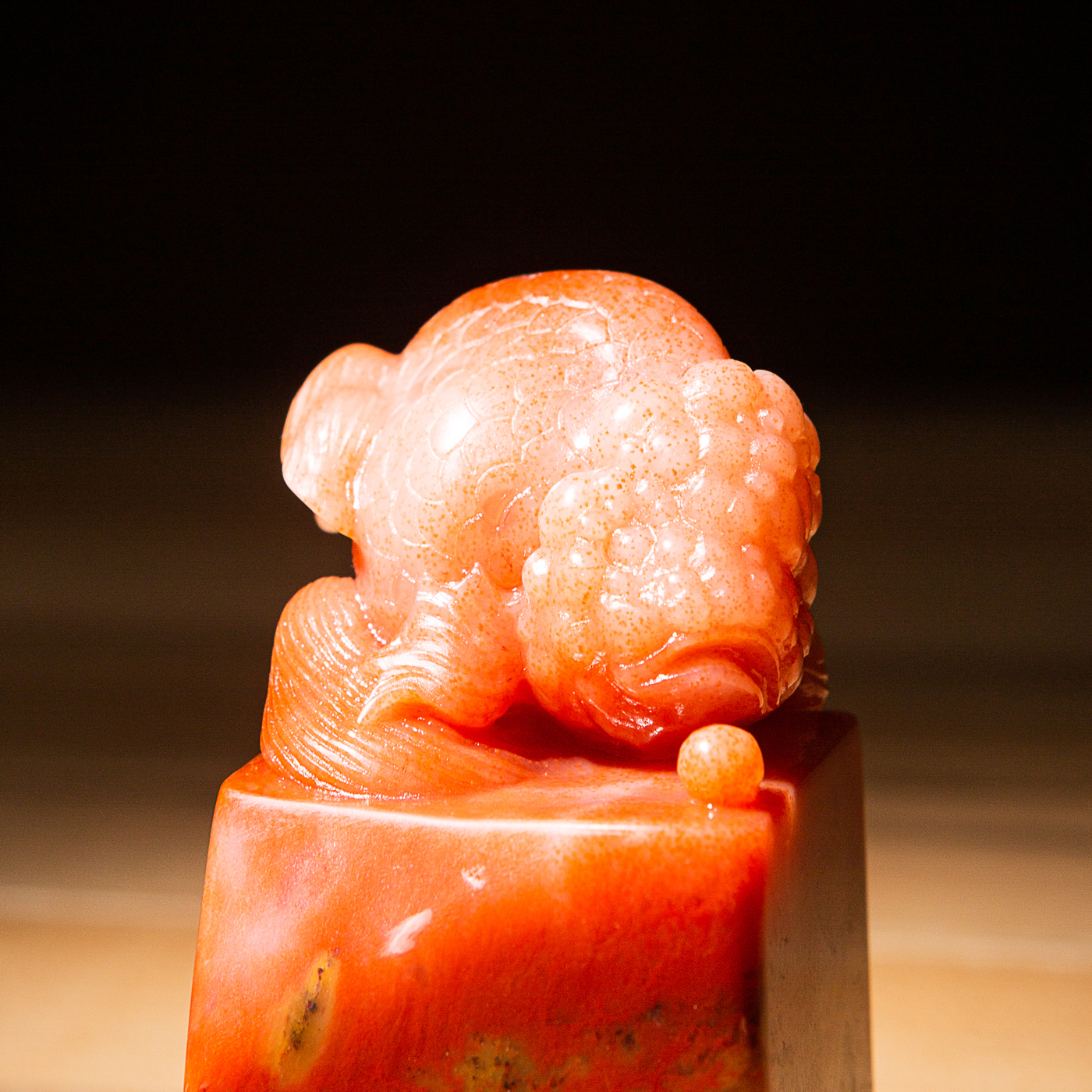 寿山石芙蓉老料雕"兰寿金鱼"方章,选料为存放几十年之老料,料质极佳。其雕工精细,题材刻画生动,极具艺术效果和实用性。