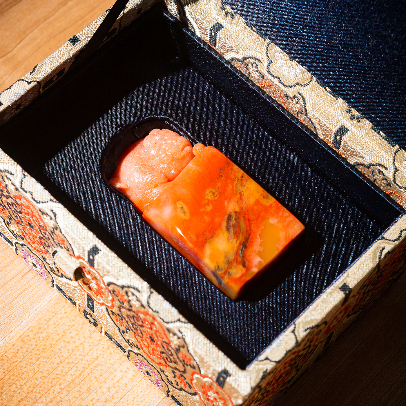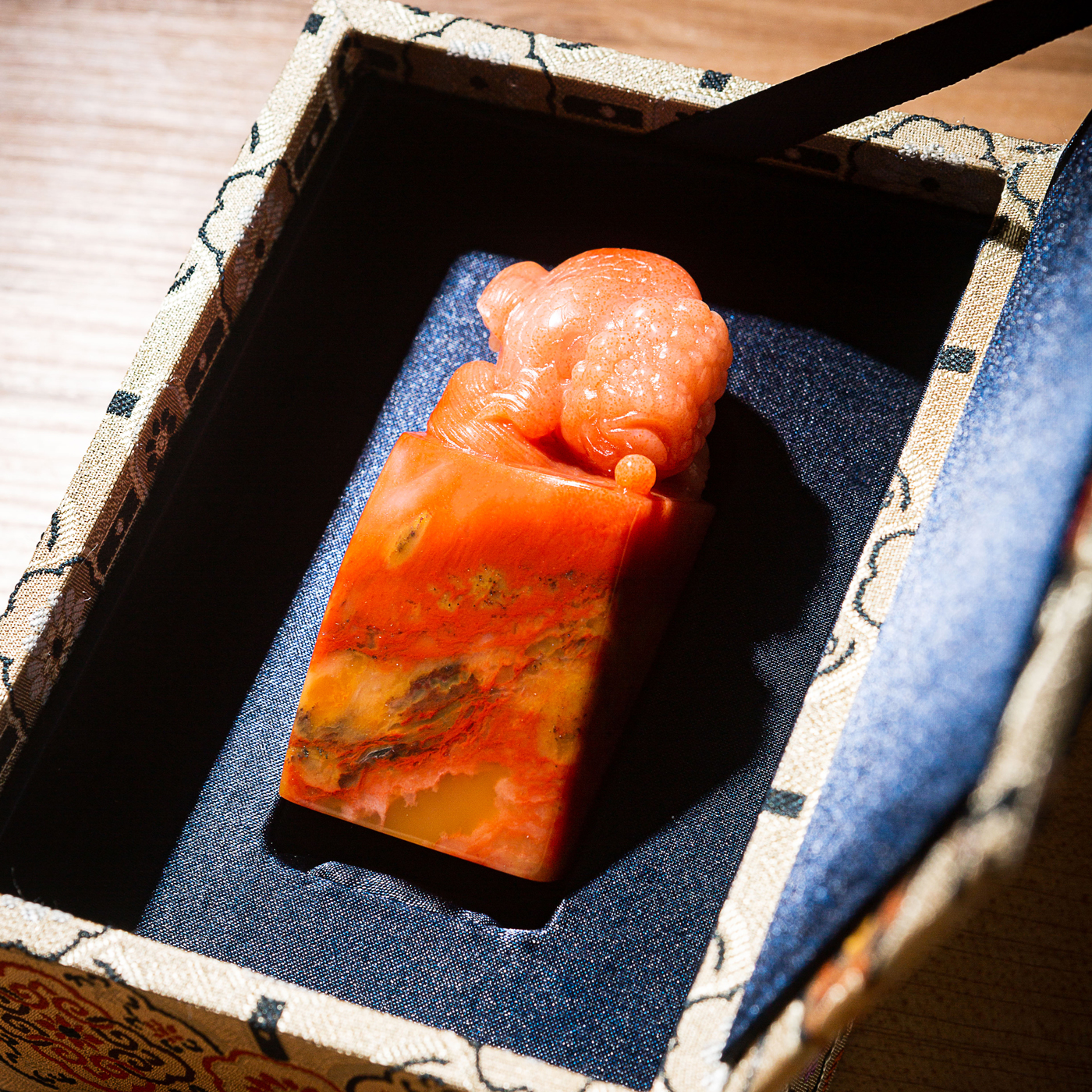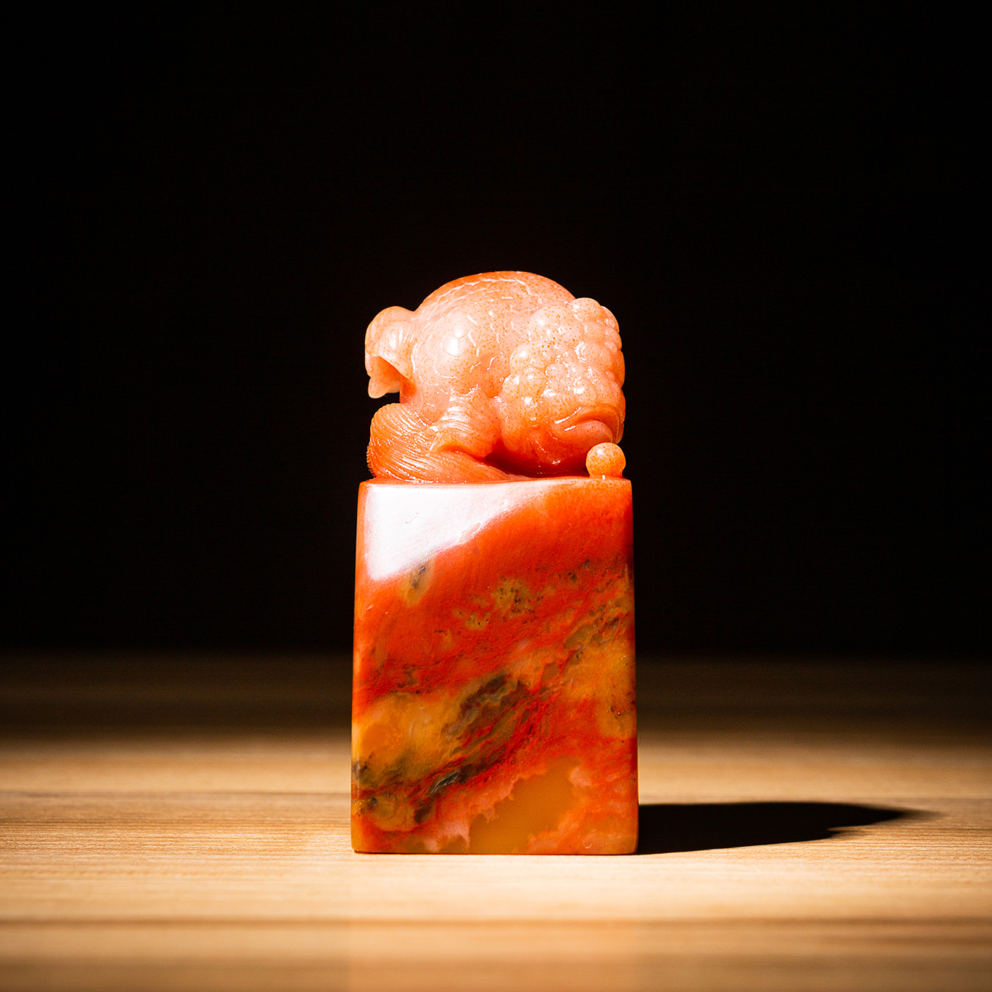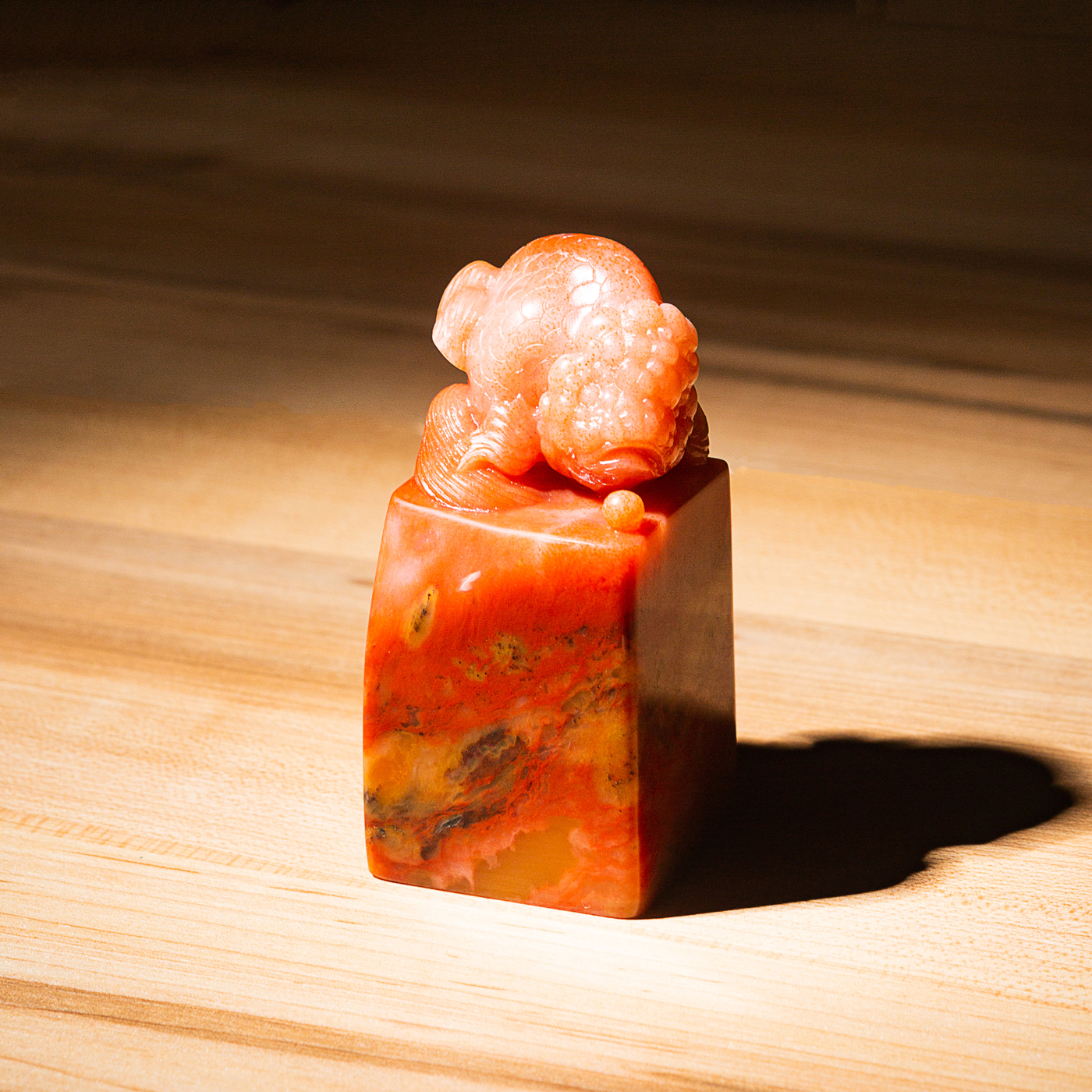 寿山石芙蓉老料雕"兰寿金鱼"方章,选料为存放几十年之老料,料质极佳。其雕工精细,题材刻画生动,极具艺术效果和实用性。