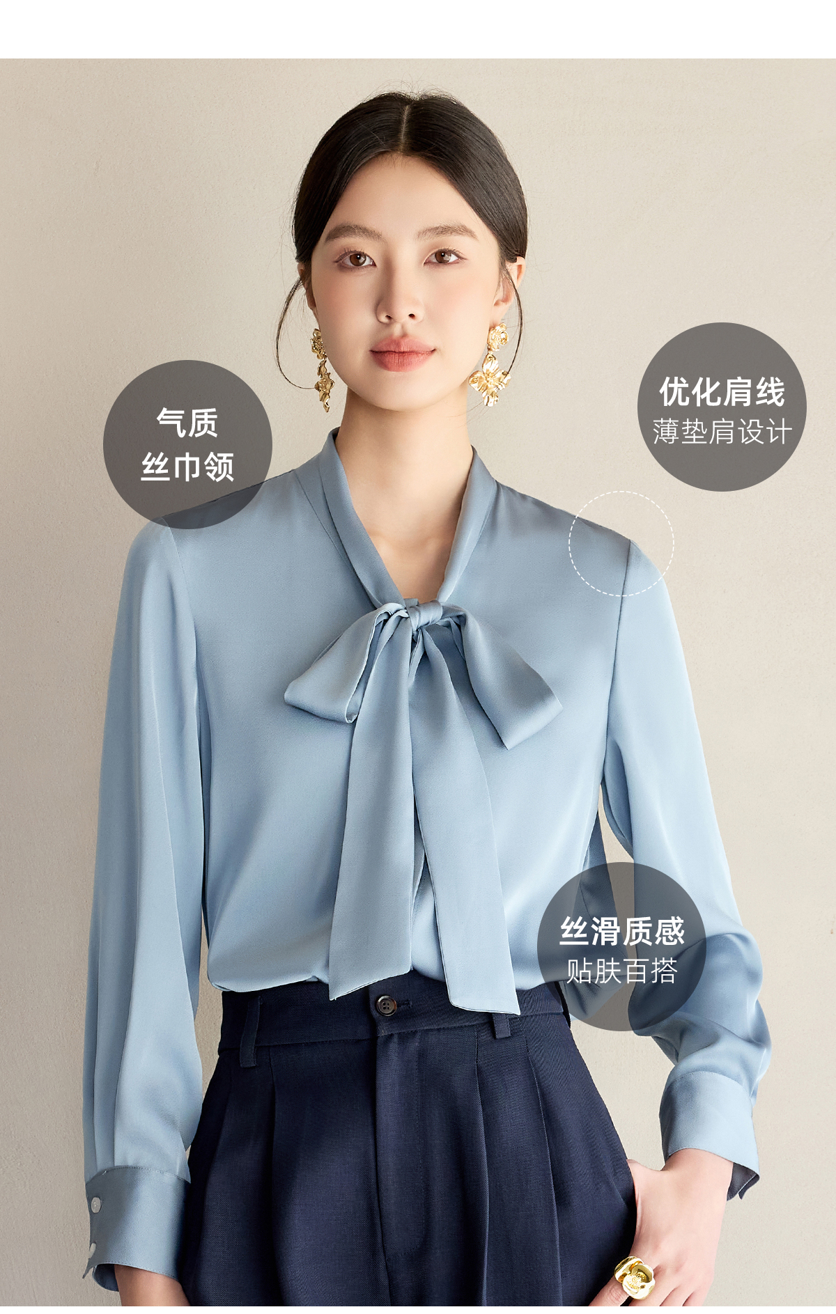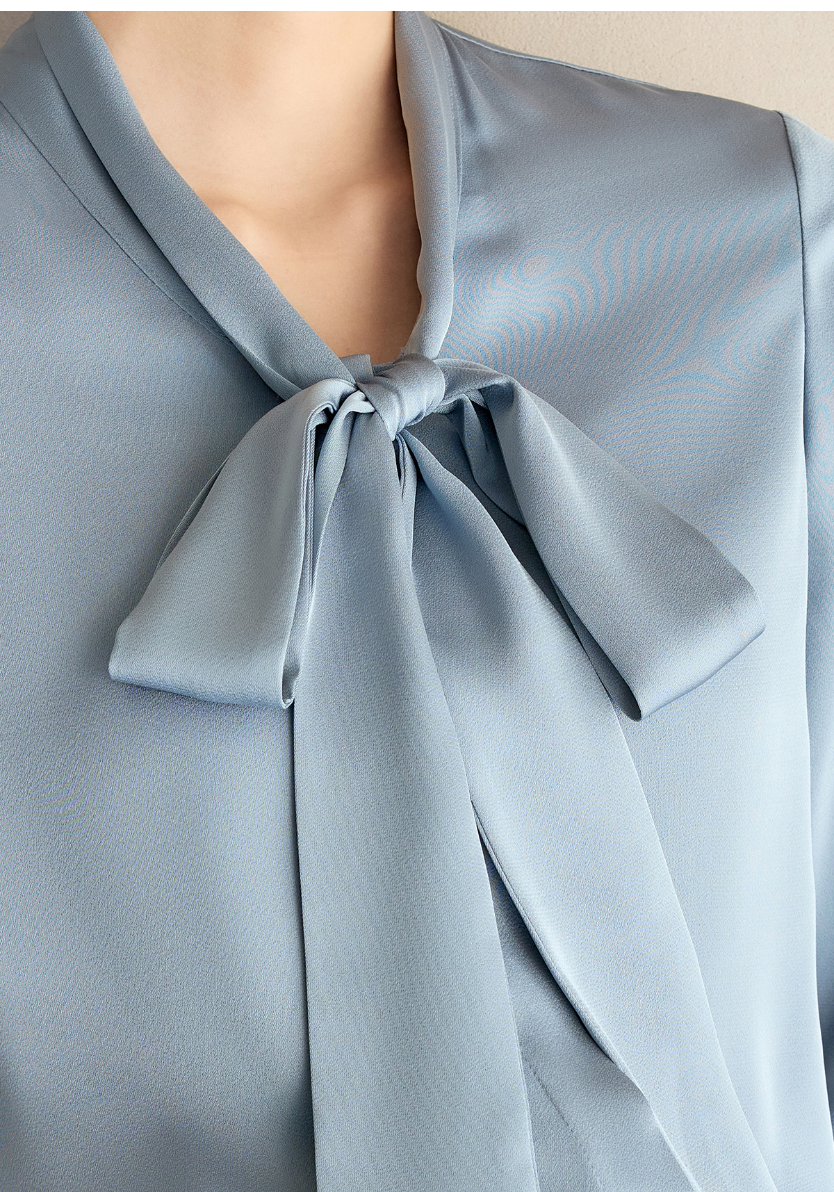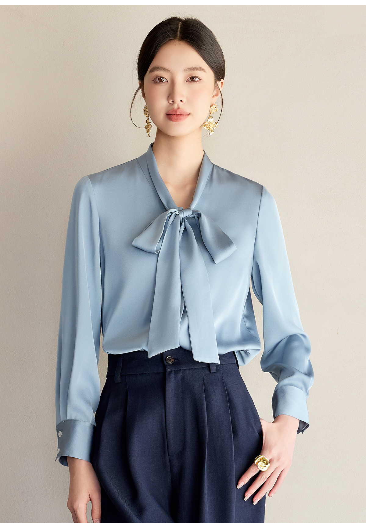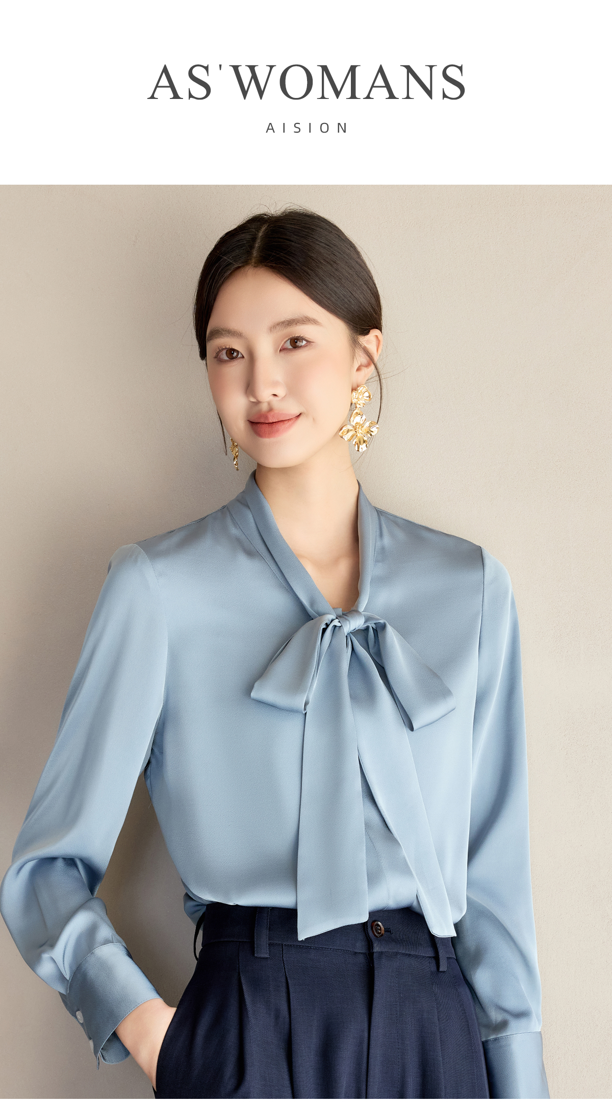 艾尚臣雾霾蓝衬衫女2025年新款蝴蝶结领长袖衬衣早春百搭飘带上衣