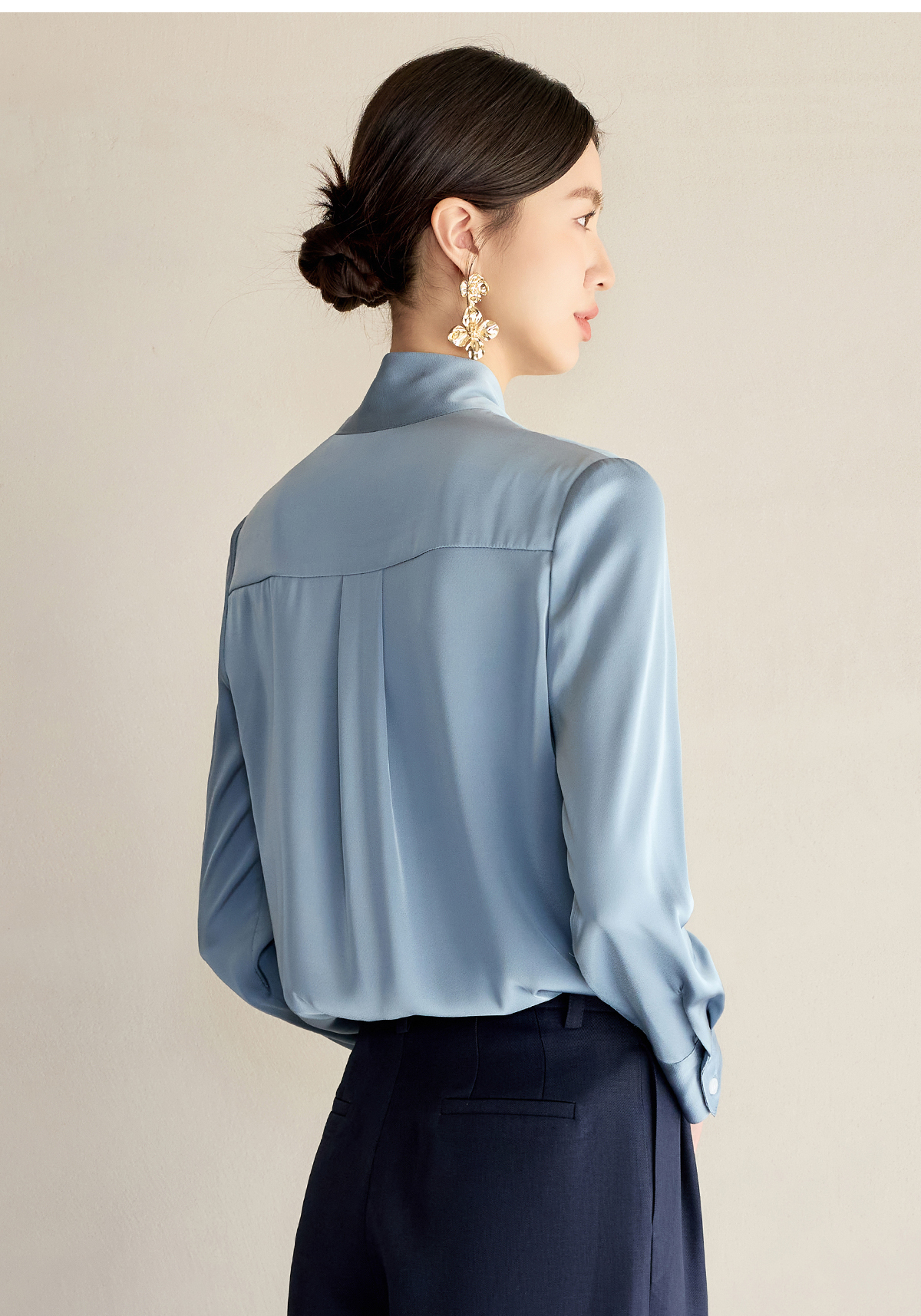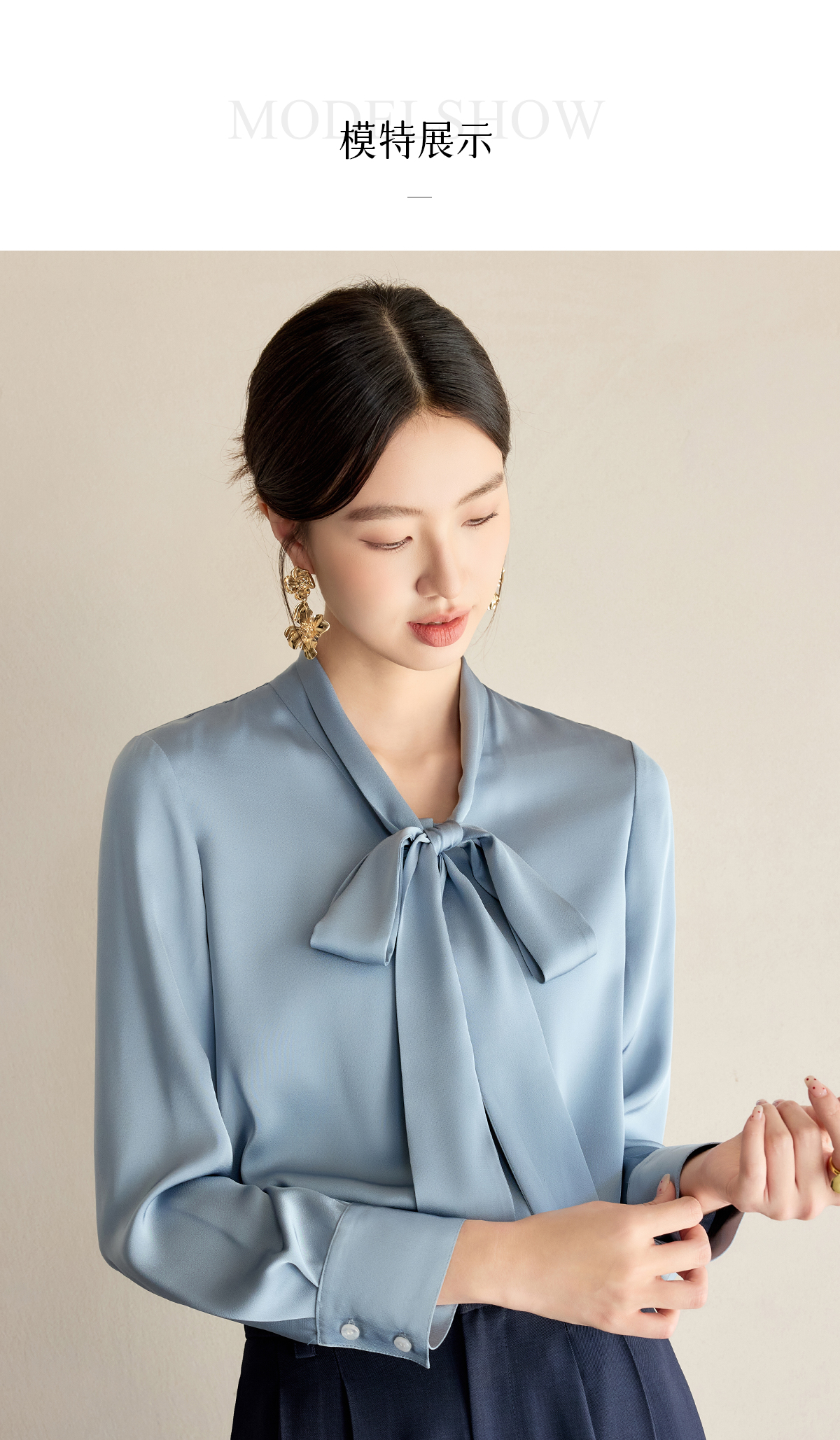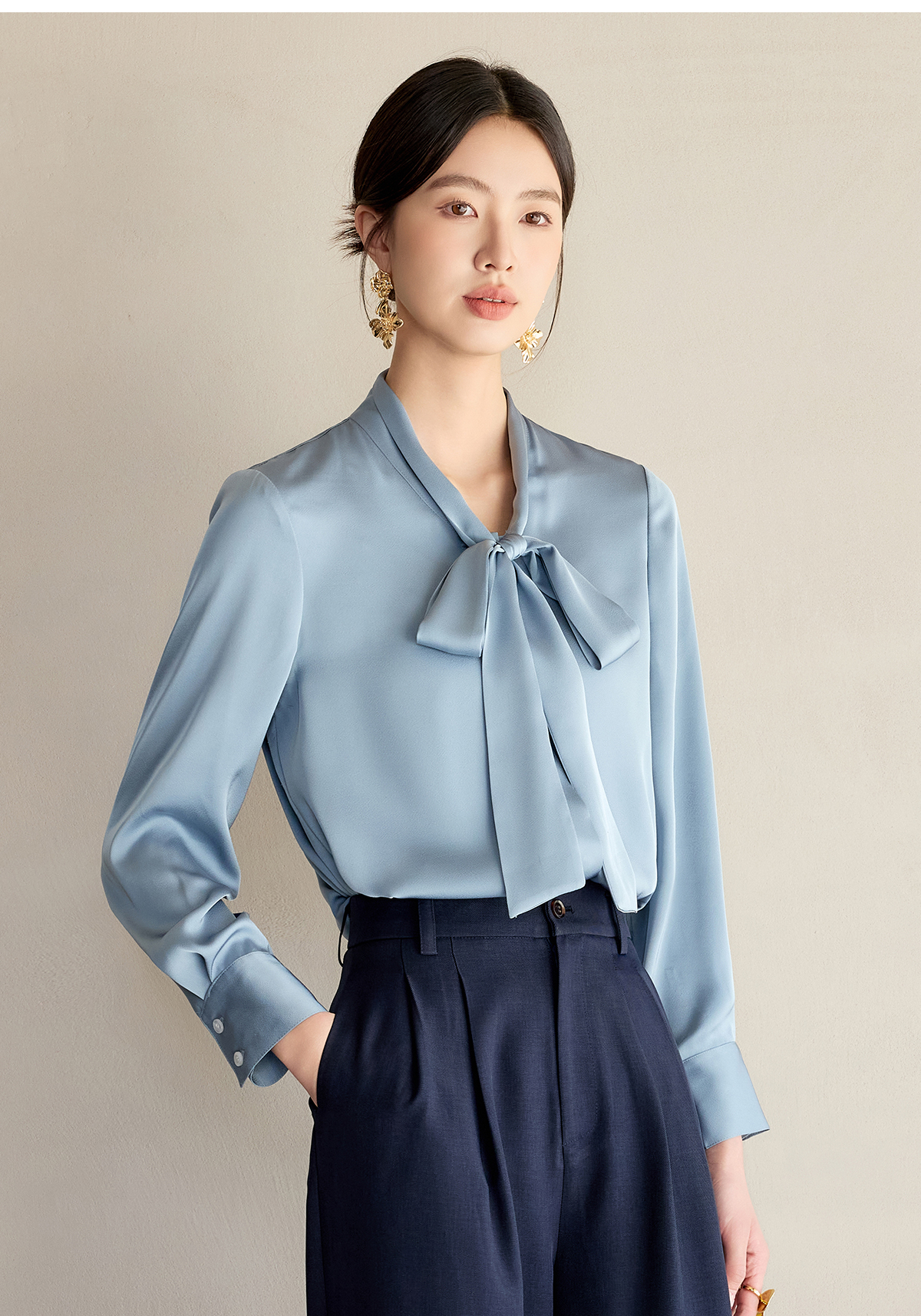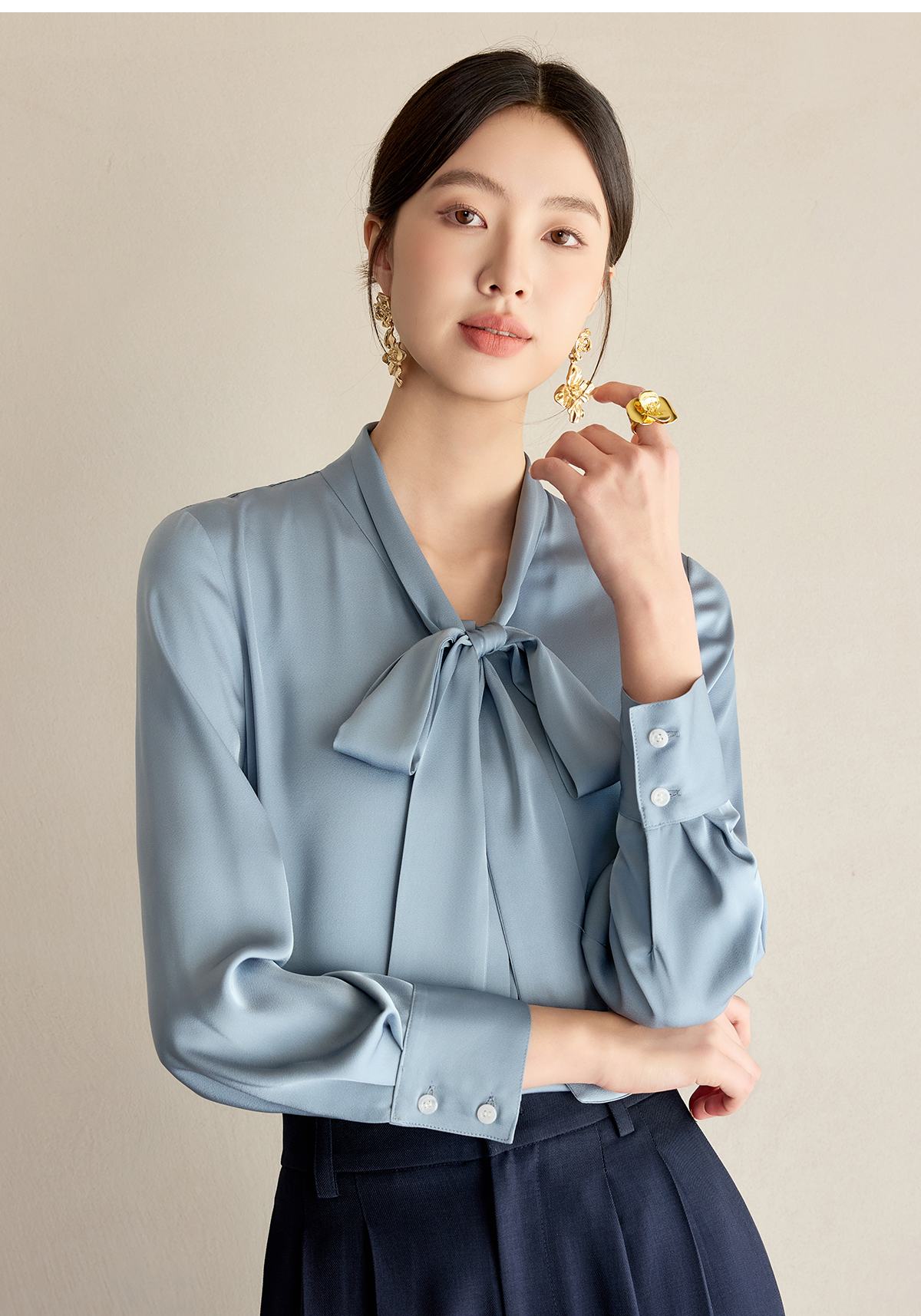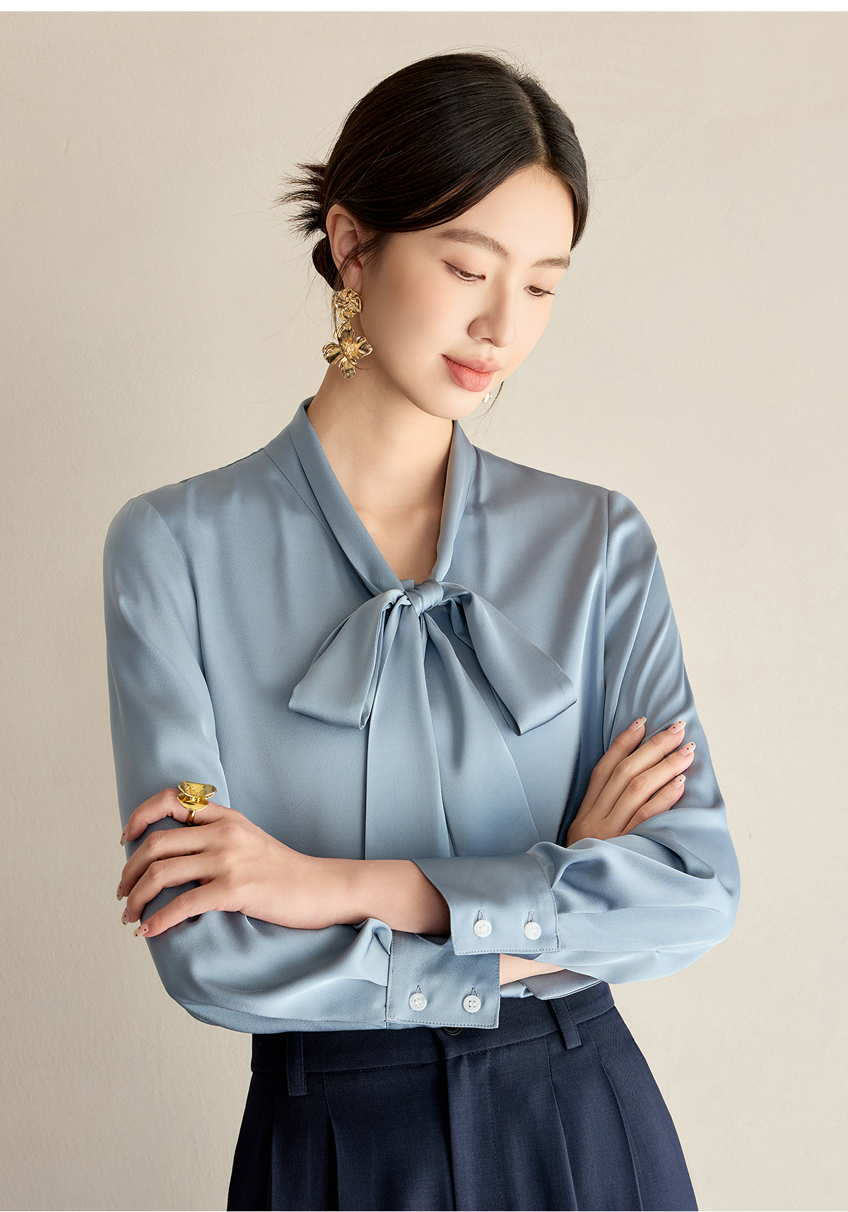 艾尚臣雾霾蓝衬衫女2025年新款蝴蝶结领长袖衬衣早春百搭飘带上衣