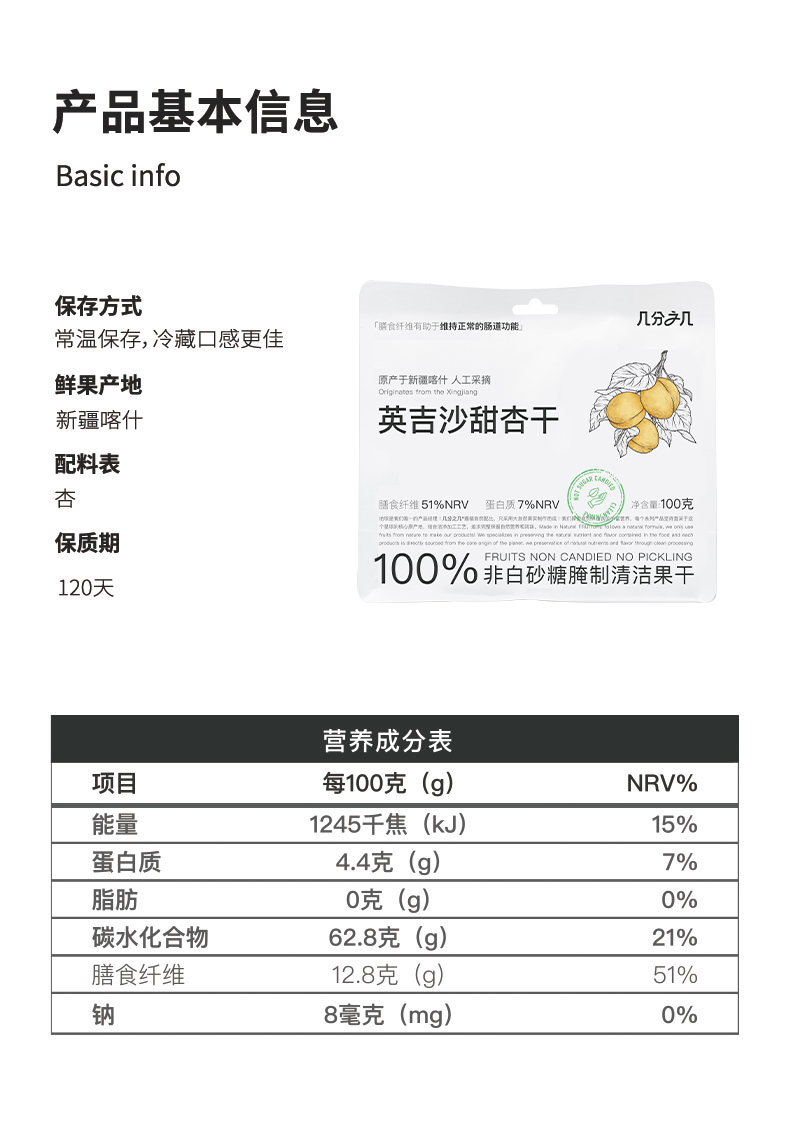 【品名】几分之几 英吉沙甜杏干 自然风味 健康零食 100g/袋 【规格】 100g*2袋 100g*4袋 【产地】国内 【保质期】120天 【发货包装】独立包装 【发货地】上海 【发货快递】圆通、申通、邮政随机发 【不发货区域】新疆、西藏、港澳台 【补邮费地区】内蒙古、宁夏、甘肃、海南+3元 青海+10元 【发货时效】48-72小时,周末节假日顺延 |