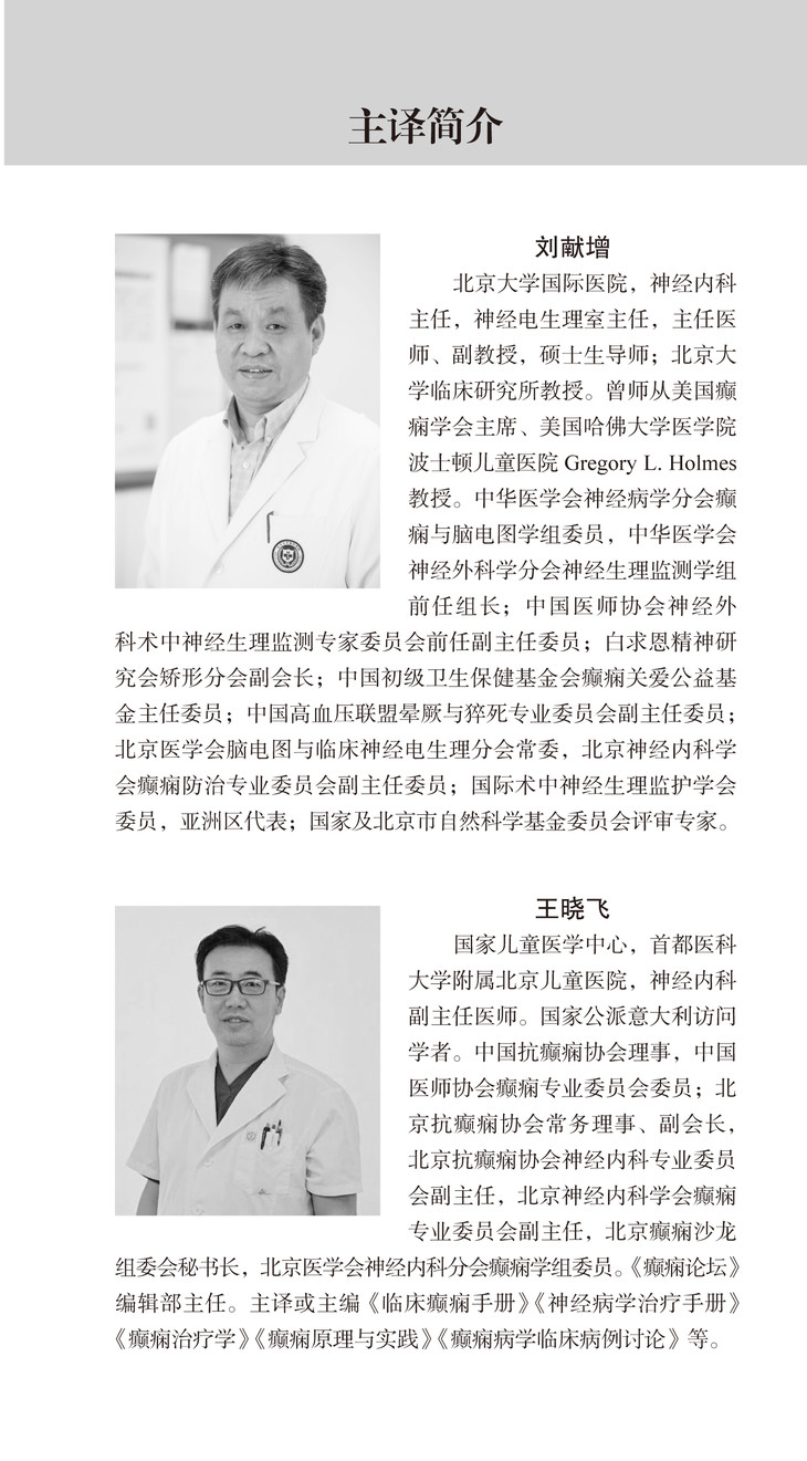 刘献增,北京大学国际医院,神经内科主任,神经电生理室主任,主任医师、副教授,硕士生导师;北京大学临床研究所教授。曾师从美国癫痫学会主席、美国哈佛大学医学院波士顿儿童医院Gregory L Holmes教授。中华医学会神经病学分会癫痫与脑电图学组委员,中华医学会神经外科学分会神经生理监测学组前任组长;中国医师协会神经外科术中神经生理监测专家委员会前任副主任委员;白求恩精神研究会矫形分会副会长;中国初级卫生保健基金会癫痫关爱公益基金主任委员;中国高血压联盟晕厥与猝死专业委员会副主任委员;北京医学会脑电图与临床神经电生理分会常委,北京神经内科学会癫痫防治专业委员会副主任委员;国际术中神经生理监护学会委员,亚洲区代表;国家及北京市自然科学基金委员会评审专家。