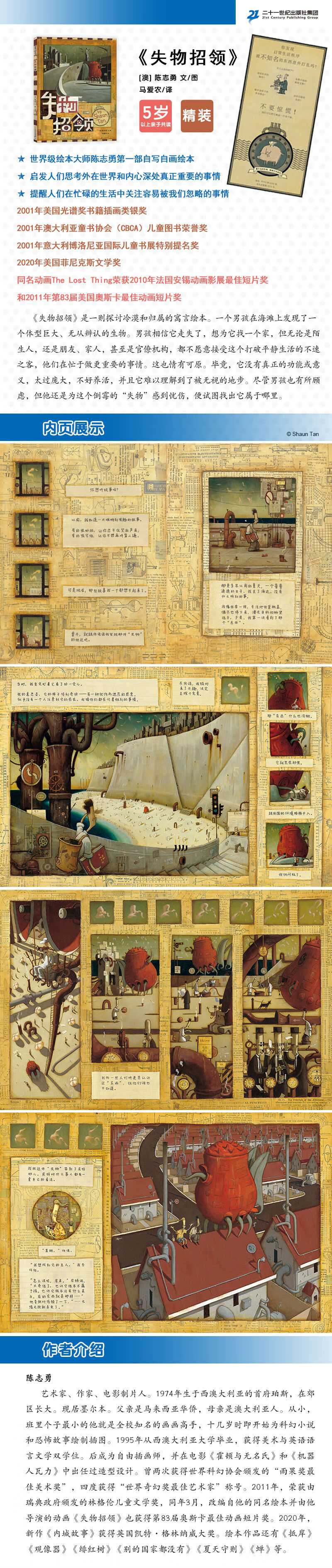 陈志勇极富吸引力和复杂精妙的绘本,总是充满了情感和视觉冲击力,让读者爱不释手。 这个忧郁的故事,尽管充满奇思妙想,结尾却没有为那些存在理由不明的“失物”鼓起太大的希望。 主人公也是第一人称叙事者是一个略显驼背、像迪尔伯特一样的书呆子,他在工业海滩上收集废弃瓶盖时,找到了那个“失物”。 陈志勇将“失物”描绘成一辆垃圾车大小的红色容器,上面有螃蟹般的灰色爪子和触手,像锅炉和章鱼的结合。 当然,它太奇怪了,却不被注意,每个人都忽略了它。男孩对“失物”就像和自己的宠物狗一样互动,玩取物游戏,制作沙堡。在他阴暗的后院工具棚里喂它吃完东西后,“英雄”试图把它送到没有窗户的“联邦稀奇古怪事物终结所”。 然而他无法忍受把它留在那里。一位半机器半人的清洁工给了男孩一个带箭头的卡片。 通过努力,他才找到清洁工建议的庇护所,是一个达利式的被遗忘事物的居所,有很多稀奇古怪玩耍的怪物。陈志勇错综复杂的综合媒材绘画参考了画家爱德华;霍普的空荡荡的街边橱窗和导演弗里茨;朗的科幻片《大都会》中疏离的城市景观。 这本书适合 7 岁以上儿童、青少年或成人漫画/科幻小说读者,他们会被奇妙的插图惊呆。——《出版人周刊》
