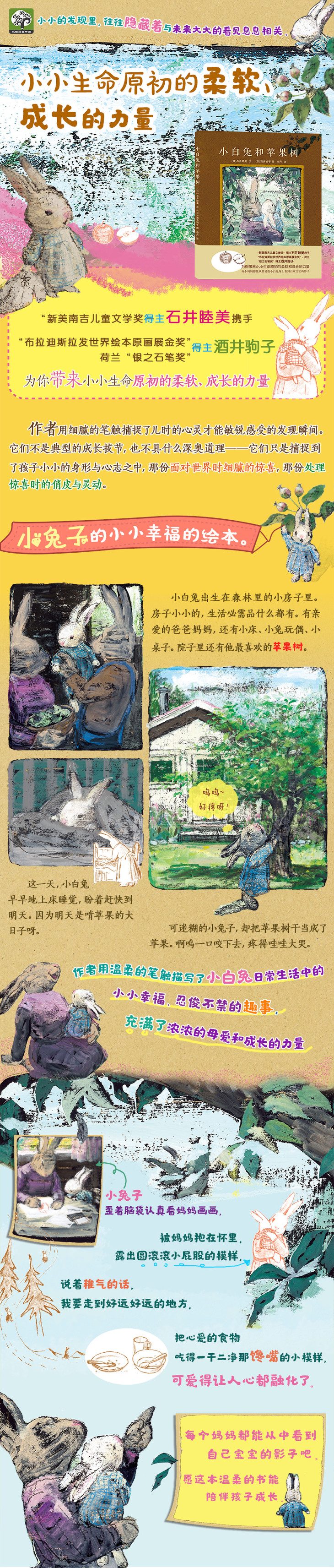 小白兔出生在森林里的小房子里。房子小小的,生活必需品什么都有。有亲爱的爸爸妈妈,还有小床、小兔玩偶、小桌子。院子里还有他最喜欢的苹果树。这一天,小白兔早早地上床睡觉,盼着赶快到明天。因为明天是啃苹果的大日子呀。作者用温柔的笔触描写了小白兔日常生活中的小小幸福、让人忍俊不禁的趣事,充满了浓浓的母爱和成长的力量。