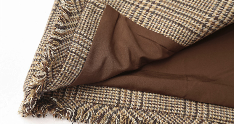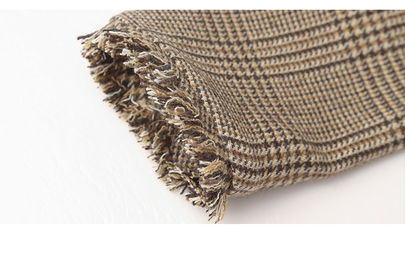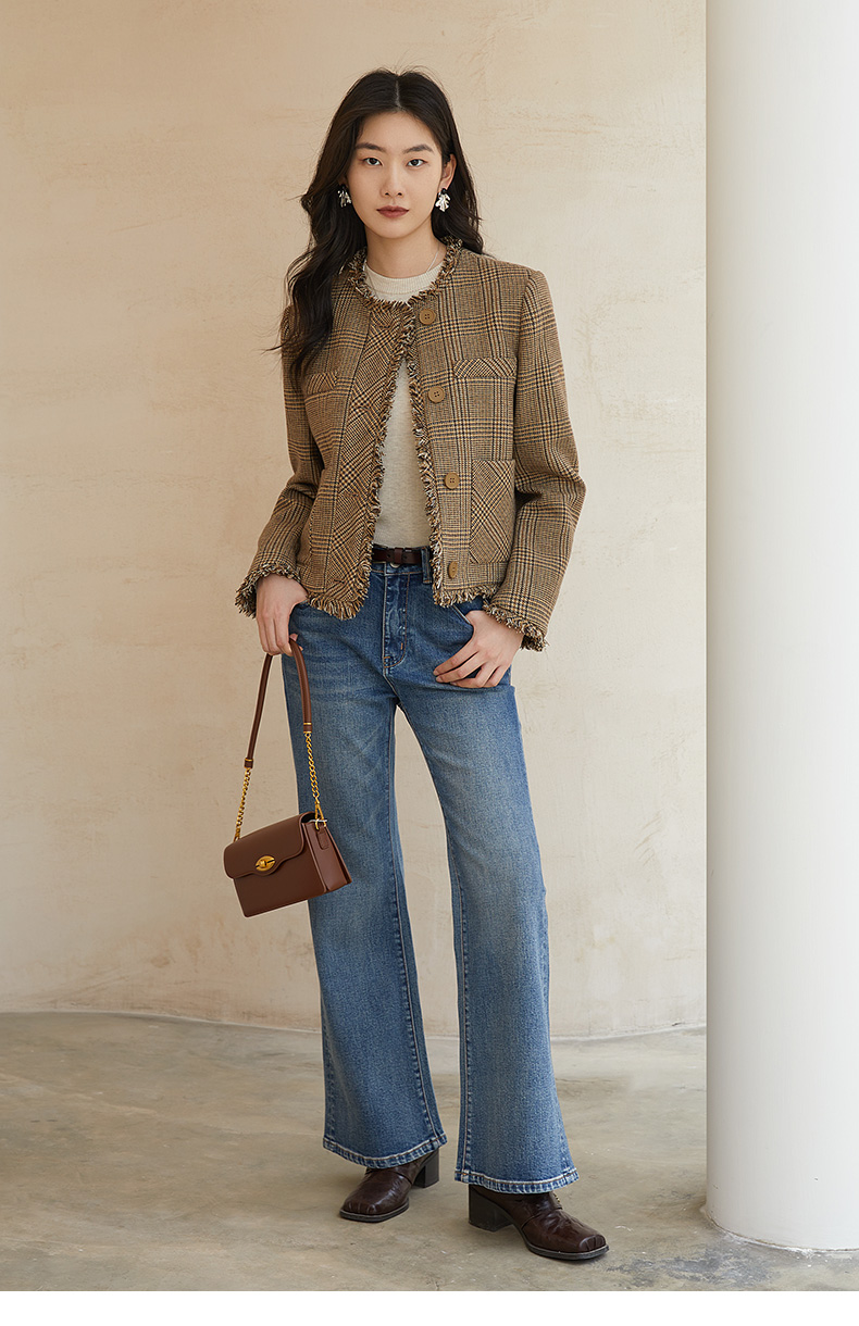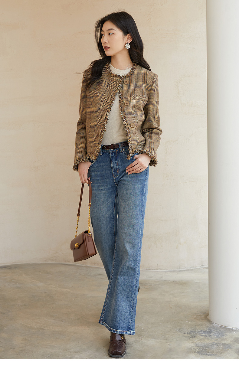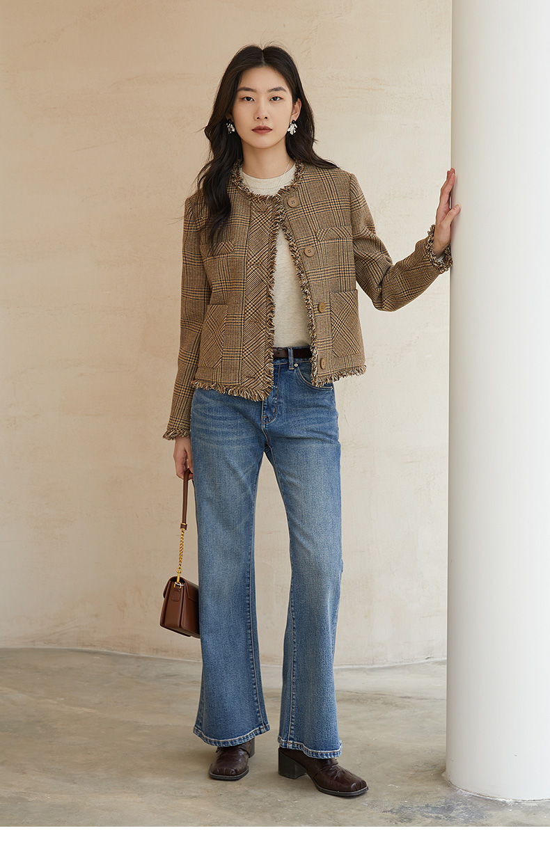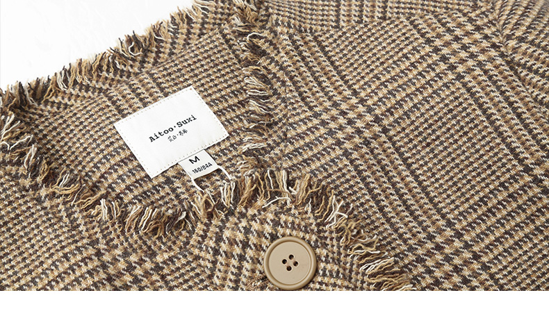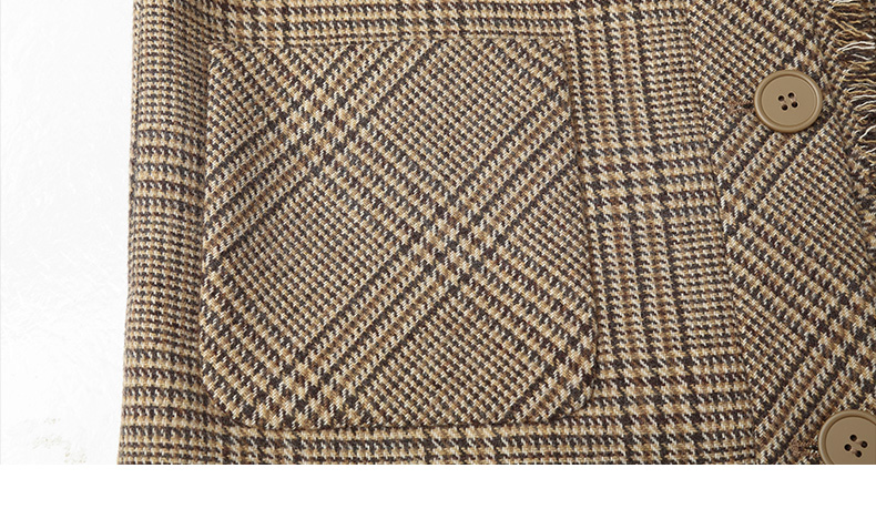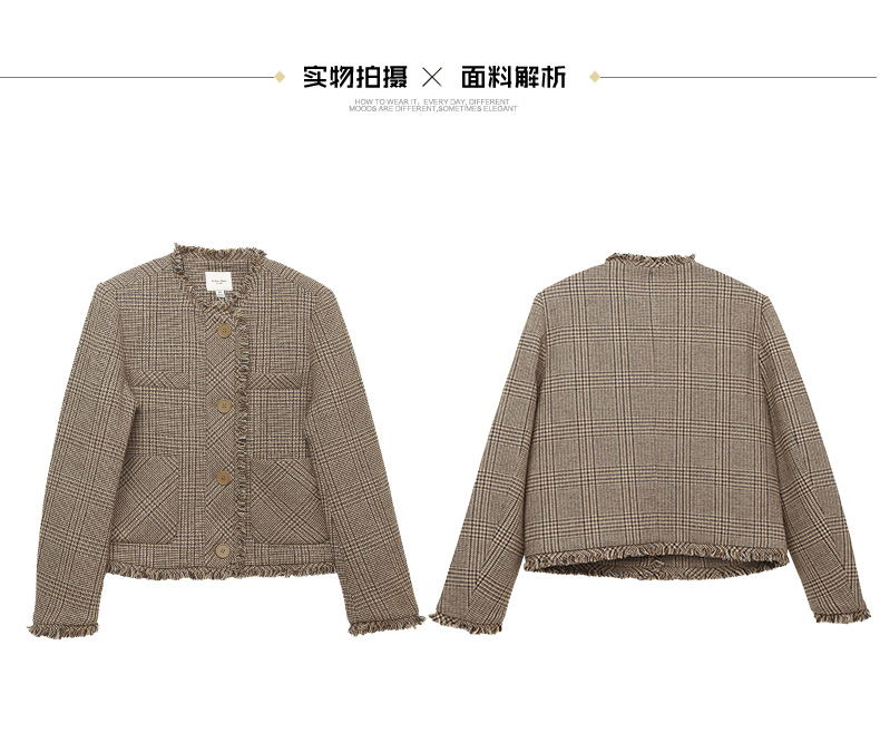 卡其格纹毛边圆领短款外套 秋冬复古小香风多口袋单排扣长袖上衣
