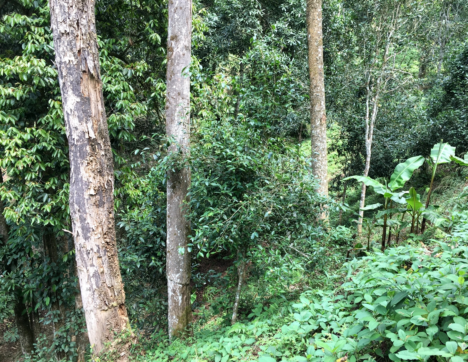 易武片区内质丰厚的古树茶大多散布于荒生林中,茶树与周边深林共生,森林茂密,茶树为获取阳光向上生长,高杆如电线杆状。