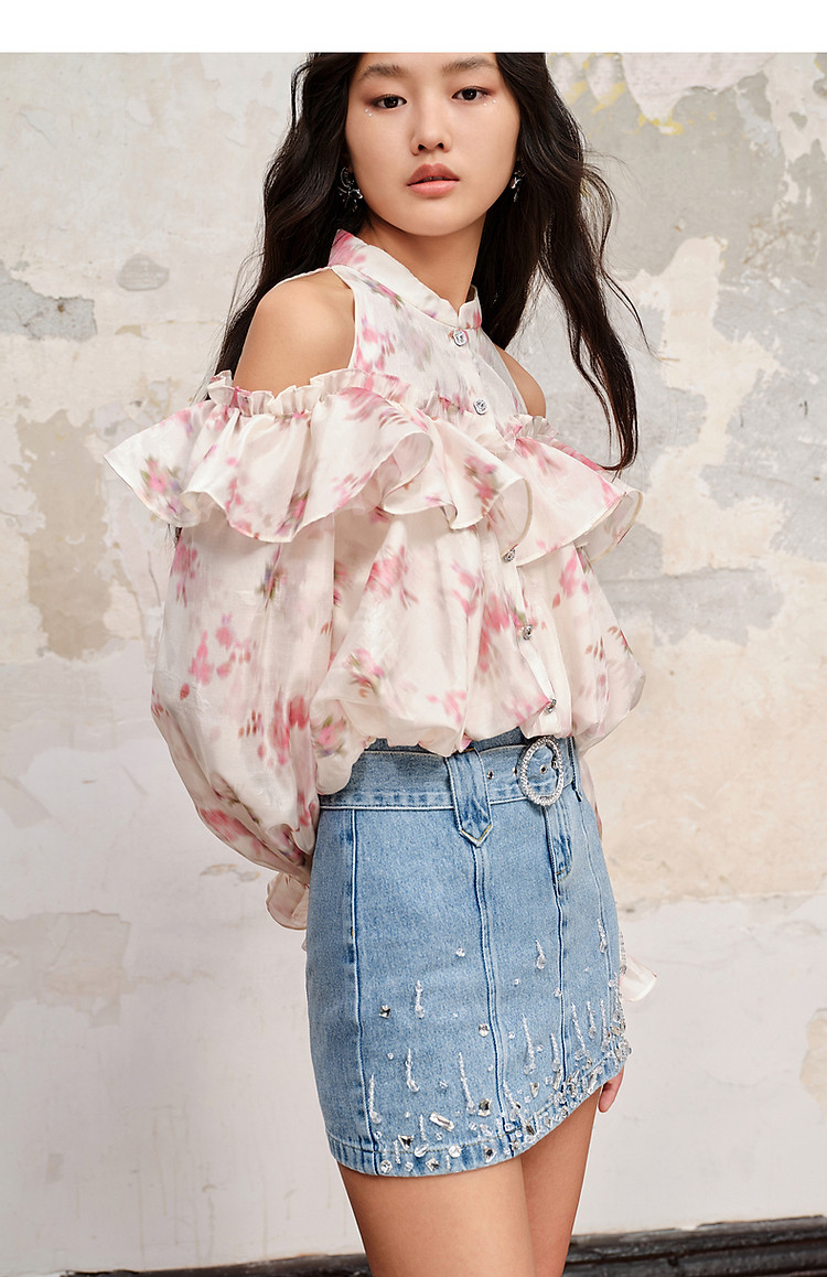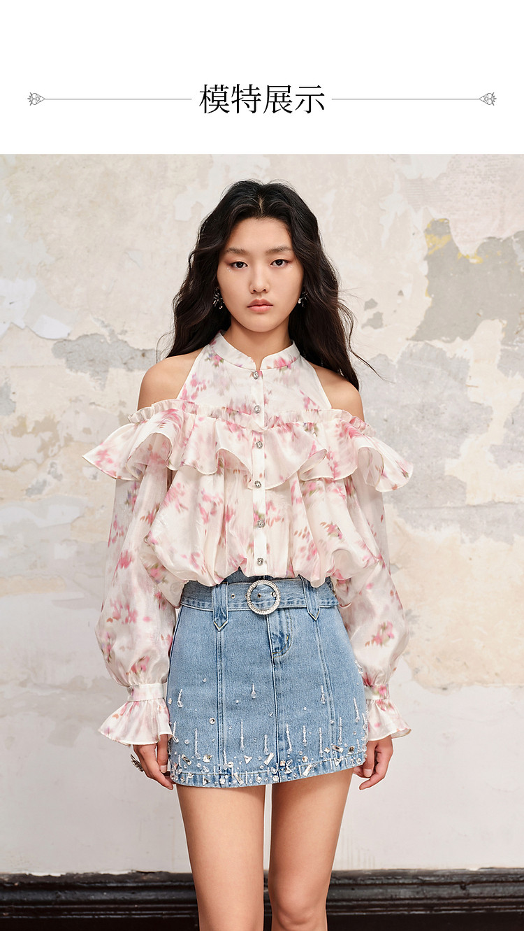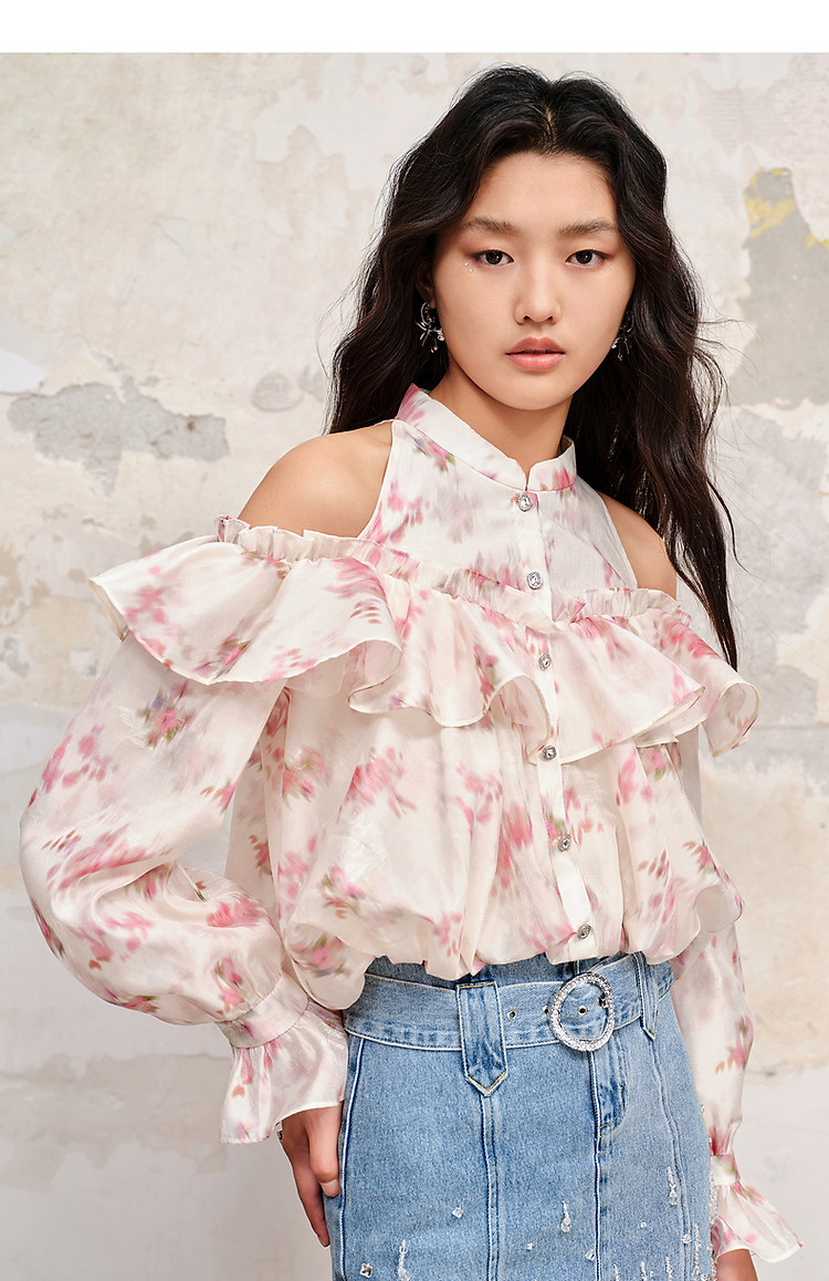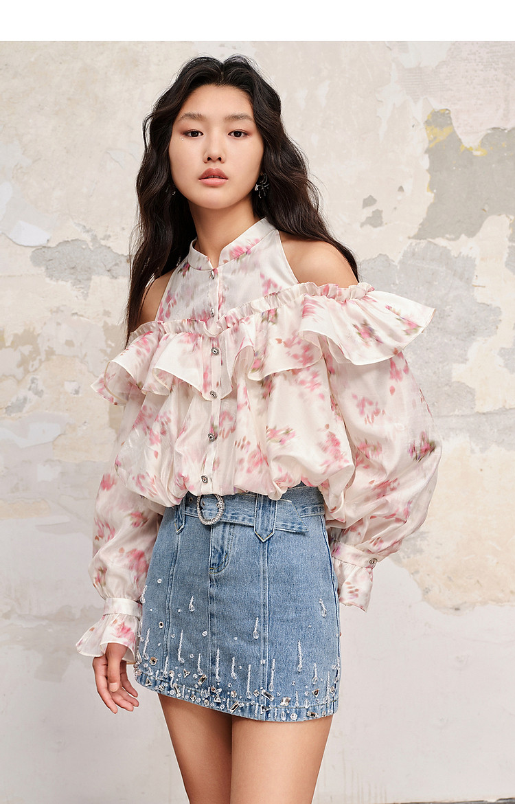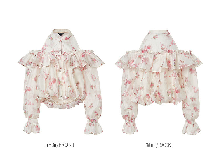 甜美浪漫感晕染印花挂脖荷叶边长袖上衣MC88TP612