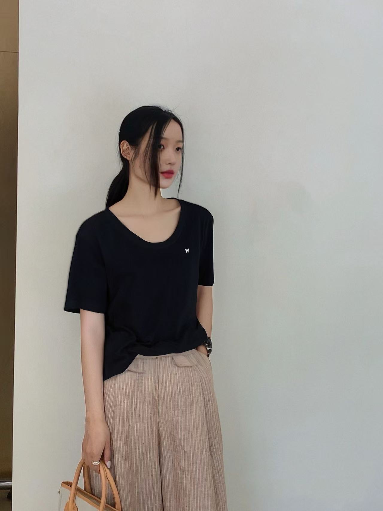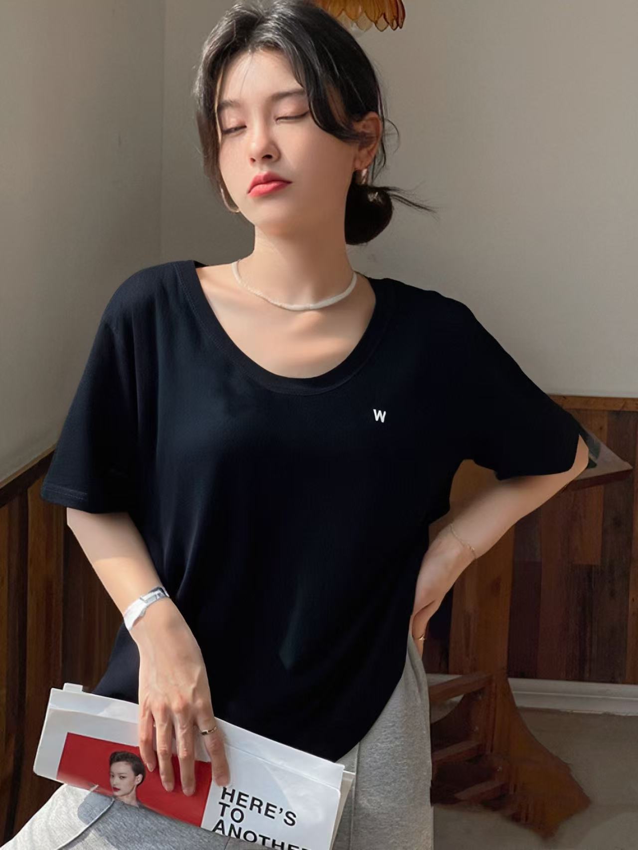 清仓价2025~W刺绣230137小标U 领黑色短袖T恤-喜出