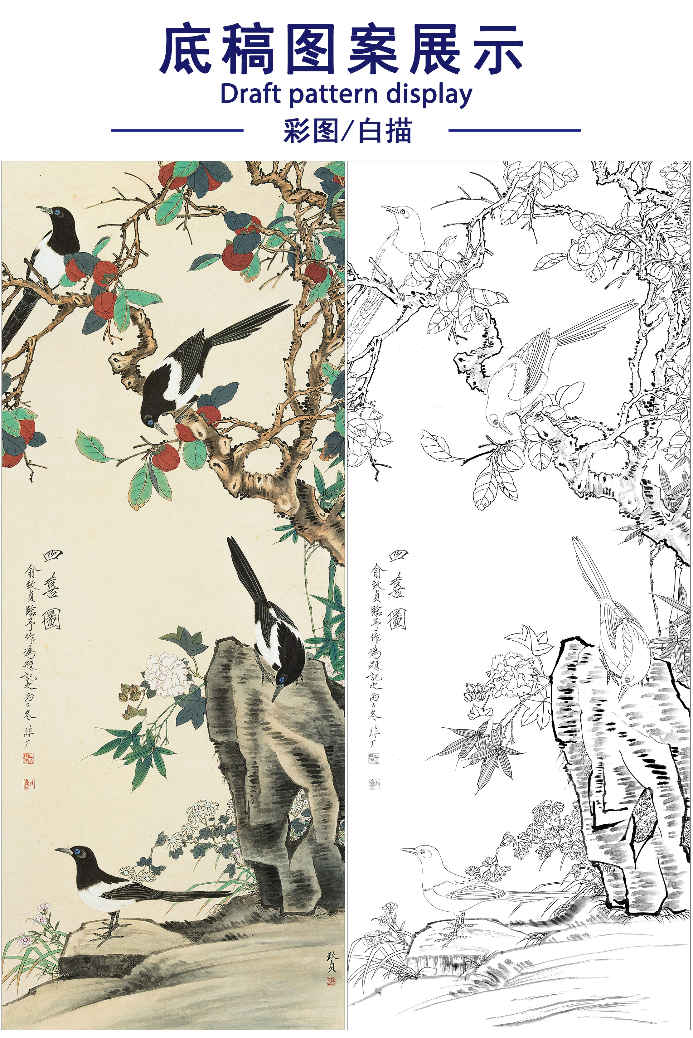 俞致贞花鸟工笔画白描底稿《四喜图》喜鹊临摹勾线高清打印稿ZZ66