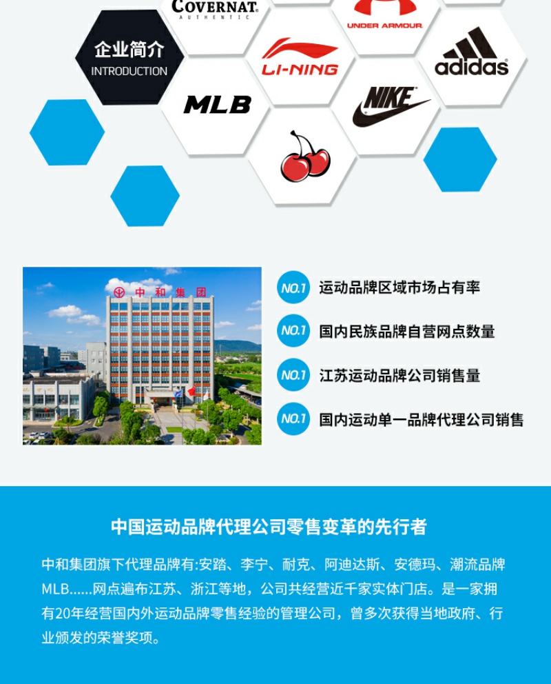 - 中和集团旗下代理安踏、李宁、耐克、安德玛、耐克、中国李宁、MIB等运动时尚品牌,网点遍布江苏、浙江、湖北等身份