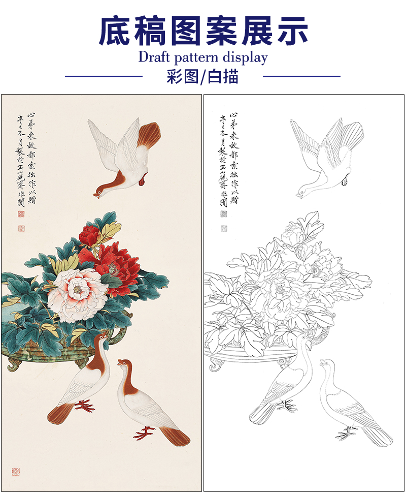 于非闇花鸟工笔画白描底稿《和平富贵图》临摹勾线高清打印稿HS33
