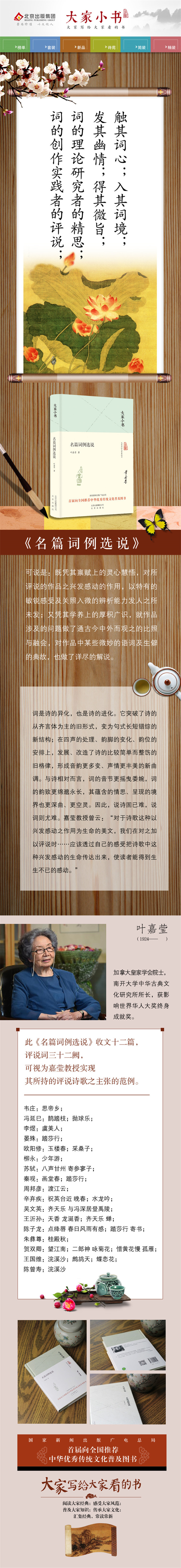 叶嘉莹,号迦陵,1924年生于北京,中国古典文学研究专家。曾任美国哈佛大学、密歇根大学及哥伦比亚大学客座教授,加拿大不列颠哥伦比亚大学终身教授,并受聘于南开大学、四川大学、北京师范大学等国内多所大学客座教授及中国社会科学院文学所名誉研究员。1991年,在南开大学创办比较文学研究所,后任南开大学中华古典文化研究所所长。著有《唐宋词十七讲》《杜甫秋兴八首集说》《迦陵诗词稿》《我的诗词道路》等,有《迦陵文集》(10卷)、《叶嘉莹作品集》(24卷)行世。