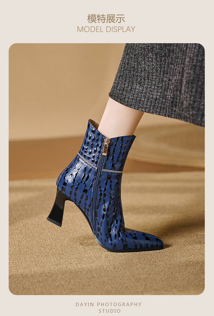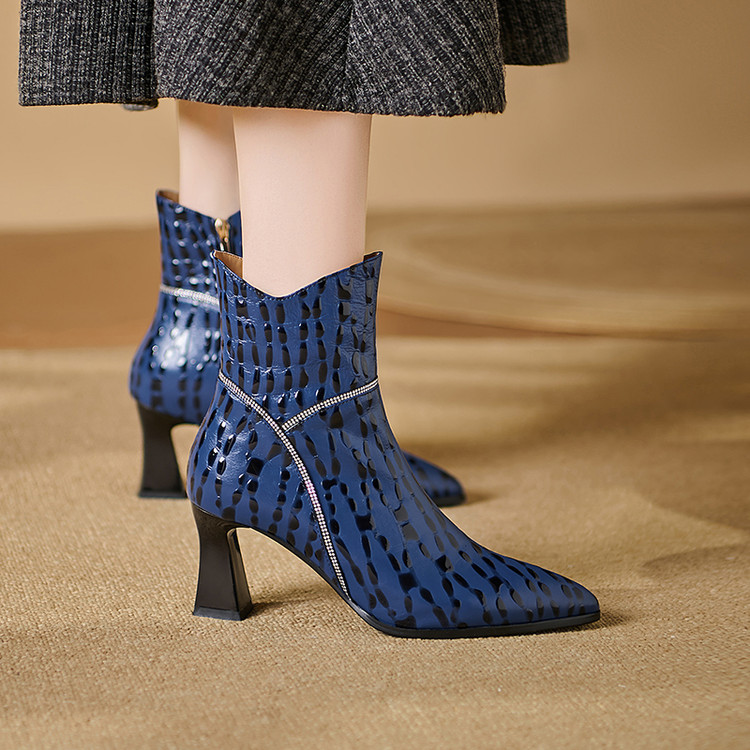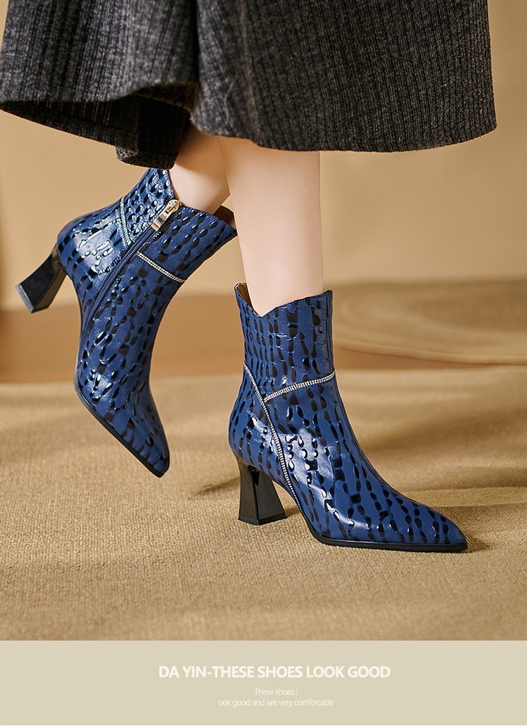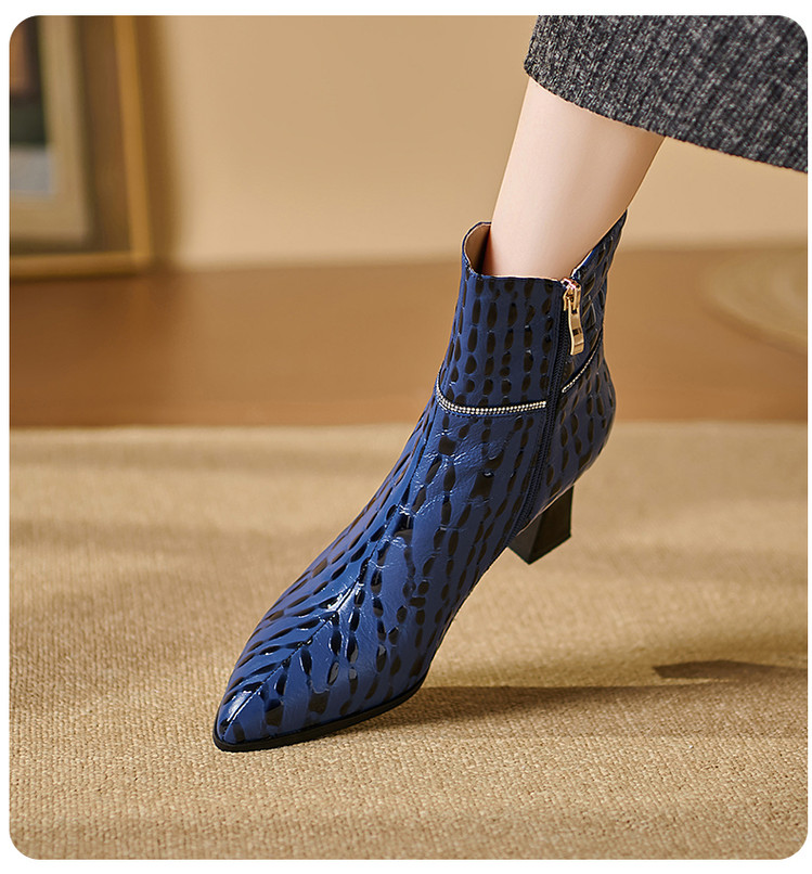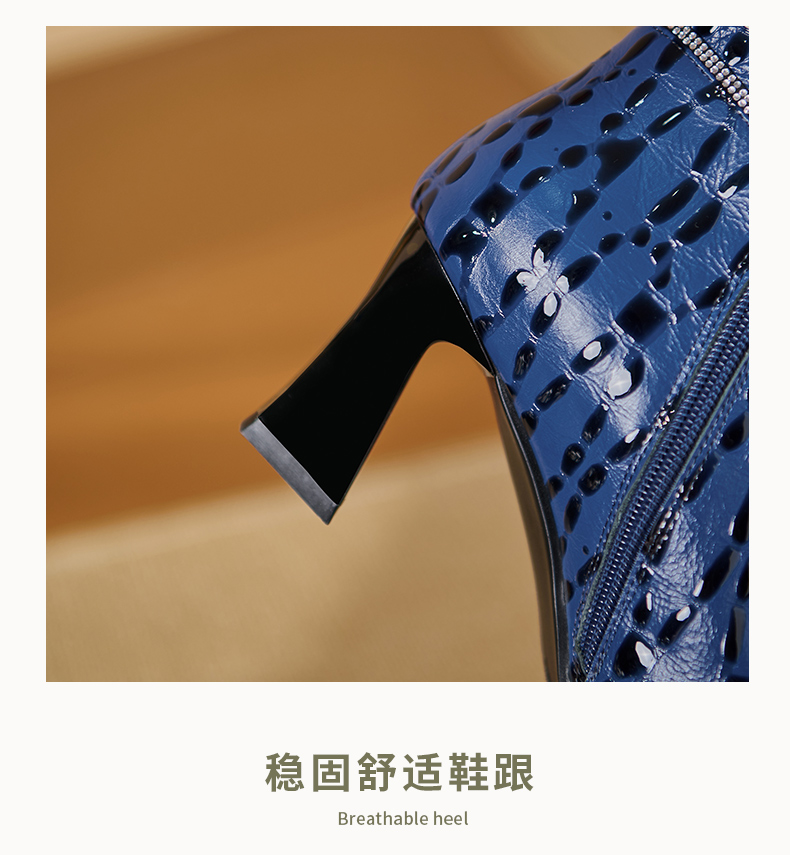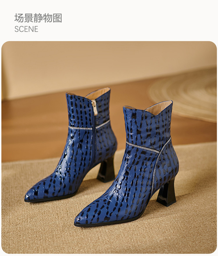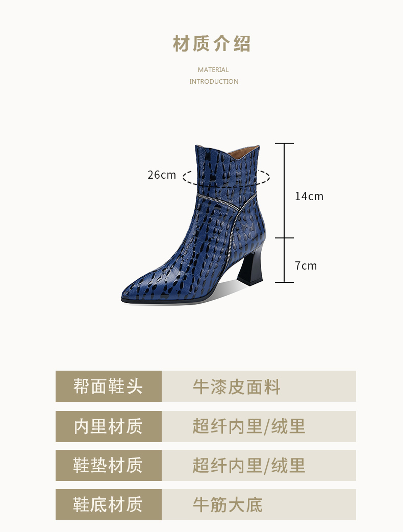 【预售5天】蓝色真皮短靴女士粗跟马丁靴秋冬新款加绒高跟时装靴百搭短筒皮鞋SY&608