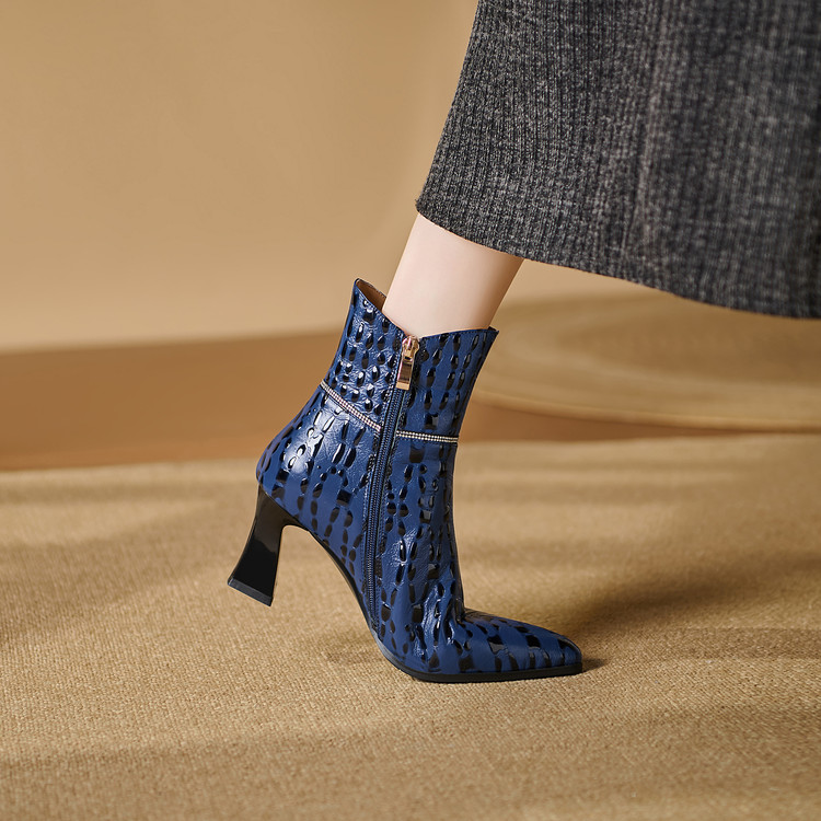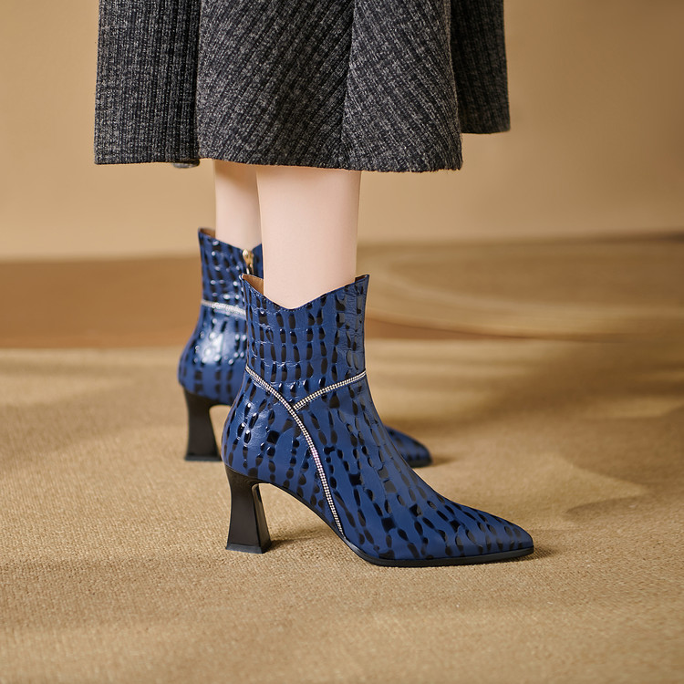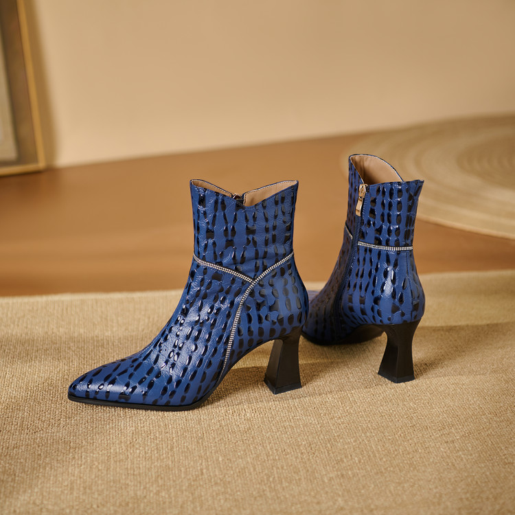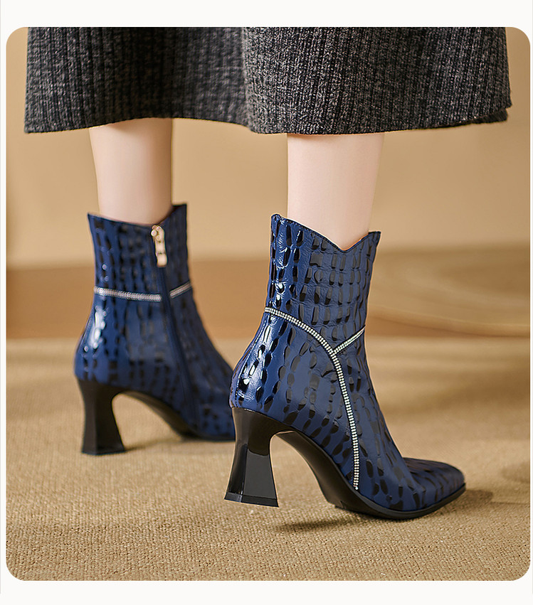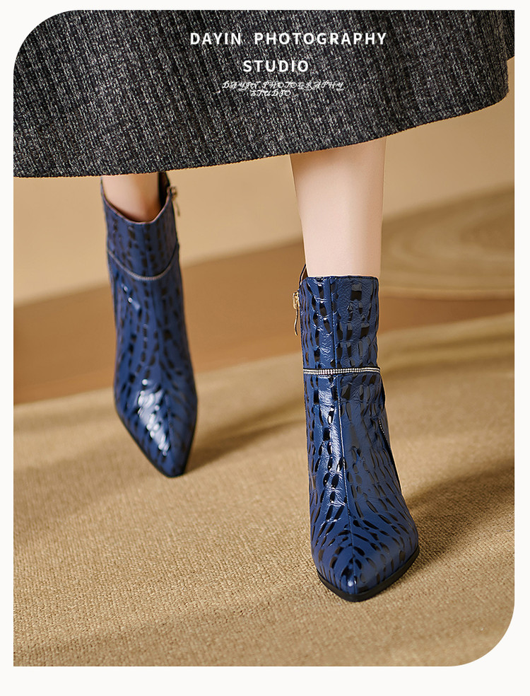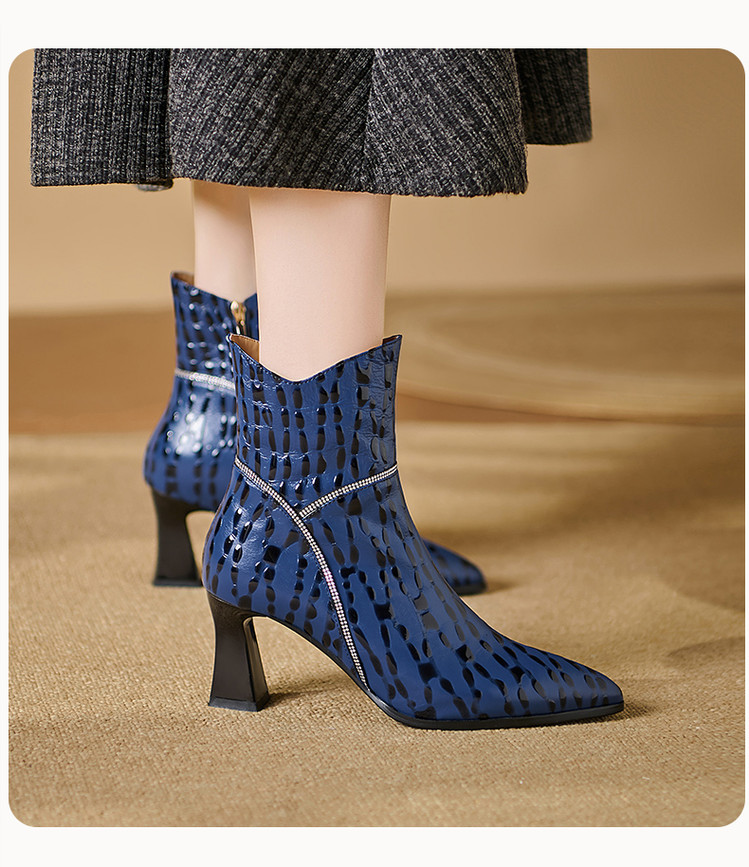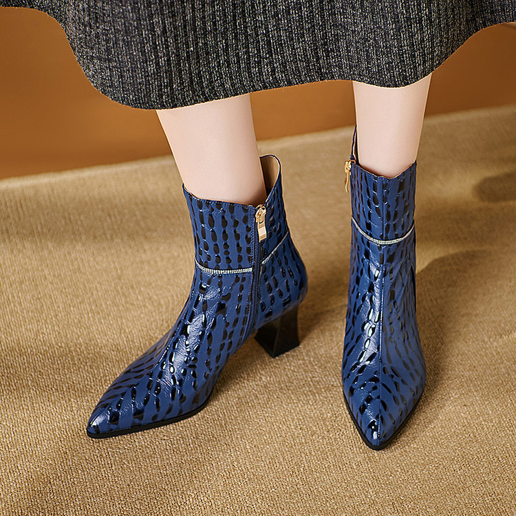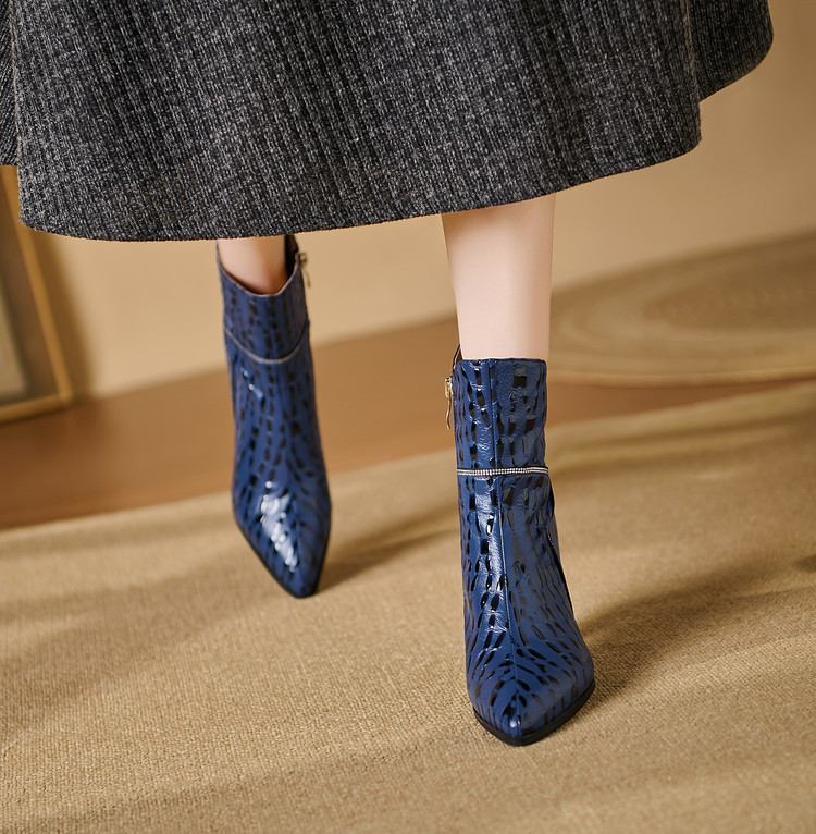 【预售5天】蓝色真皮短靴女士粗跟马丁靴秋冬新款加绒高跟时装靴百搭短筒皮鞋SY&608