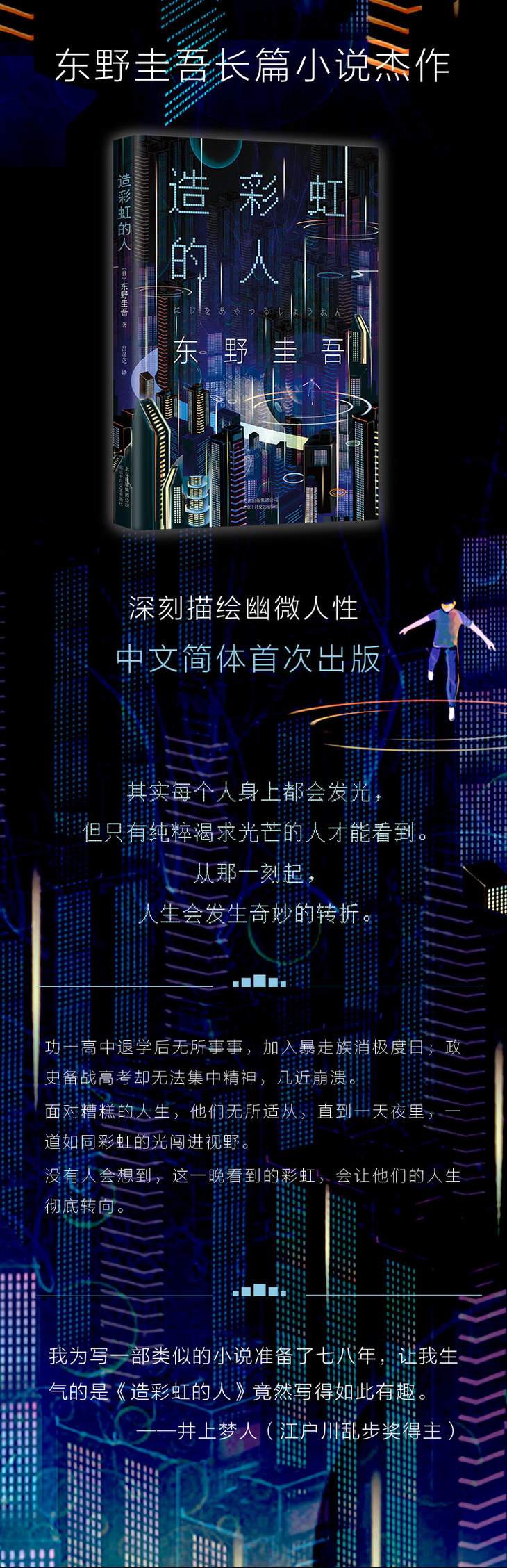 ★我一直想写一部类似《造彩虹的人》这样的小说,并准备了七八年。让我生气的是这本书竟然写得如此有趣。读完后那几天,我一直在筹划让东野圭吾从世界上消失。——井上梦人(江户川乱步奖得主)