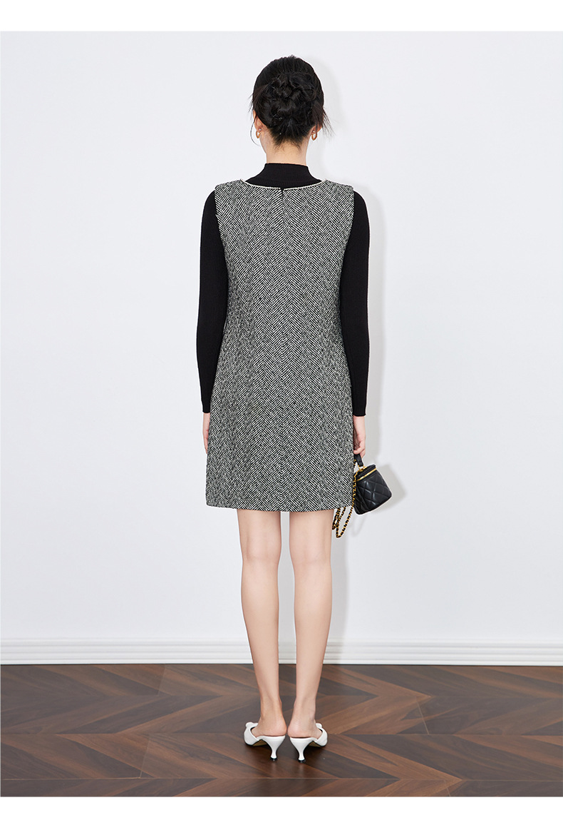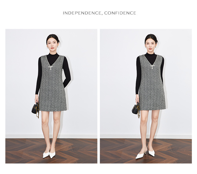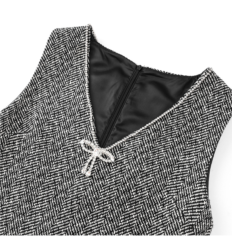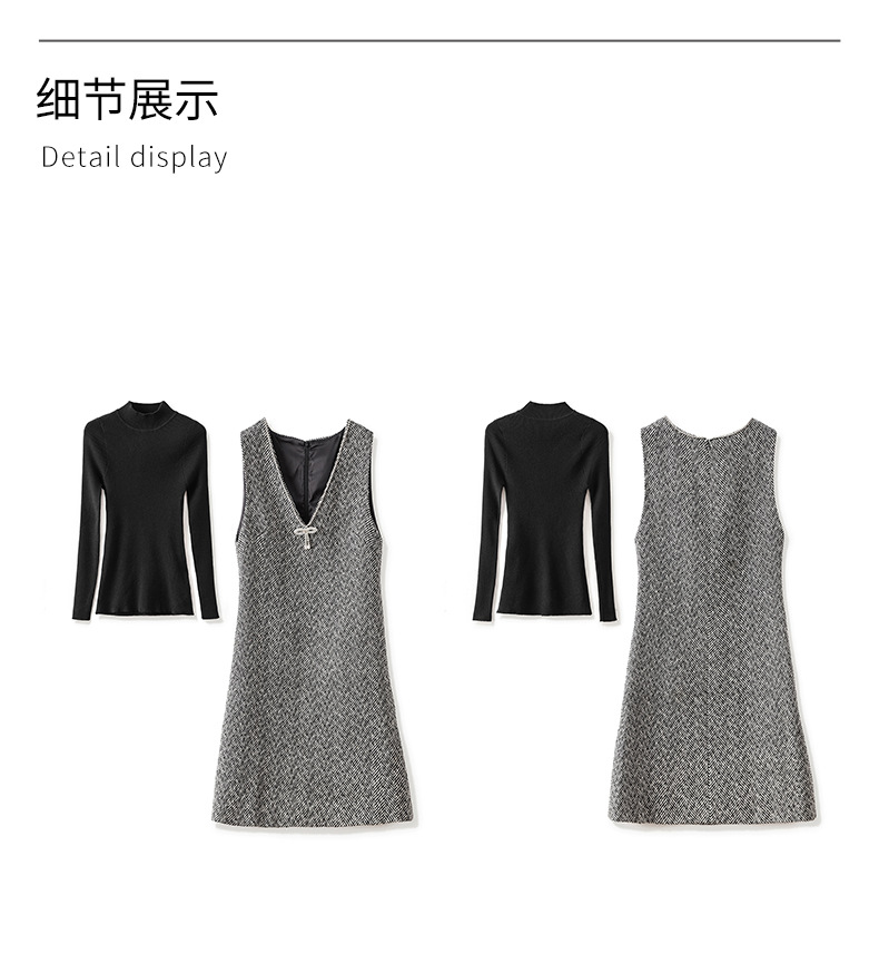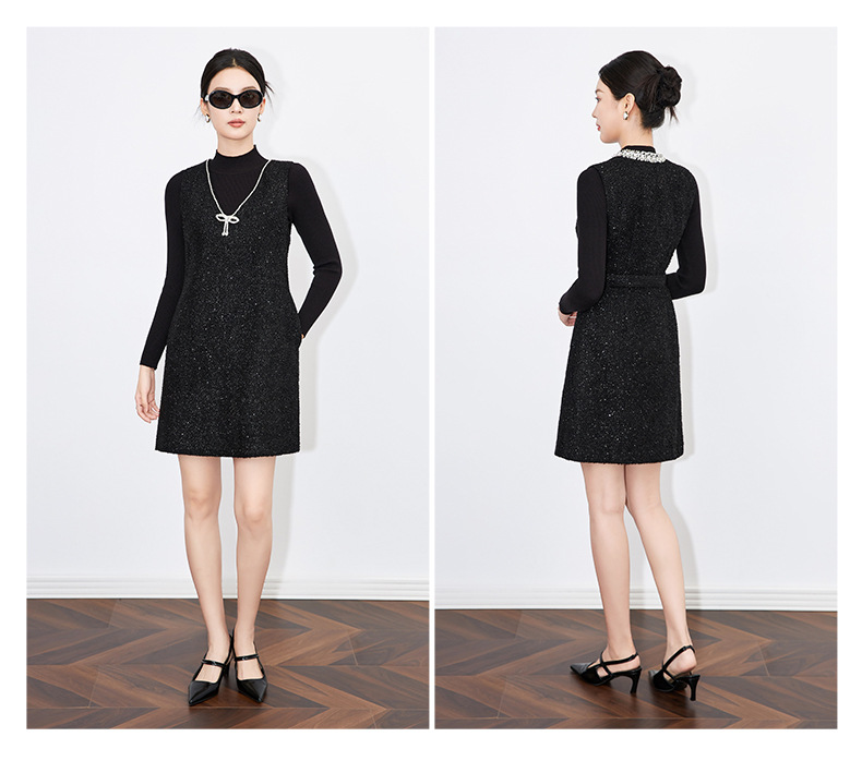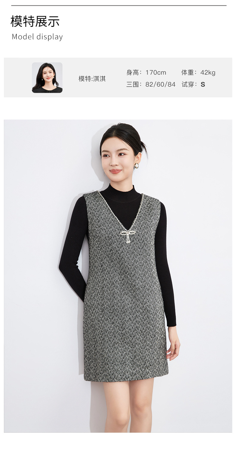 【高货wl】全新升级【铂金会员349/天猫469/差价120】(13144) 洛诗琳小香风V领钉钻无袖背心连衣裙针织打底衫两件套