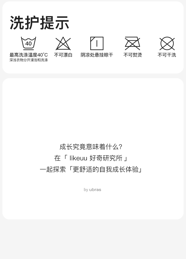 - likeuu是专注于为6~15岁的青少年创造柔软、无束缚的成长体验,以好奇心为灵感的成长发育期贴身衣物品牌。likeuu的产品覆盖内衣、内裤、保暖衣、家居服、运动等品类。