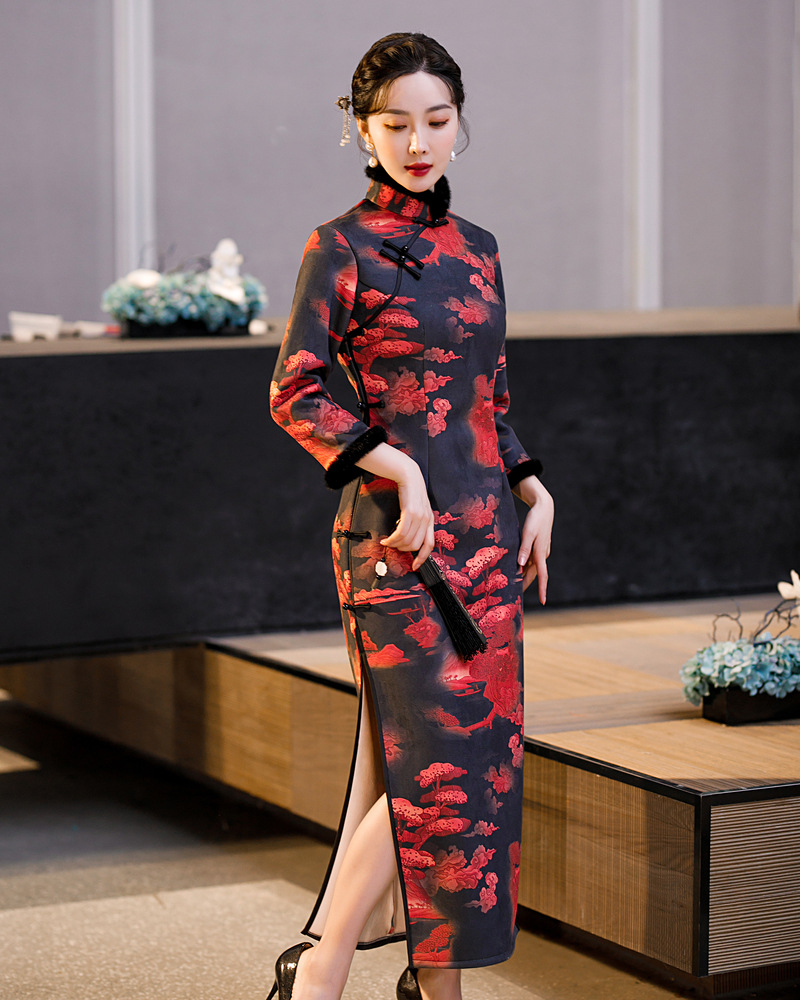 上海旗袍厂ZAYS-582冬季加绒加厚毛领日常改良妈妈装长款九分袖旗袍