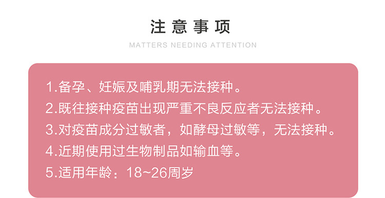 1、九价hpv疫苗适用年龄18~26岁男性,超年龄不可接种,备孕期无法接种。