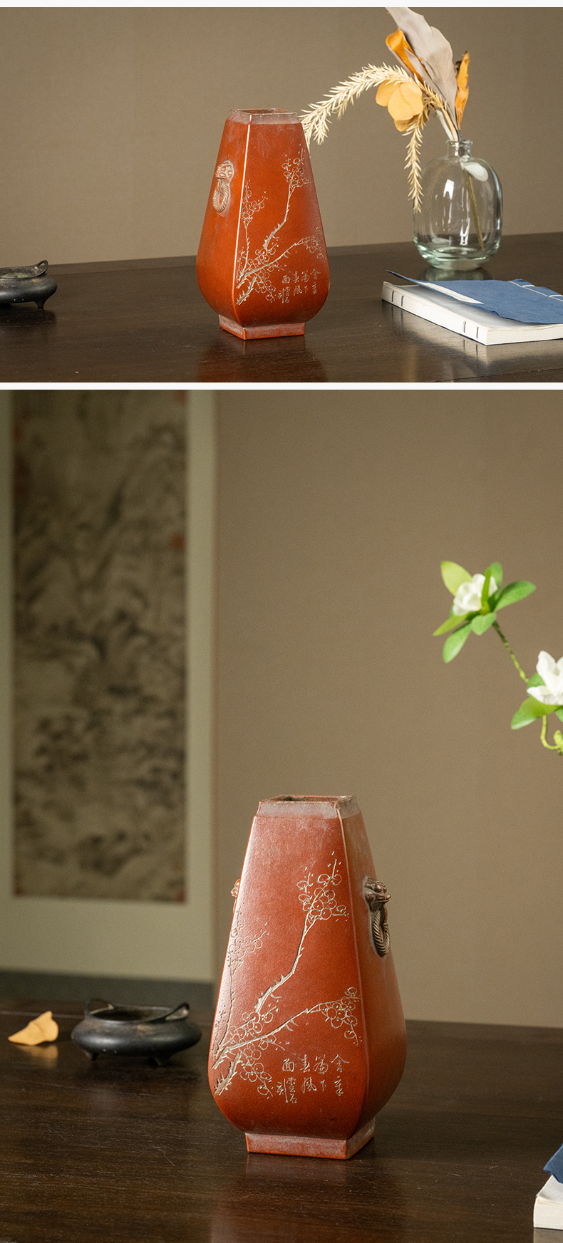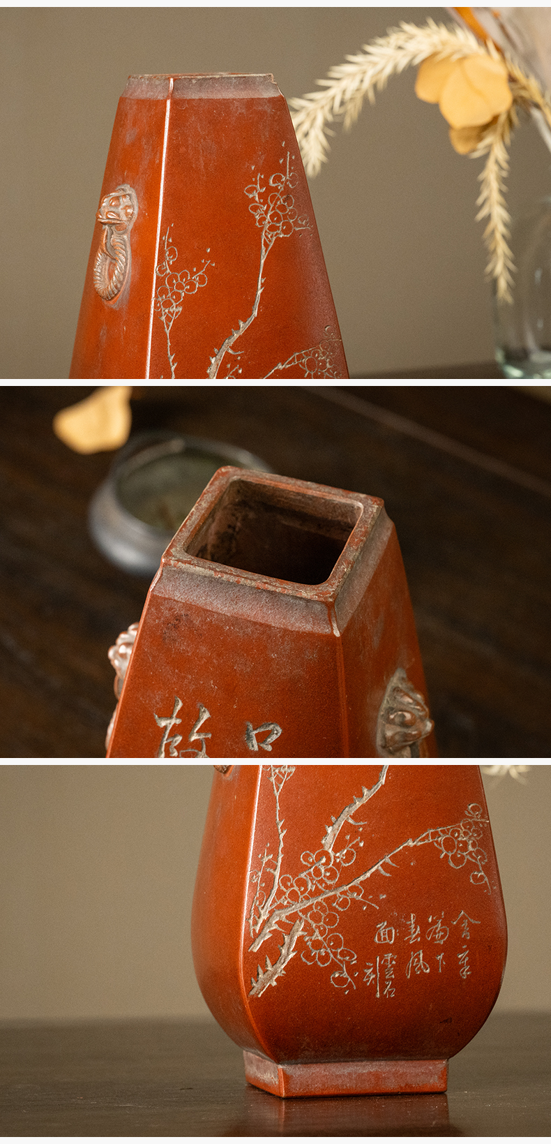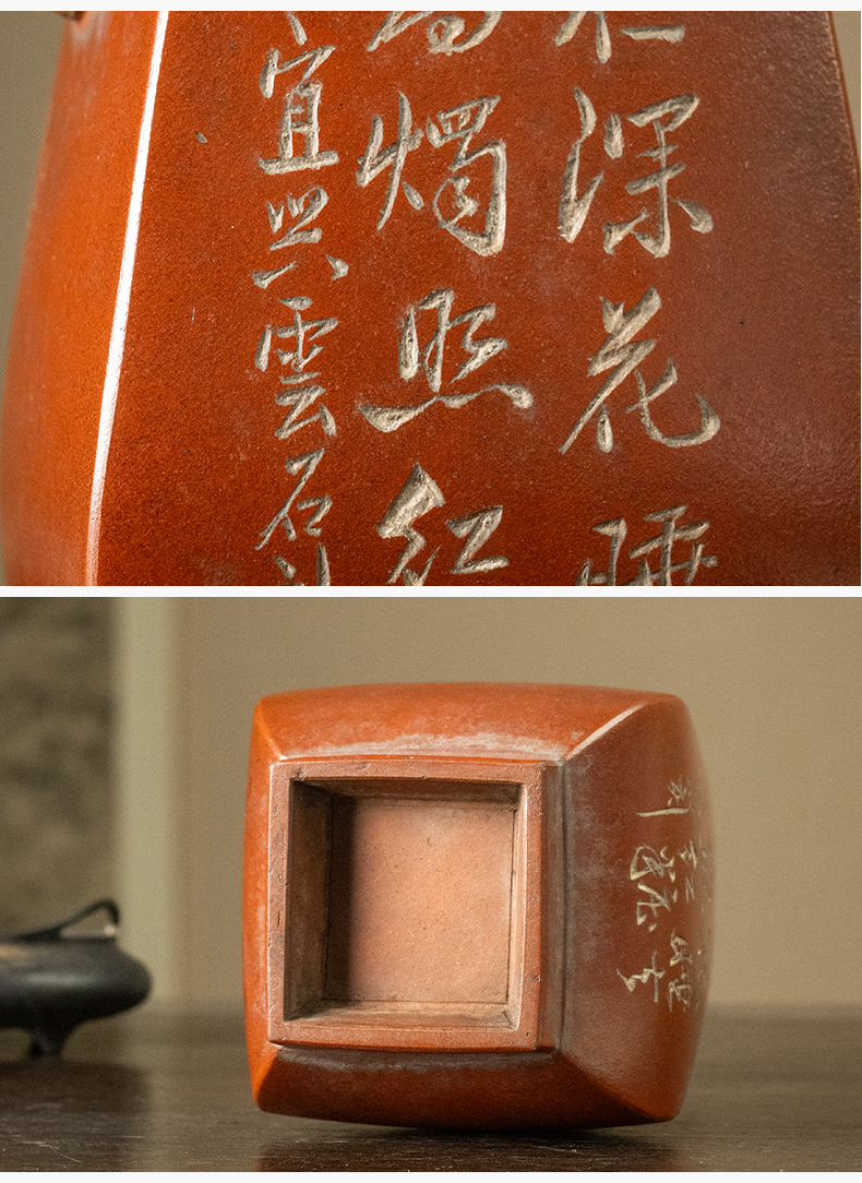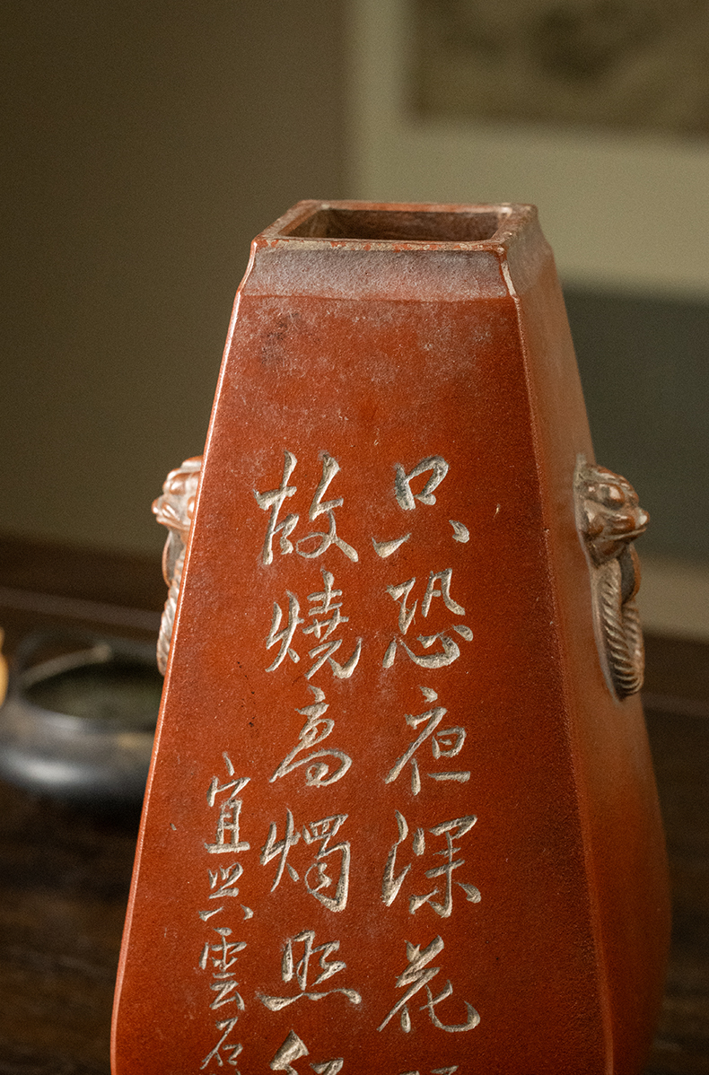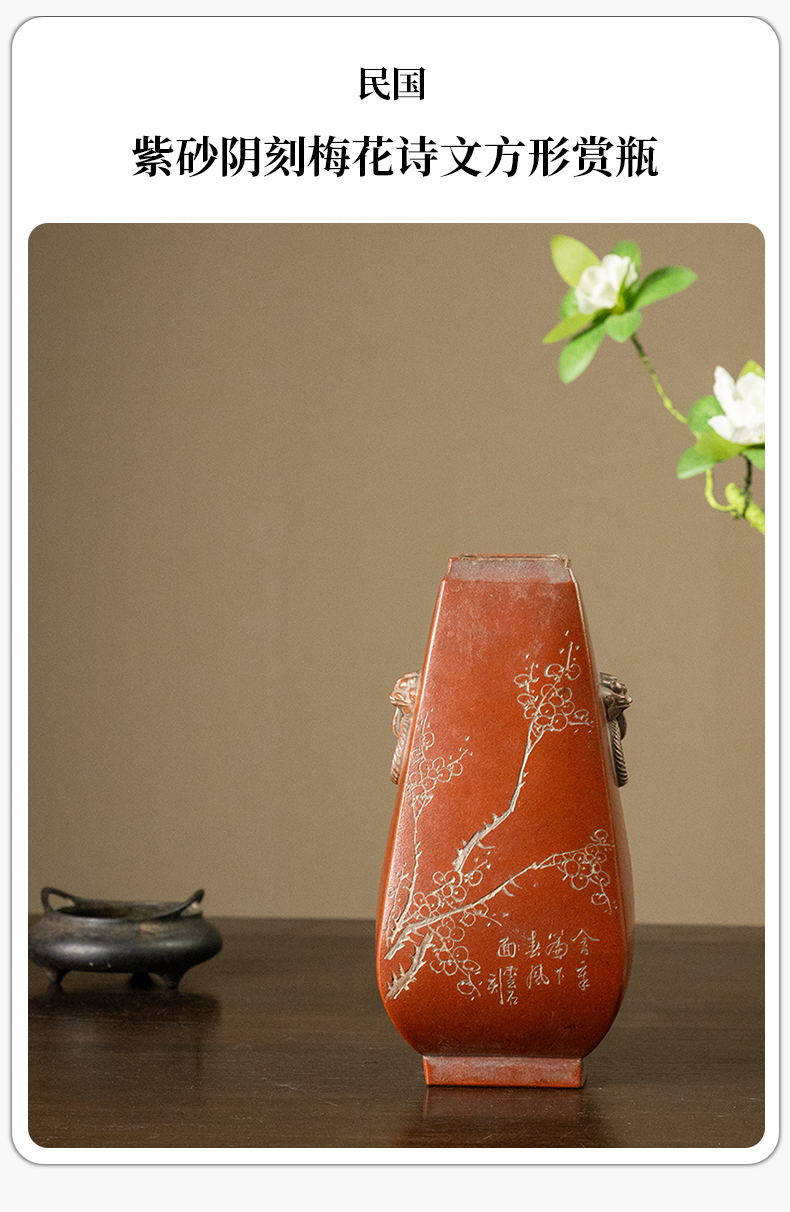 民国 紫砂阴刻梅花诗文方形赏瓶